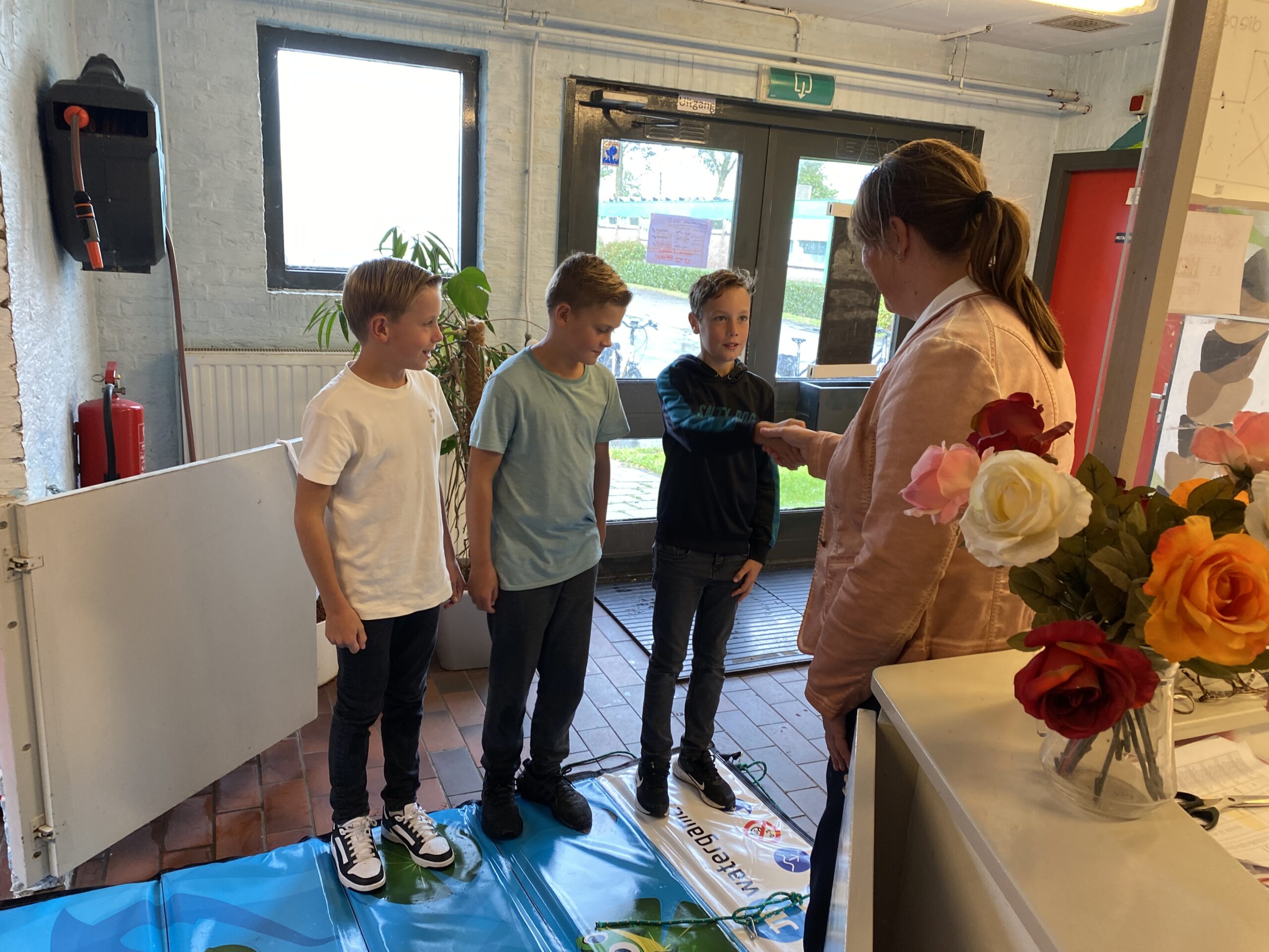 Jip, Sven en Daan zijn lid van de kindergemeenteraad in Zoeterwoude. Ze mochten beslissen hoe het bedrag van 1.500 euro, dat de gemeente beschikbaar stelde voor de feestelijke viering, besteed ging worden. Ze kozen voor de speelmat waarop verschillende kikkers en lelies afgebeeld staan. “Een soort hinkelen over het water”, legt Jip uit.