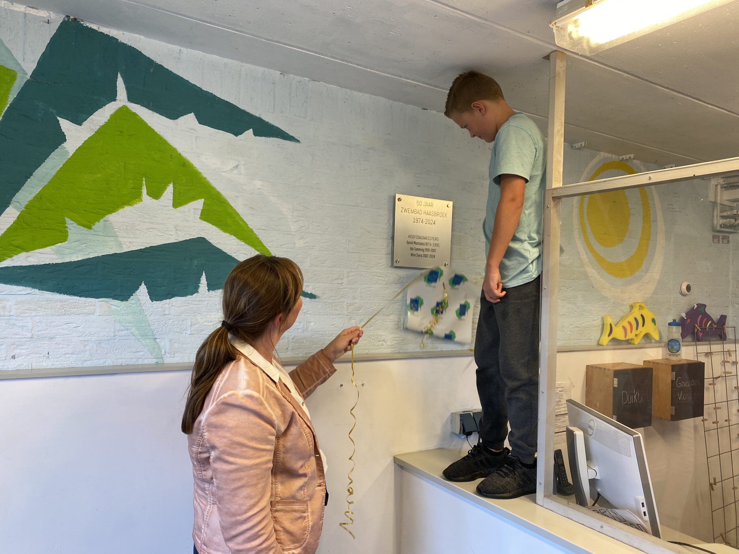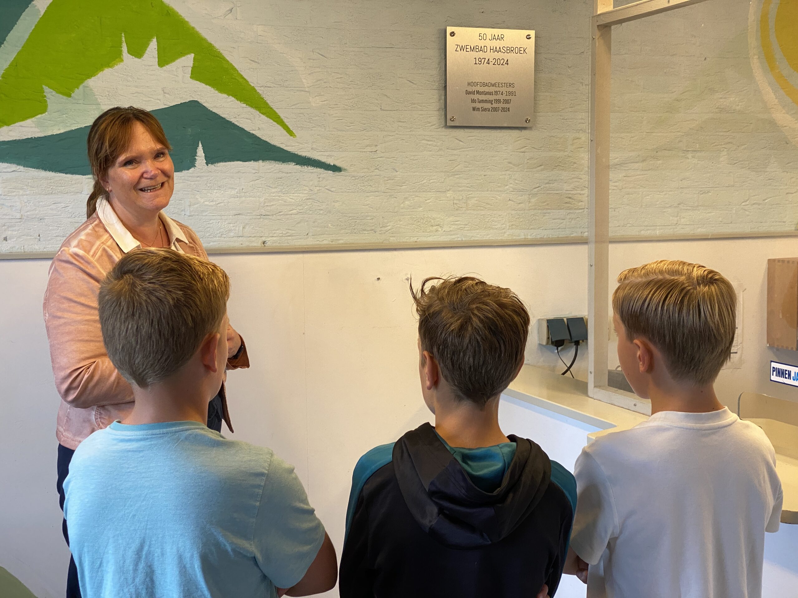 Het buitenbad van Zwembad Haasbroek is vijftig jaar oud. Dat heugelijke feit is deze week gevierd in kleine kring. Op de laatste dag dat het bad geopend was onthulden wethouder Angelique Beekhuizen, samen met enkele leden van kindergemeenteraad, een speciale plaquette bij de ingang van het zwembad. Daarna werd een speelmat uitgerold die de gemeente cadeau doet aan de zwemmers in het dorp.
