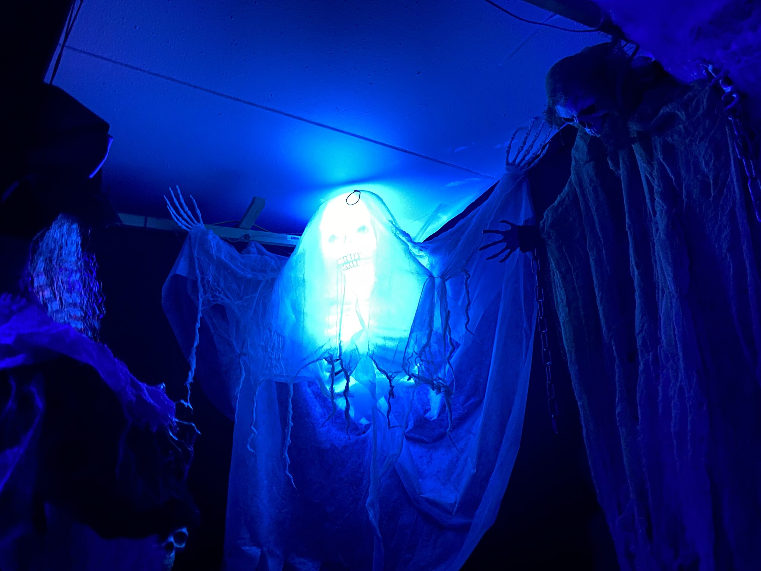 De entree is al angstaanjagend. Gigantische spinnen hangen aan het plafond en bewegen zich regelmatig op en neer. “Mooi, hè?”, klinkt het. Al jaren breidt Niels zijn verzameling uit, maar dit jaar is er iets extra speciaals aan toegevoegd. “We werken voor het eerst met luchtdruksystemen, waardoor sommige Halloween-spoken nu bewegen.”