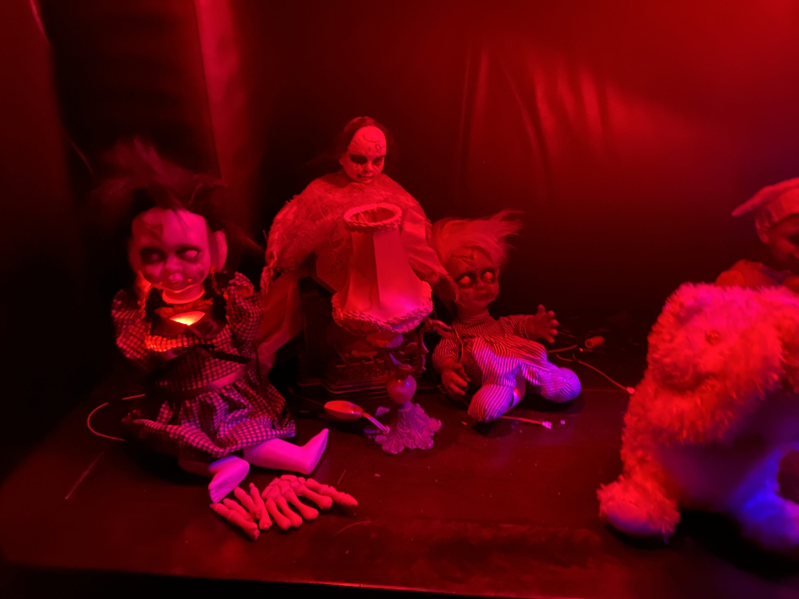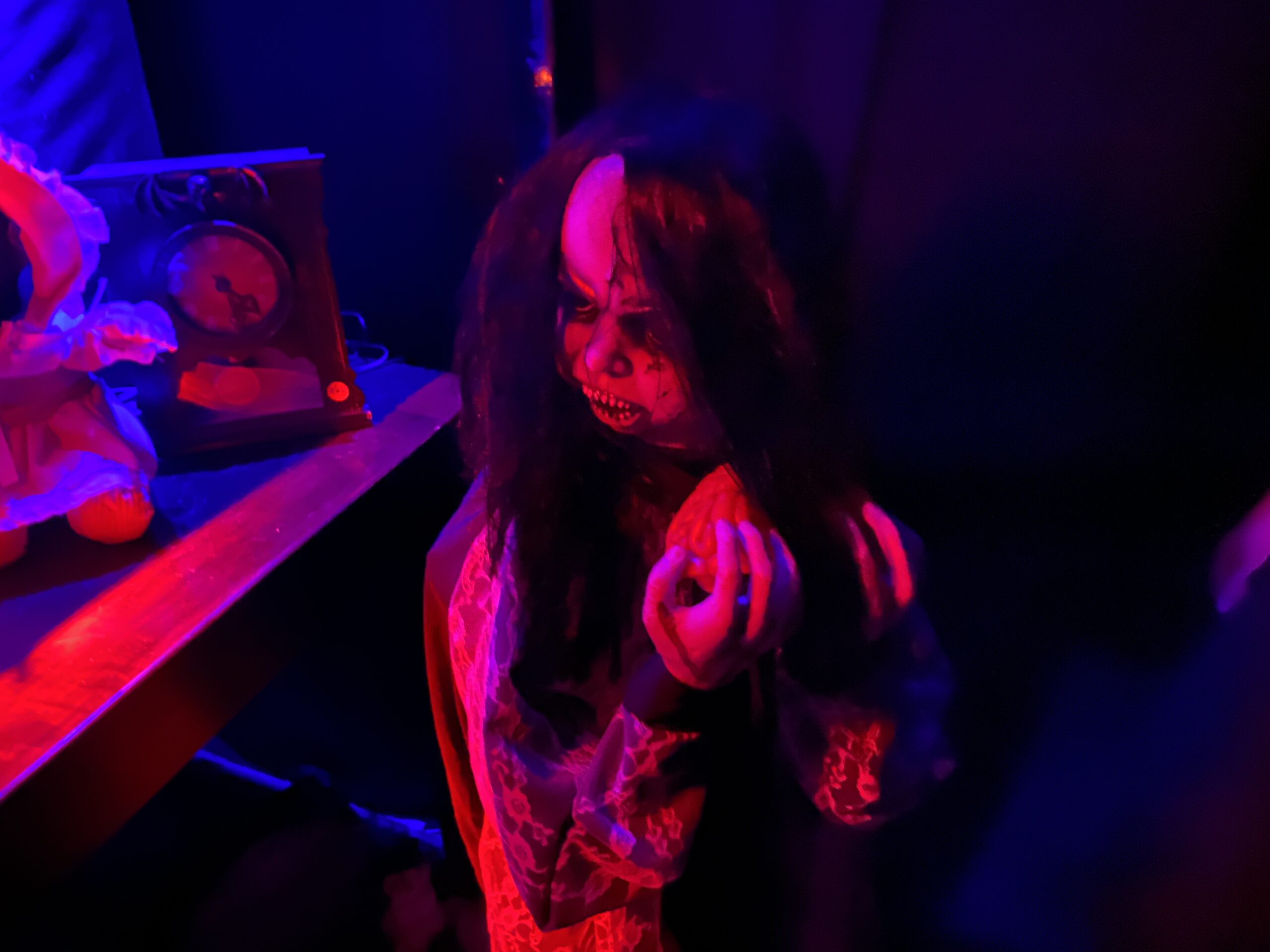 Het licht gaat uit. “Hier zie je allemaal bezeten poppetjes en teddyberen,” laat Niels zien. “Toch is dit echt mijn favoriet.” Niels drukt op een knopje. Een spook beweegt zich langzaam naar voren. “Dit is toch gaaf?” Tot nu toe is het erg druk in het horrorhuis van Niels: “Elke dag heb ik negen tijdsloten open en tot nu toe zijn er iedere dag wel zes gevuld.” Het spookhuis is tot midden november te bezoeken.