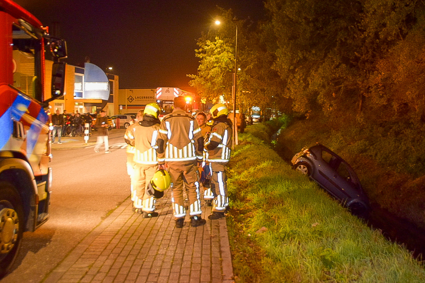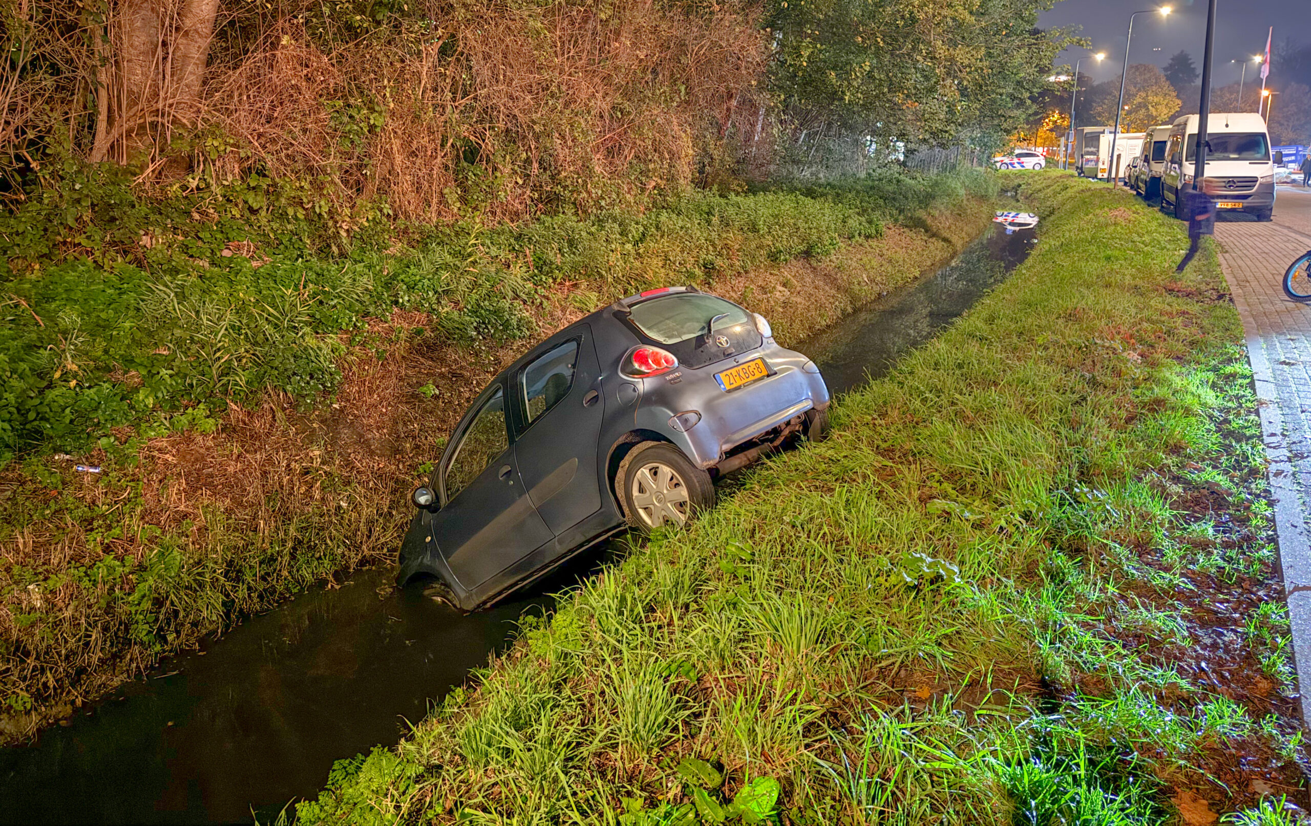 Een auto die geparkeerd stond voor een bedrijfspand aan de Kenauweg in Leiden is zondagavond de naastgelegen sloot ingerold. De eigenaar was vergeten om de auto op de handrem te zetten.