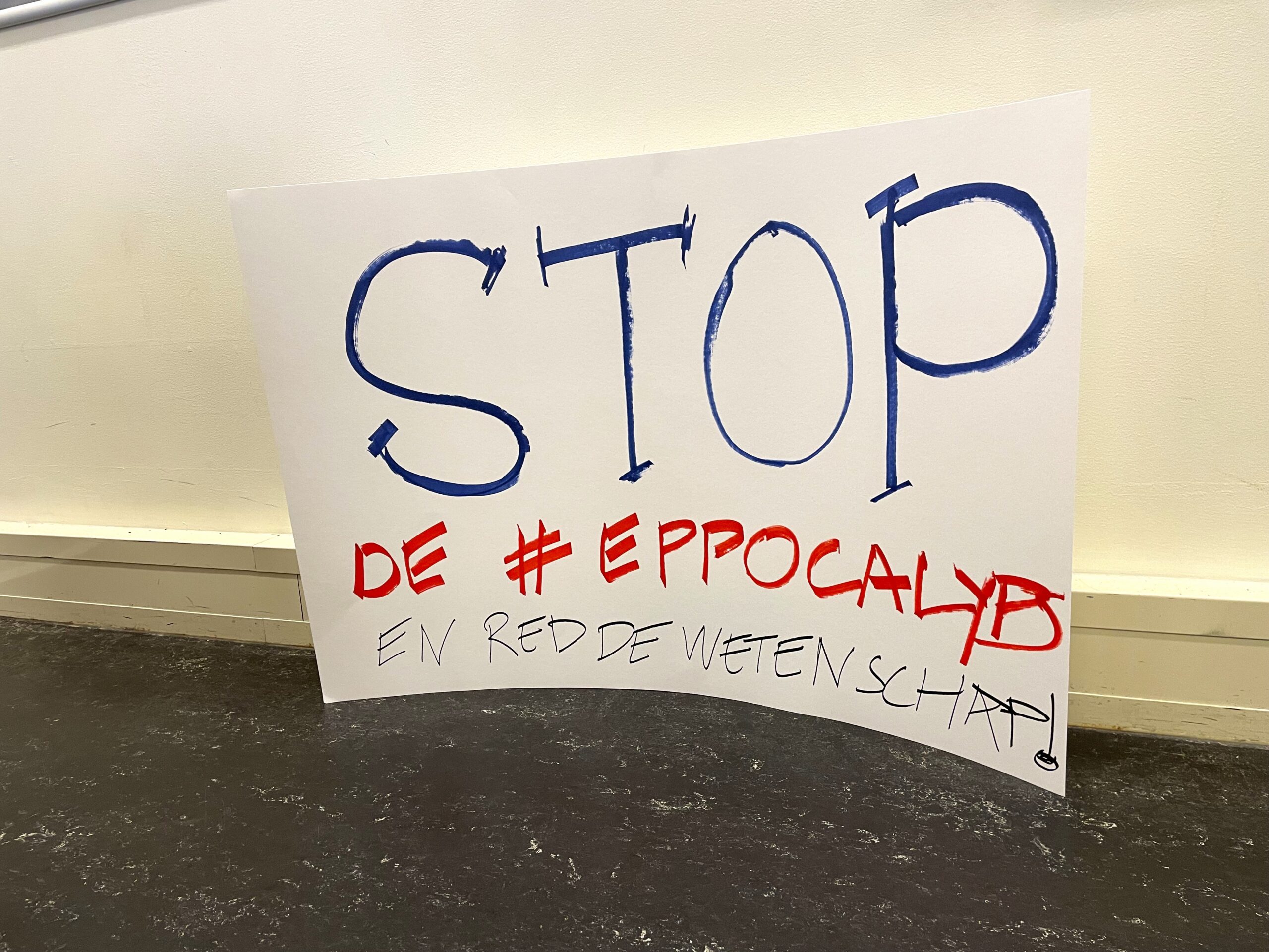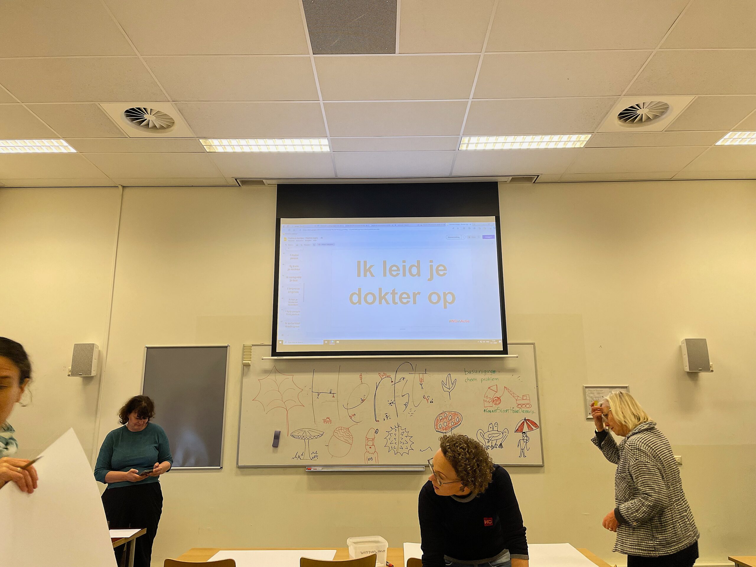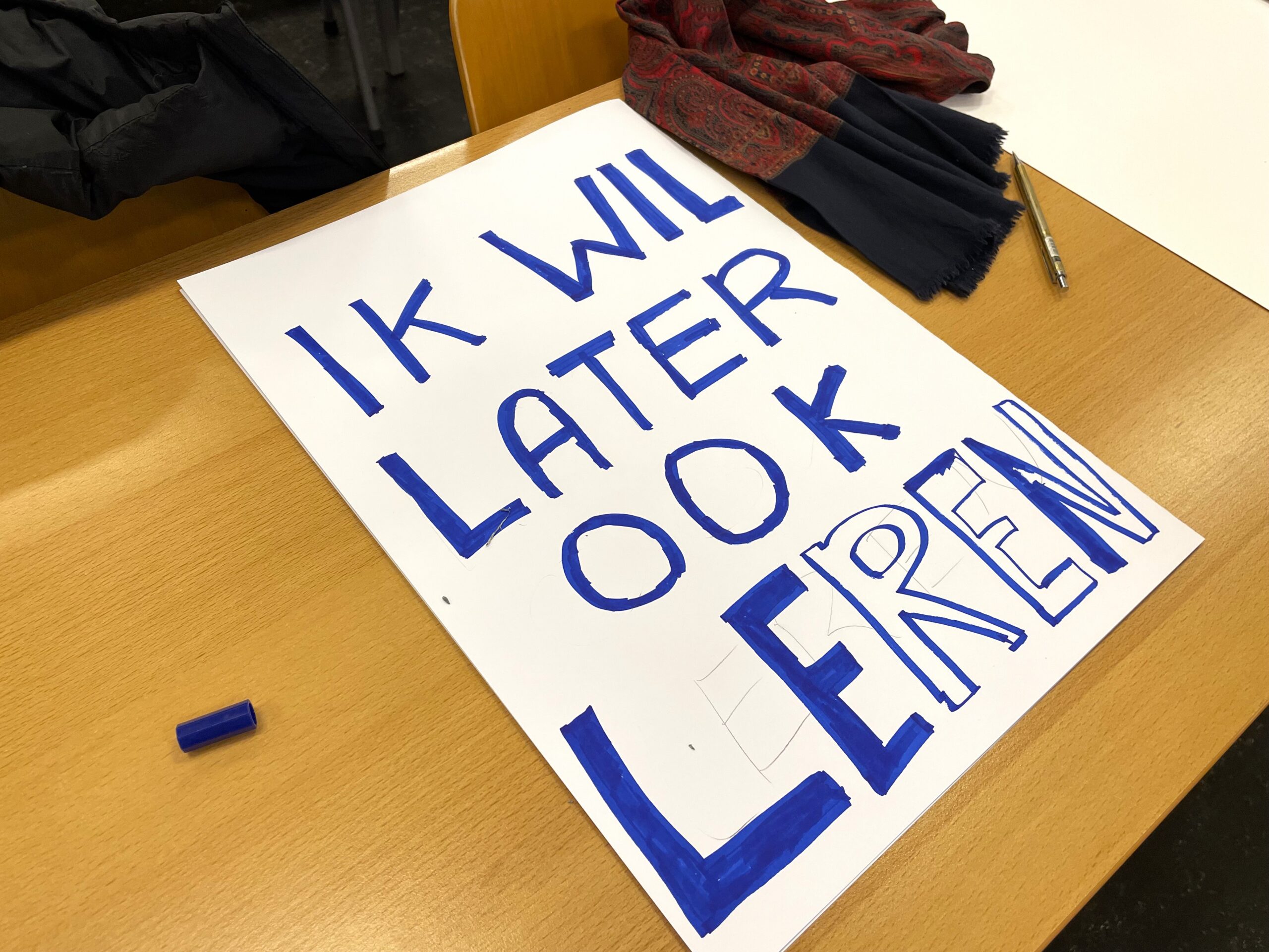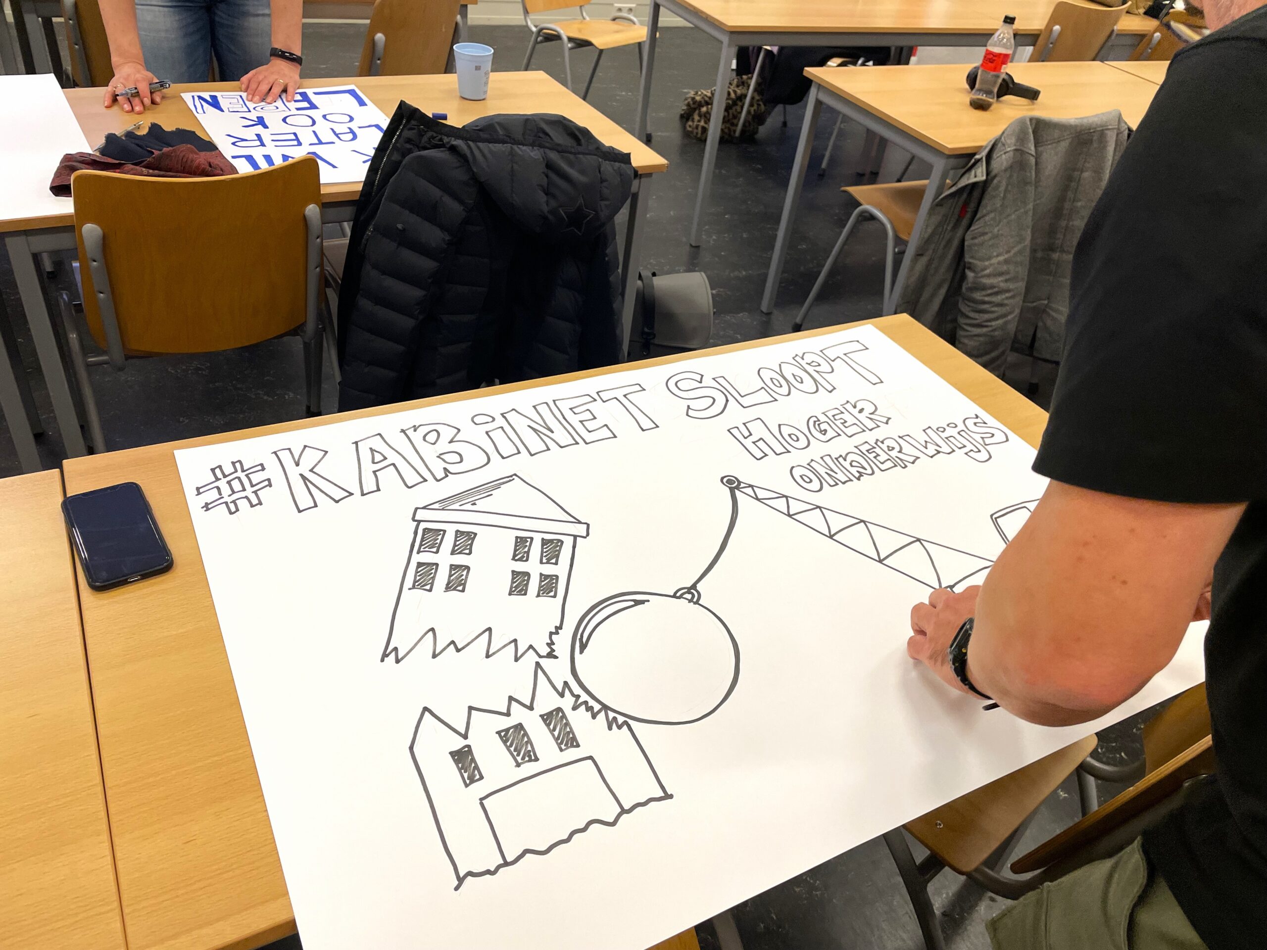 In een lokaal in het Lipsius, het gebouw van de geesteswetenschappenfaculteit, hebben zich enkele docenten verzameld. Ze zijn druk in de weer met potloden en stiften en brainstormen ondertussen over potentiële slogans voor op de protestborden. “Ik leid je dokter op”, staat er op het smartboard; de sfeer in het lokaal is vastberaden.
