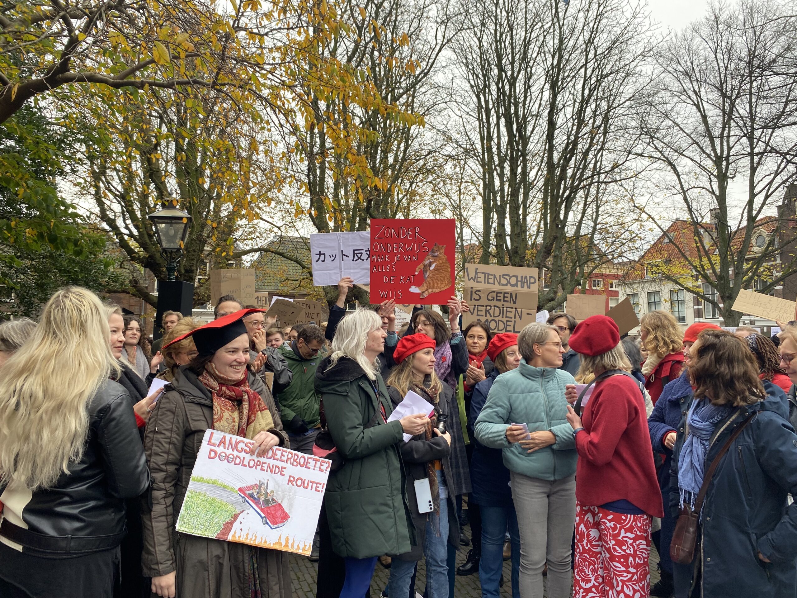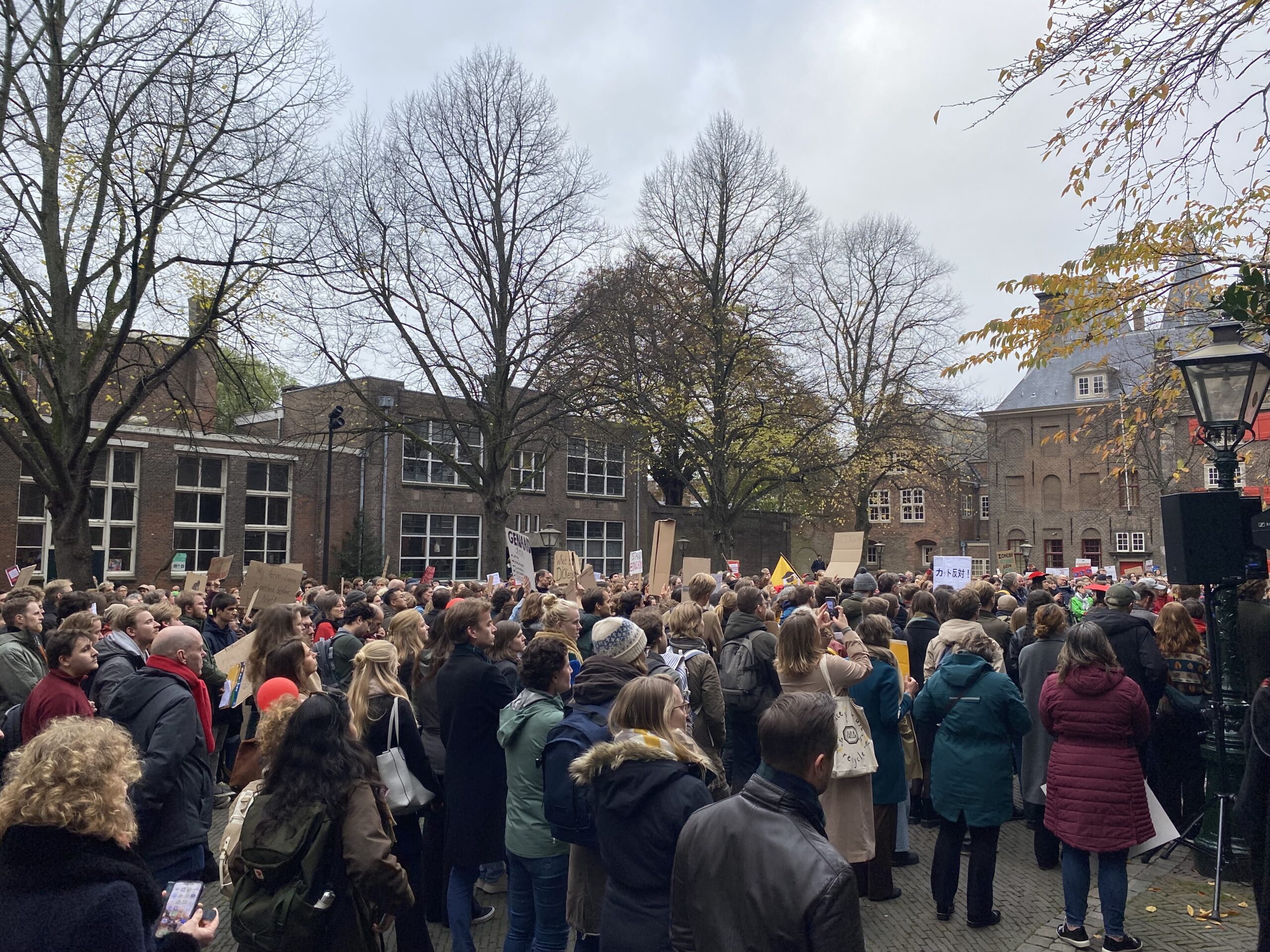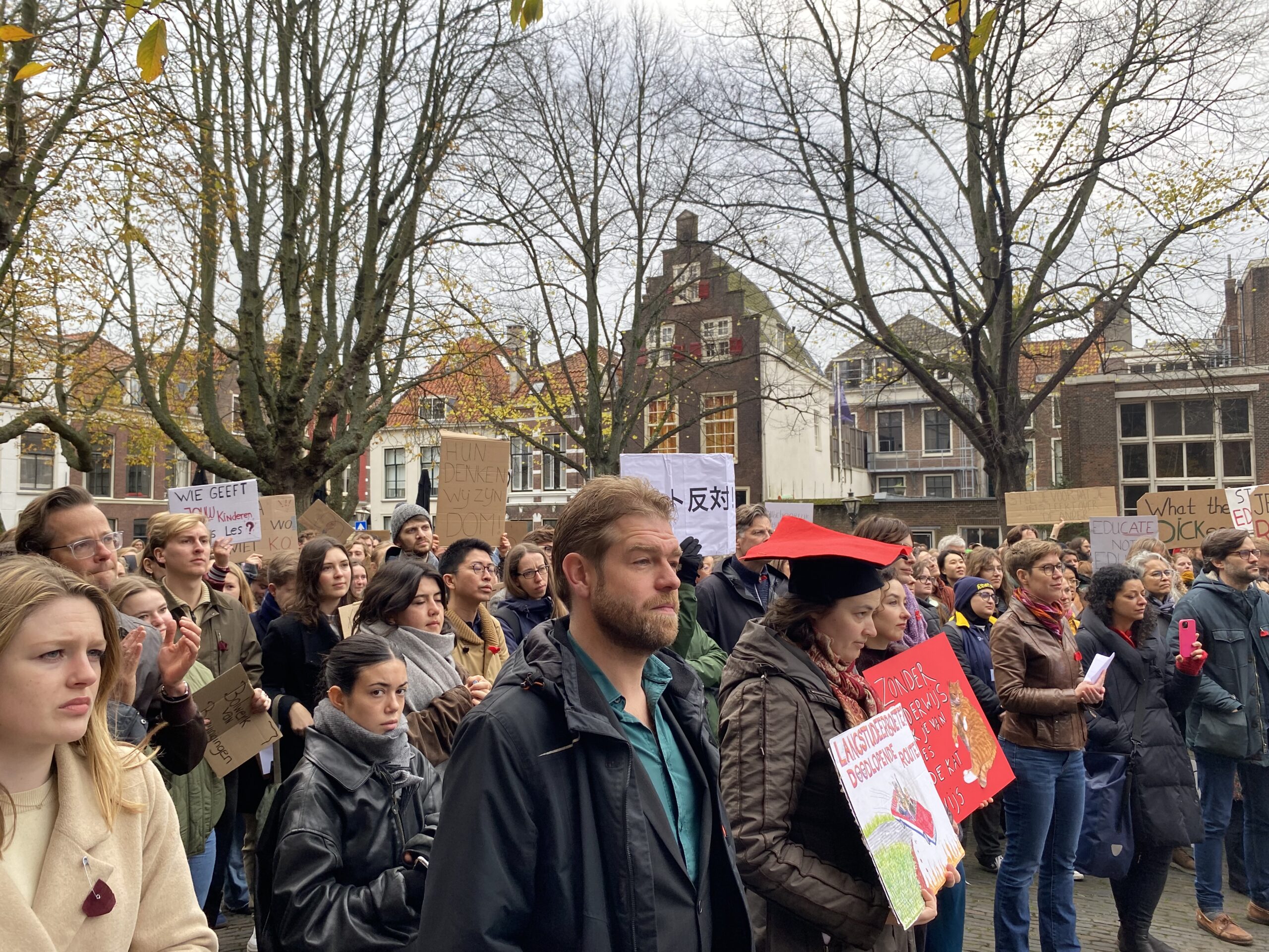 Zo’n drie- tot vierhonderd studenten demonstreren donderdagmiddag in Leiden tegen de voorgenomen bezuinigingen van het kabinet in het hoger en universitair onderwijs. Dat deden ze als alternatief voor de geplande landelijk demonstratie die voor donderdag in Utrecht stond gepland, maar werd afgelast. Volgens de autoriteiten in Utrecht was er sprake van ‘dreiging’ vanuit pro-Palestijnse demonstrantengroepen.