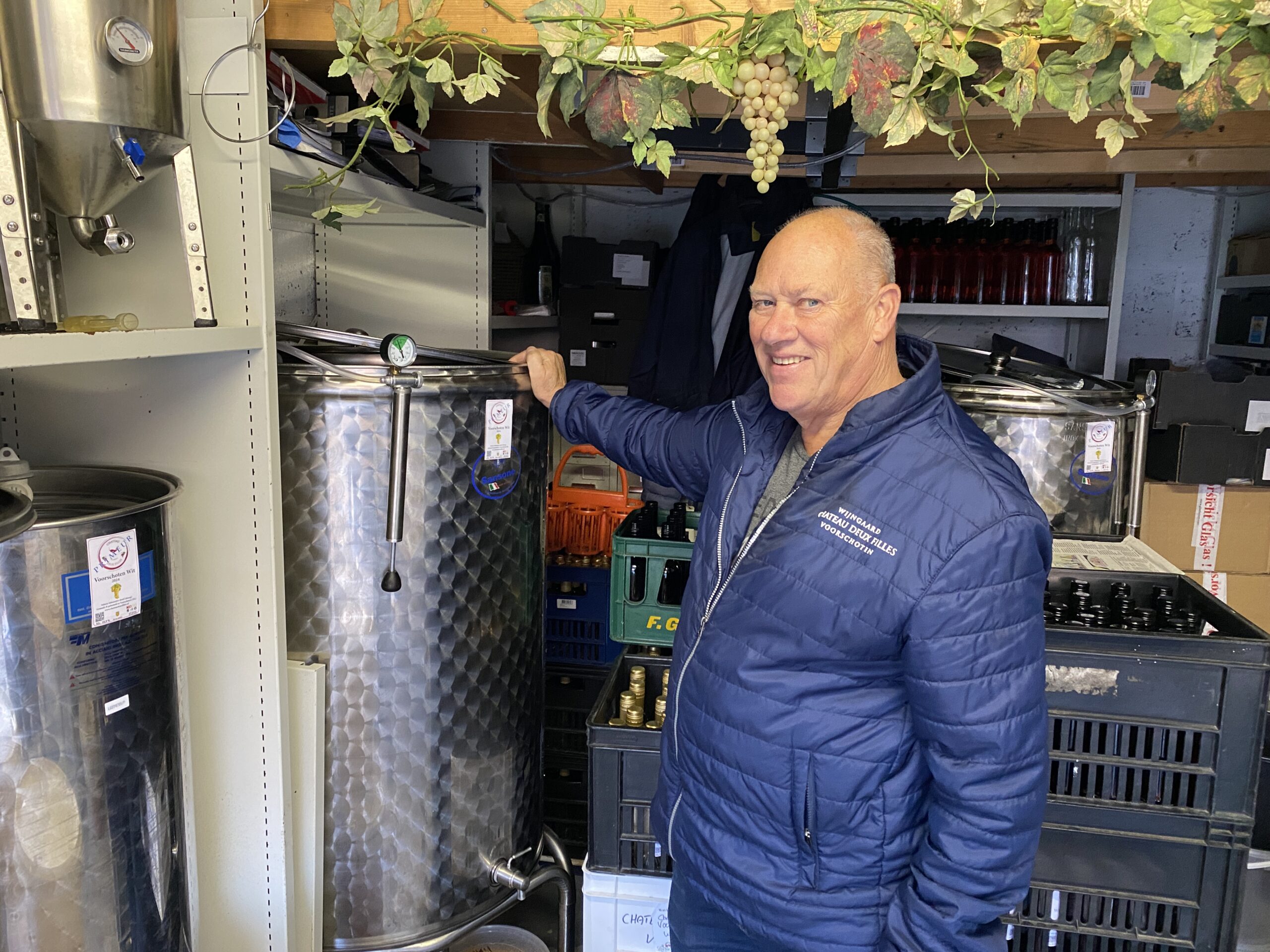 Sinds het begin van zijn carrière als wijnmaker is de kwaliteit van zijn wijn flink vooruitgegaan, vertelt hij. Zo heeft hij geïnvesteerd in roestvrijstalen vaten, waarin ook deze witte wijn is gemaakt. ‘het is een hele mooie witte wijn, van een hoge kwaliteit. Dat je niet zou zeggen “wordt dit nou in Voorschoten gemaakt?” Nu is de eerste fles van de witte wijn bijna klaar.