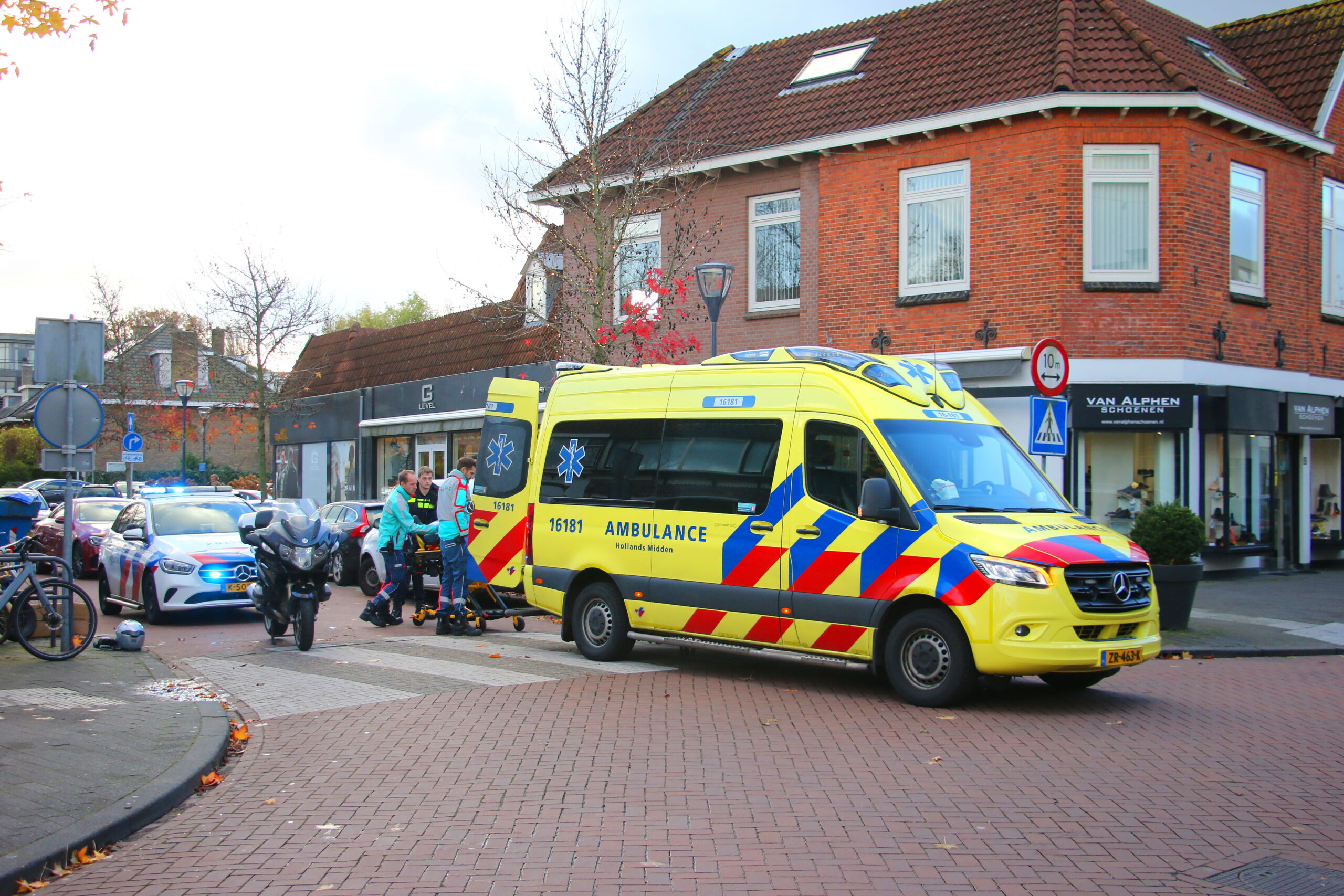 De motorrijder is door ambulancepersoneel nagekeken en daarna vervoerd naar het ziekenhuis in Leiden. Het ongeluk vond plaats op de kruising De Kempenaerstraat – Terweeweg in Oegstgeest.