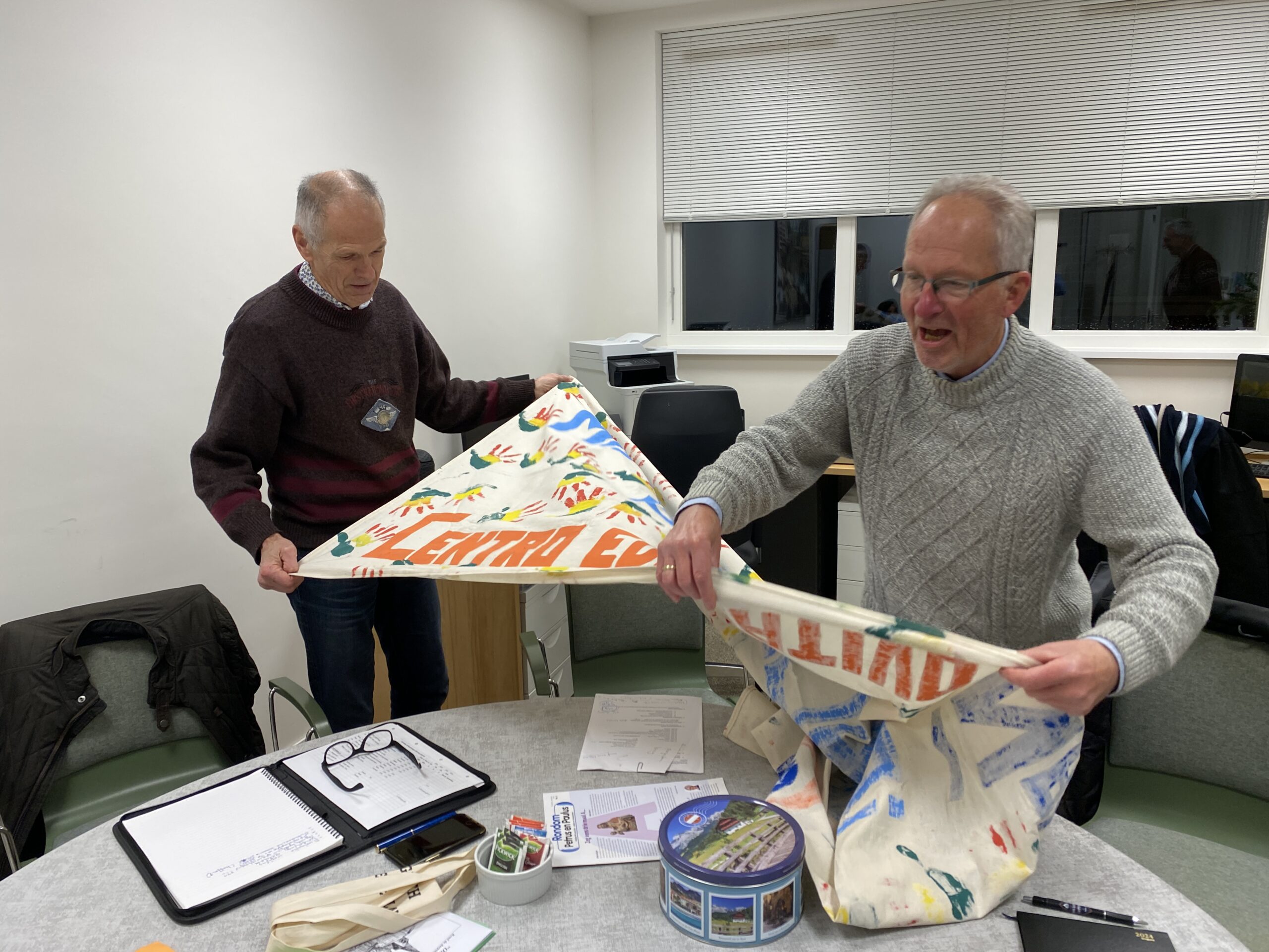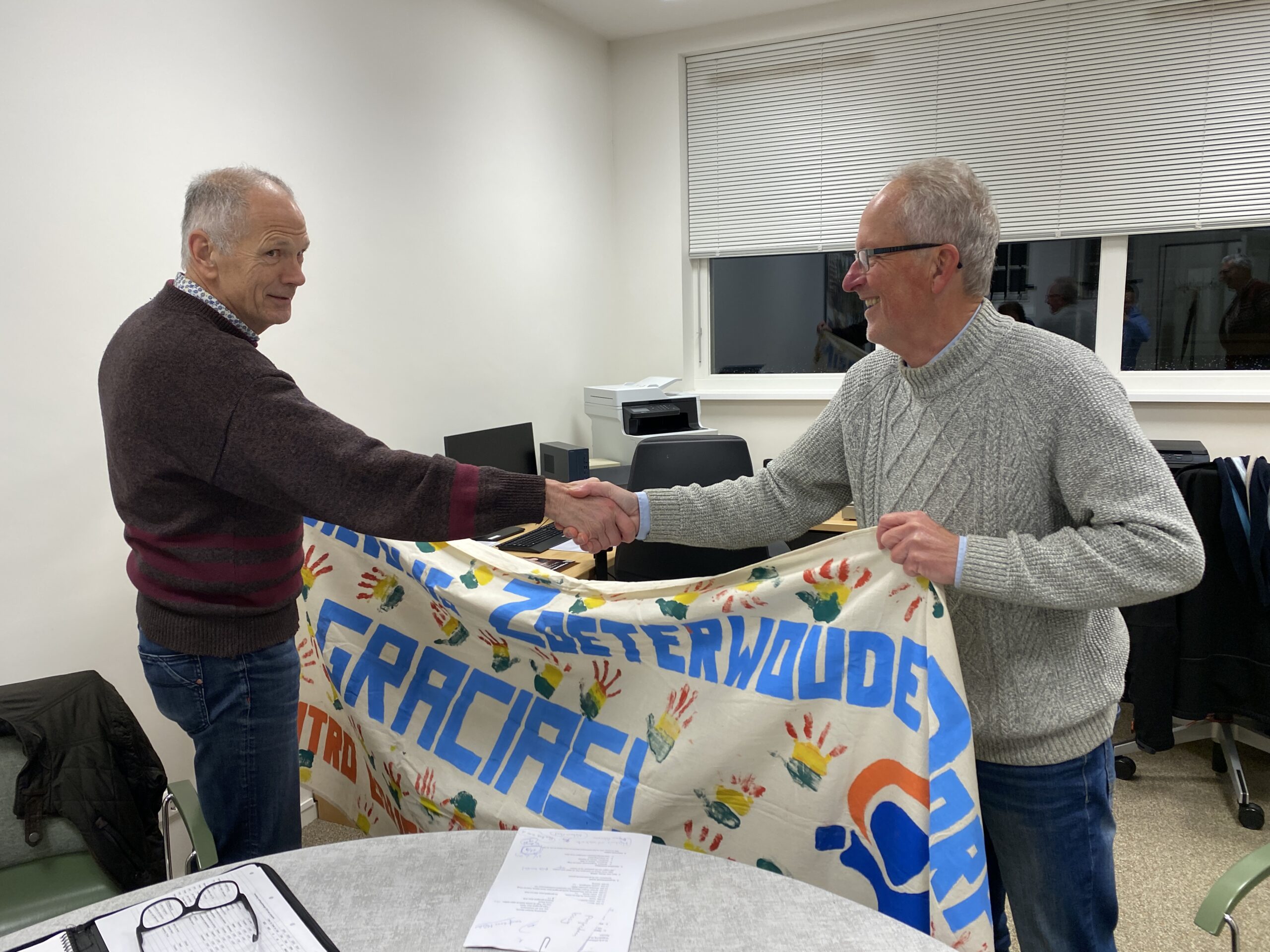 Tijdens de laatste vergadering van de werkgroep heeft Rozenboom het teruggevonden spandoek, inmiddels ‘zonder missie’, alsnog overhandigd aan Kortekaas. “Niet in de rol van voorzitter, maar ik ben ook penningmeester bij de stichting Oud Zoeterwoude. Daar gaan we hem opslaan en wie weet komt er een mooie tentoonstelling over vijftig jaar Veiling met een Missie”, hint Kortekaas.