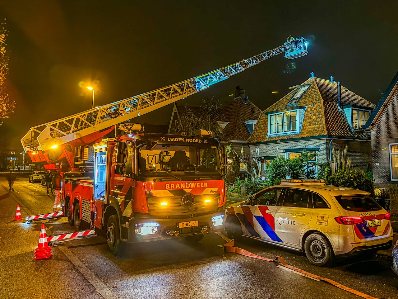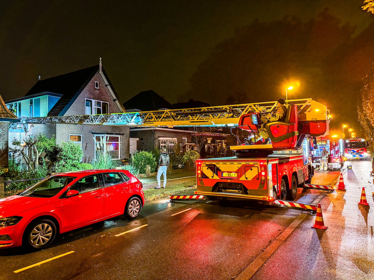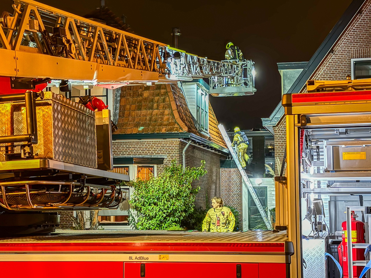 De brand had zich via de houten vloer op de eerste etage verspreid en er kwam inmiddels rook onder de dakpannen vandaan. Daardoor werd er opgeschaald naar middelbrand.