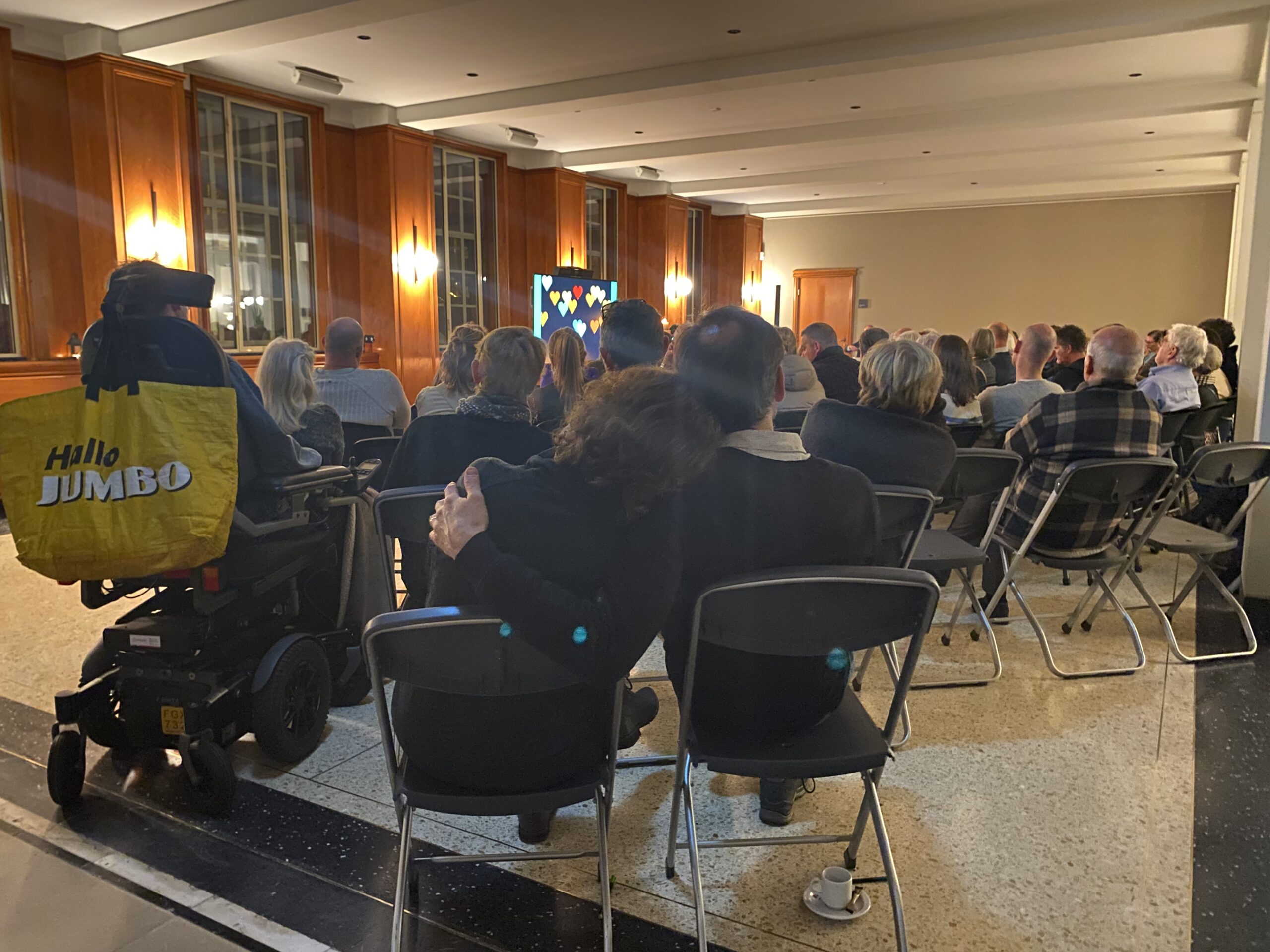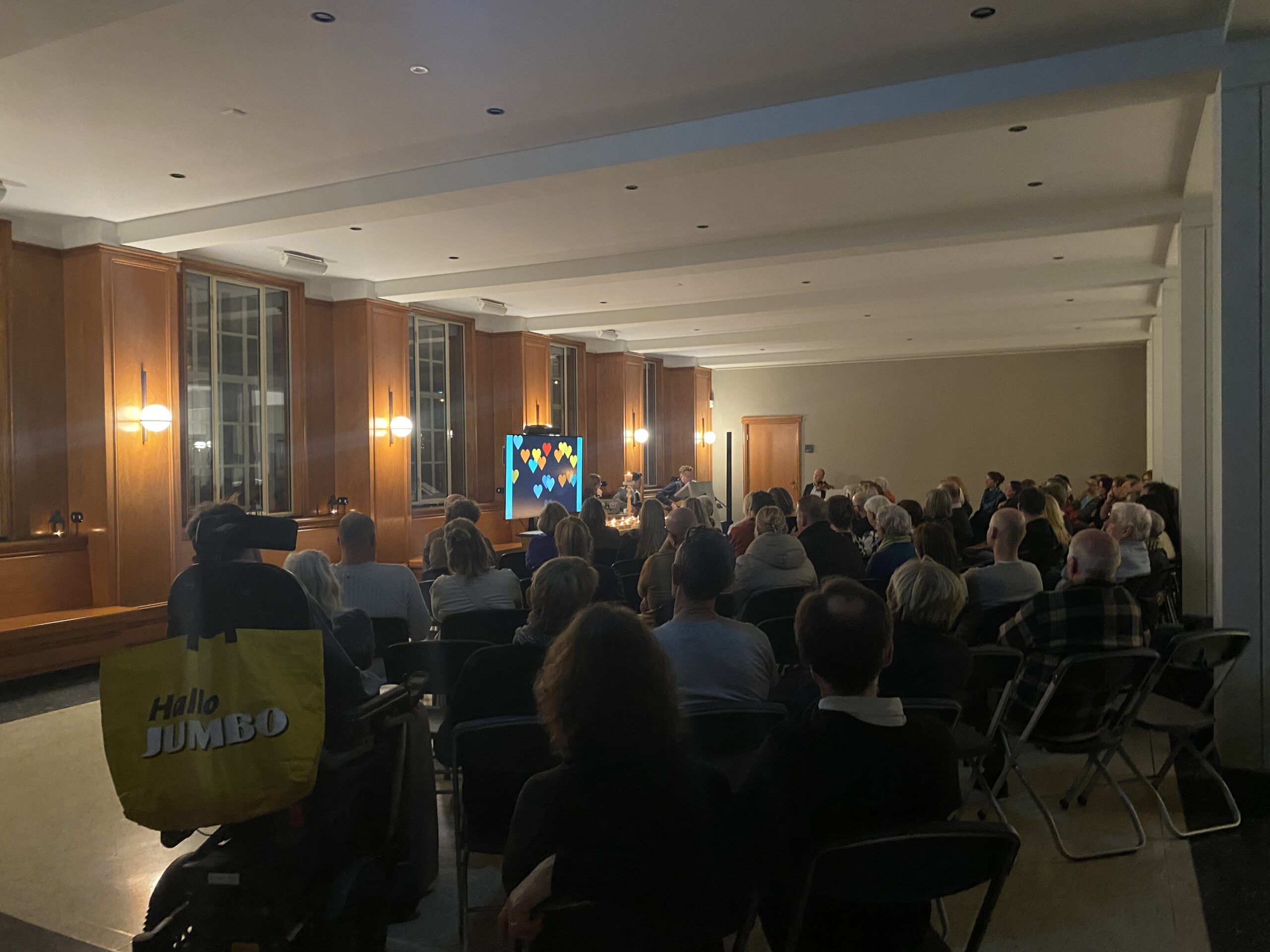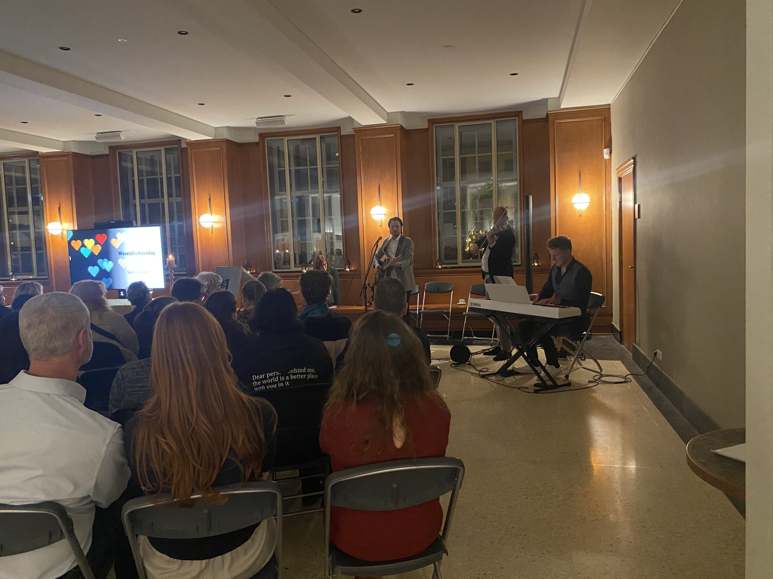 Leidse zangeres Emma Brown zingt een lied. Ook stadsdichter Zoey van der Kerkhof spreekt de ouders toe: “Jij liet me zien wat liefde is,” begint ze. In de stadsfoyer kun je een speld horen vallen. Mensen omhelzen elkaar en barsten in huilen uit.