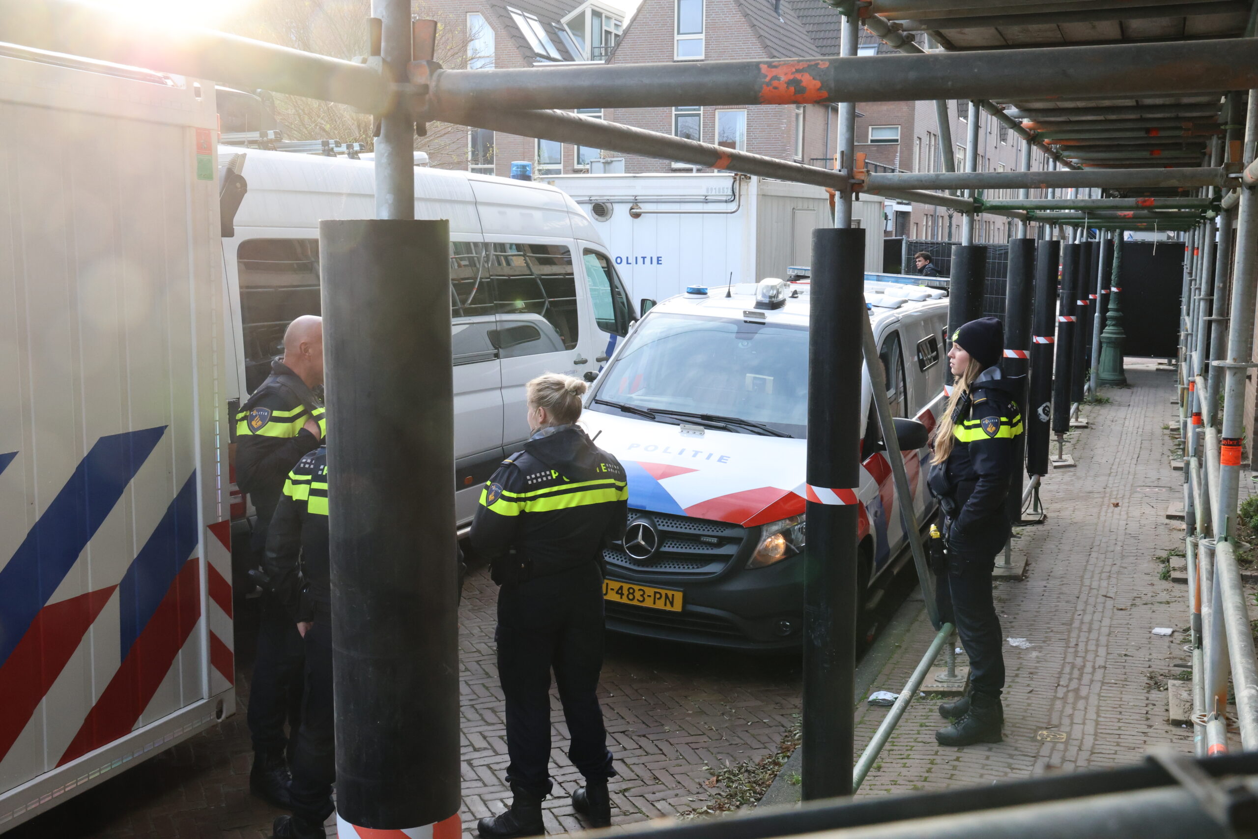 Het gebied rond de Korte Langestraat en het Waardkerkplein in Leiden is dinsdagochtend afgezet door de politie. Zwarte schermen moeten de reconstructie afschermen die er door specialisten van de Forensische Opsporing wordt uitgevoerd. Op 6 juni kwam de 38-jarige bewoner van een huis in de Korte Langestraat om het leven tijdens een misdrijf.