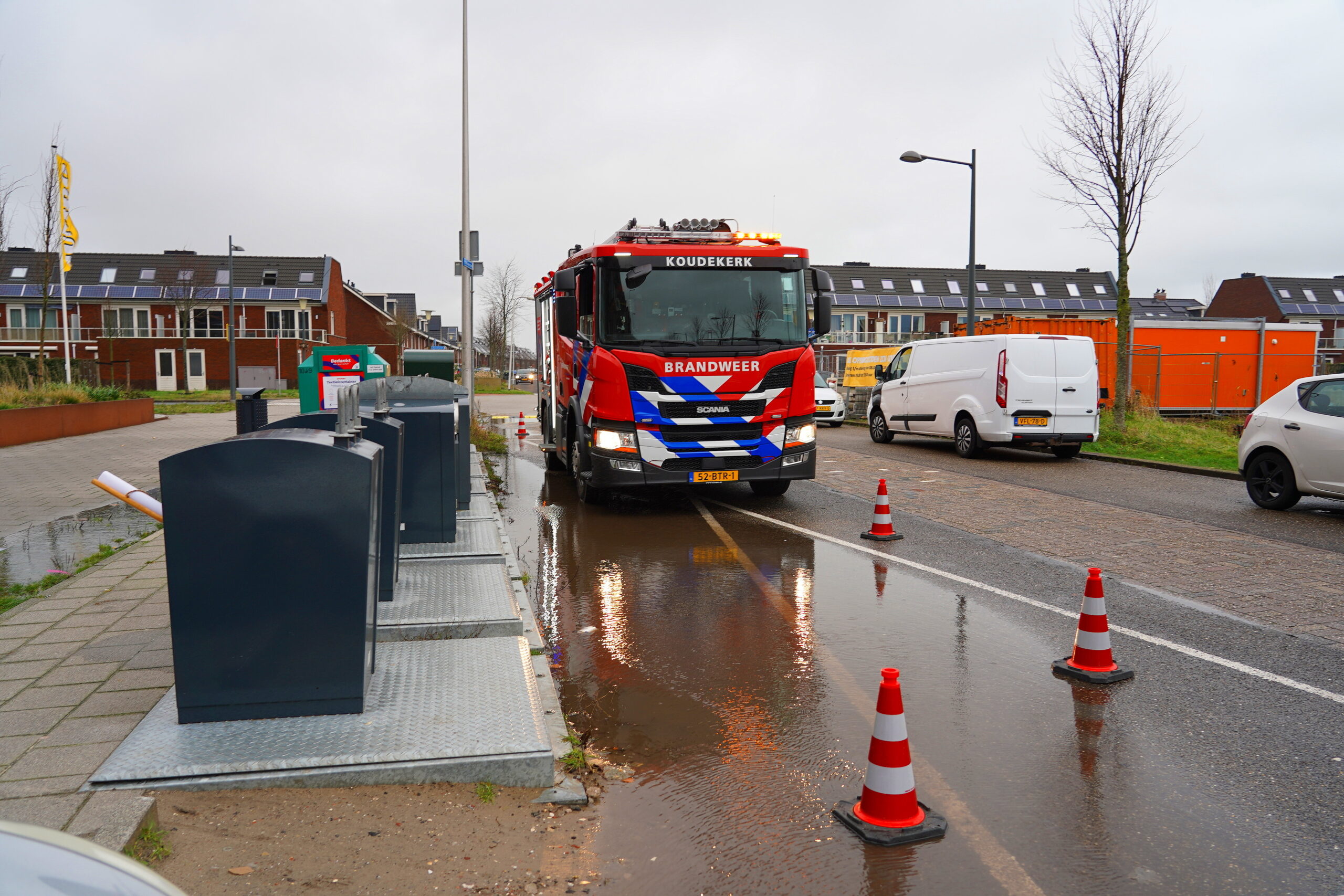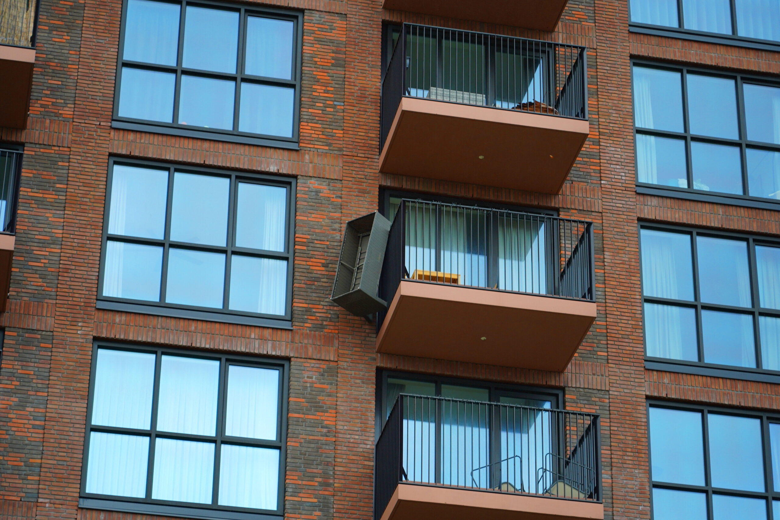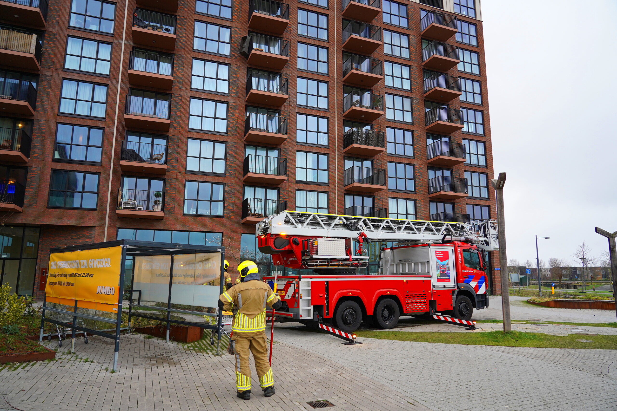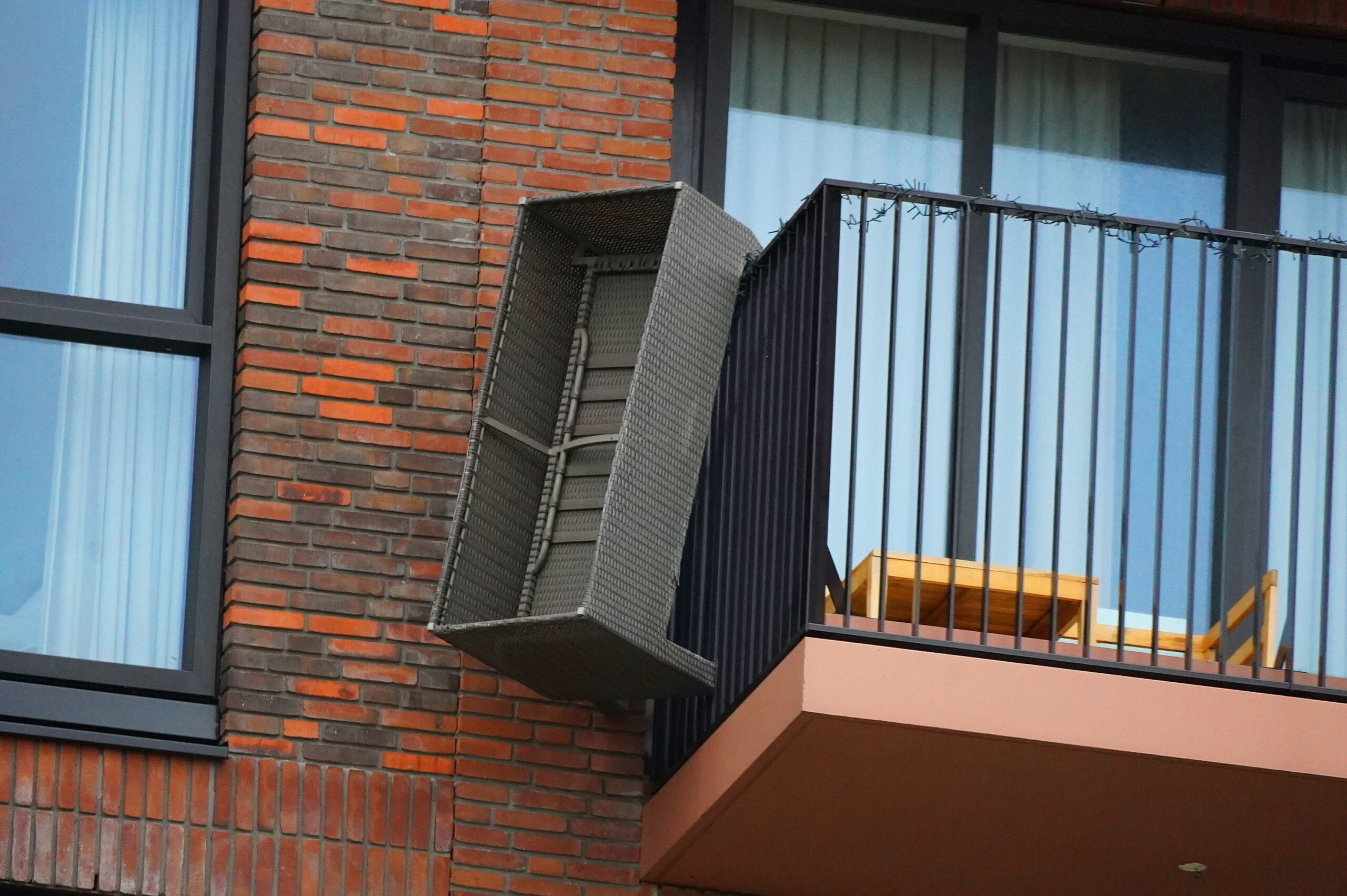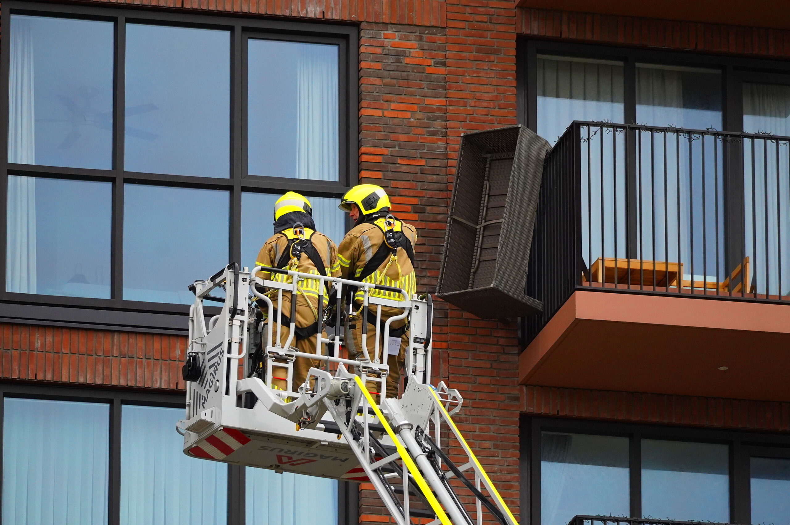 De bewoners waren niet thuis. Voorbijgangers vreesden dat de tuinbank, die door de storm over de rand van het balkon hing, naar beneden zou waaien. Ze belden 112 waarna de hulpdiensten met een hoogwerker ter plaatse kwamen.