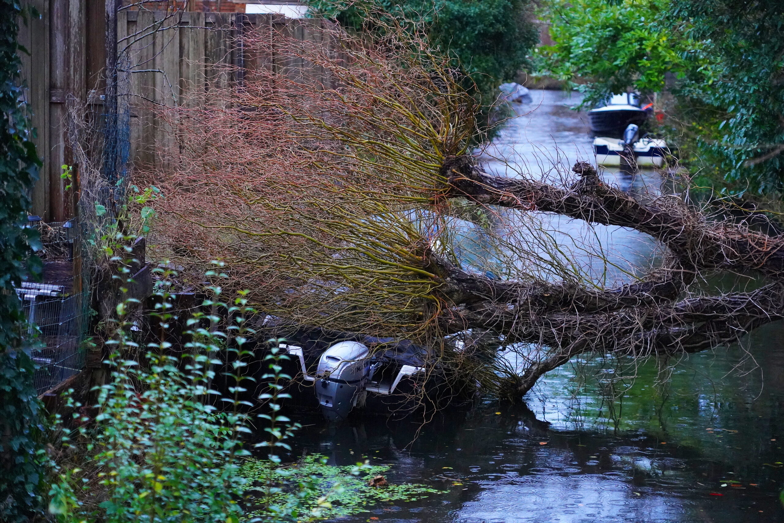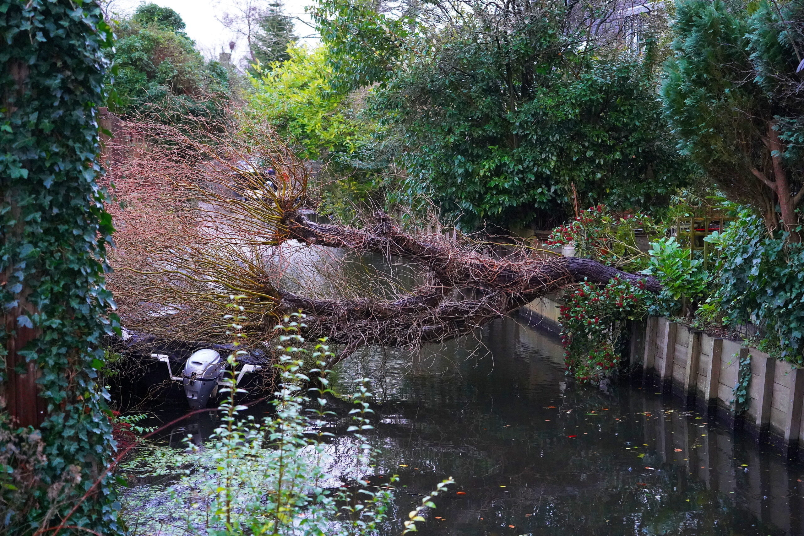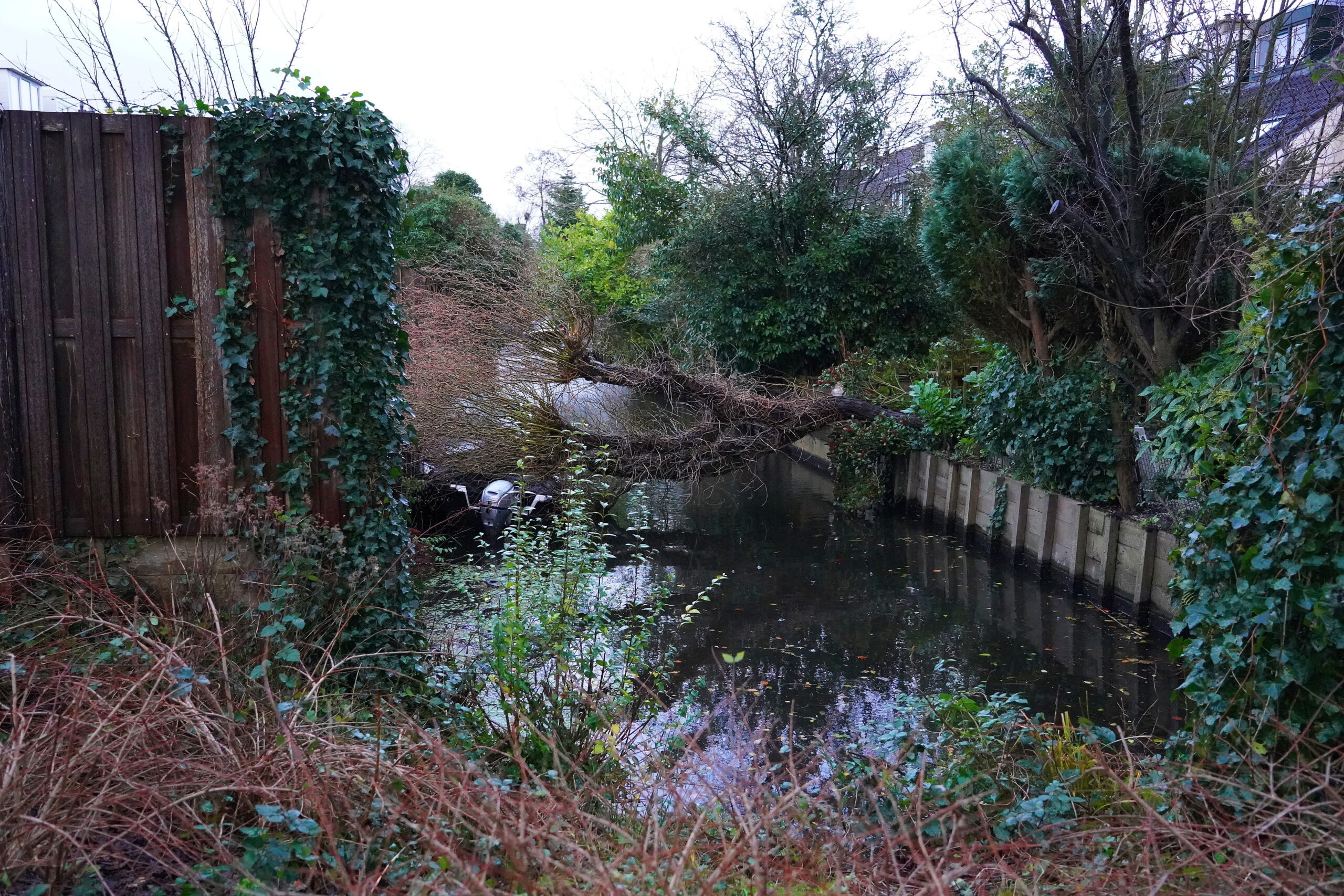 Storm Floriane hield maandagmiddag flink huis in heel Nederland. Zo ook in Oegstgeest waar rond 16.30 uur een boom omwaaide. De kronkelwilg viel vanuit de tuin van een huis aan de Eduard Flipseweg in de sloot die erachter loopt. De boom kwam hierbij vol op een bootje terecht dat in de sloot ligt.