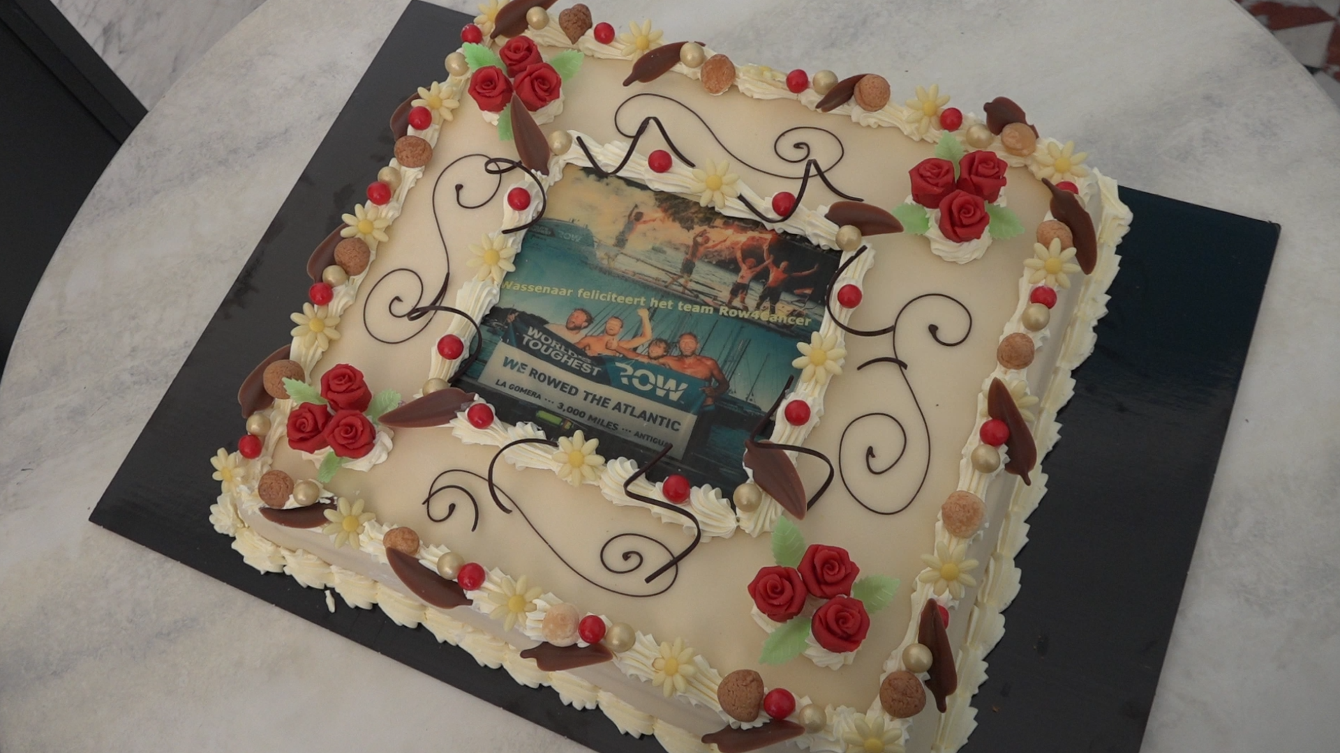 Ook de andere roeiers kregen nog een extraatje. Naast een grote taart had de gemeente voor elke sportman een mandje met lokale boeren producten. “Tijdens de roeitocht hebben ze 14.000 calorieën per dag verbrand, we leveren graag een bijdrage om ze weer te laten aansterken”, grapt Van Doeveren.