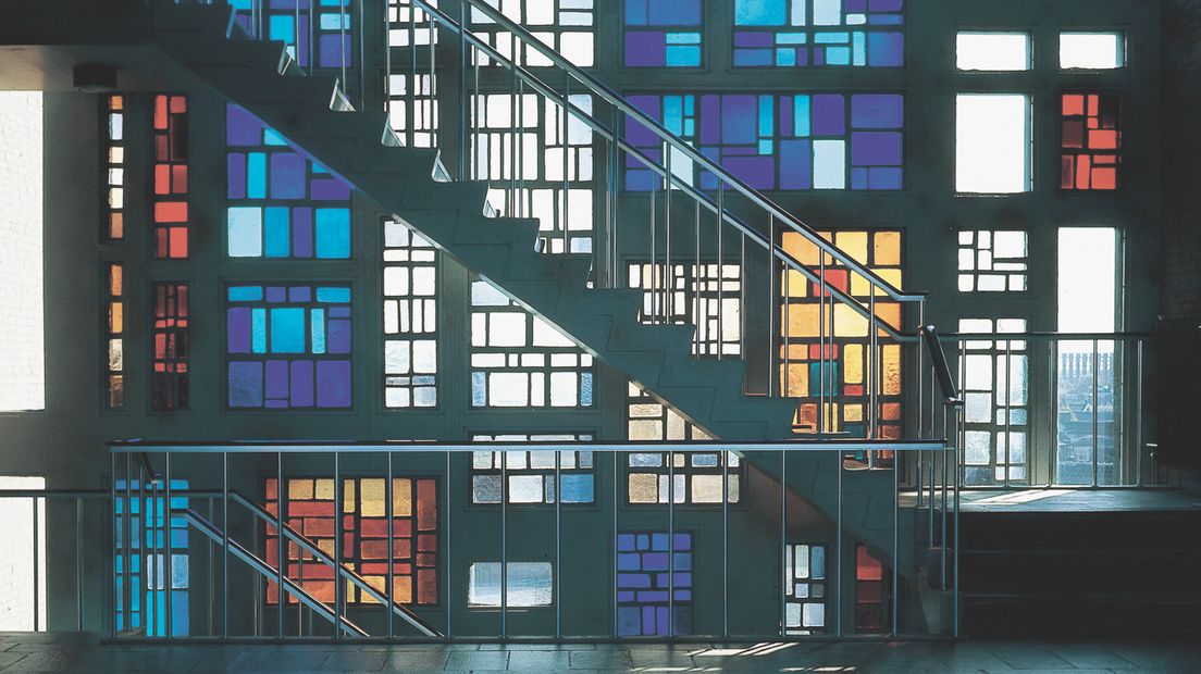Wie straks vanuit de garage het trappenhuis beklimt, zal worden verrast door de vele verschillende kleuren. Meine Jansen: “Door het kunstwerk op een hoek van de nieuwbouw te zetten, zal de zon er doorheen schijnen. Op elk uur van de dag schijnen er dan andere kleurencombinaties door het trappenhuis.”