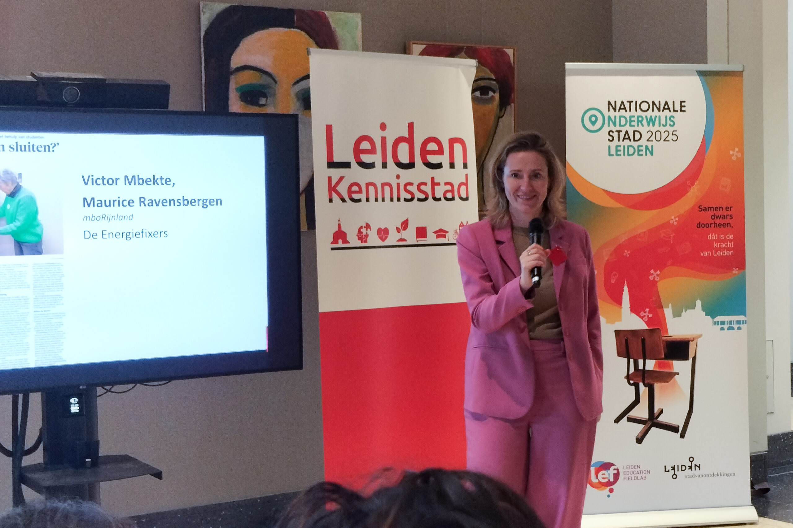 Docent Maurice Ravensbergen introduceert het project Energiefixers, waarin mbo-studenten bewoners helpen hun huis te verduurzamen. Samen met student Victor Mbekte vertelt hij: “Onze studenten gaan echt bij mensen thuis aan de slag en krijgen zo een kijkje achter de voordeur.”