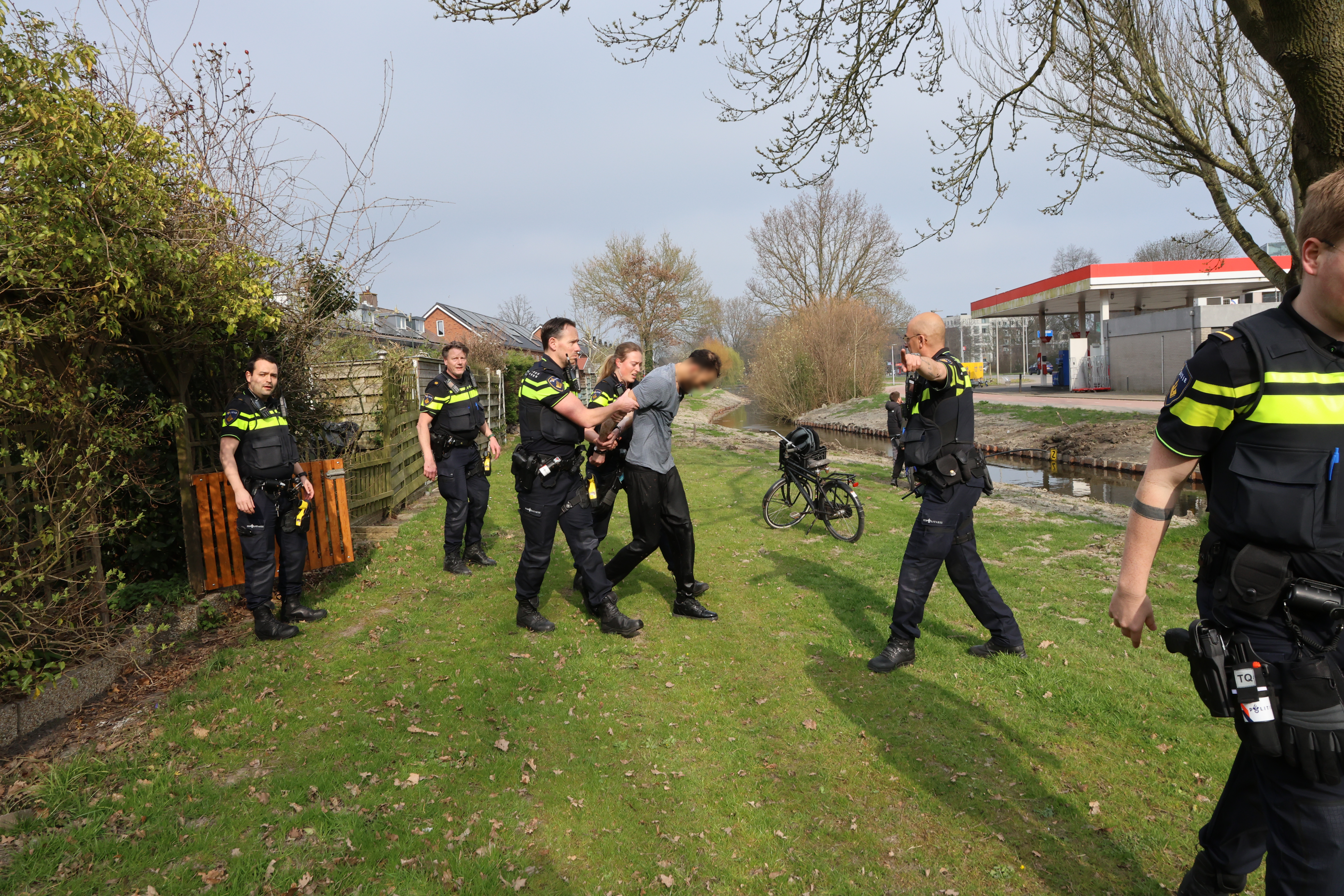 In de achtertuin van een woning aan de Brunelkamp heeft de politie een persoon aangehouden. Om de tuin te bereiken sprong hij in de sloot. De man is uit de tuin gehaald en geboeid afgevoerd naar de arrestantenwagen die nog op hem stond te wachten aan de achterzijde van het ziekenhuis.