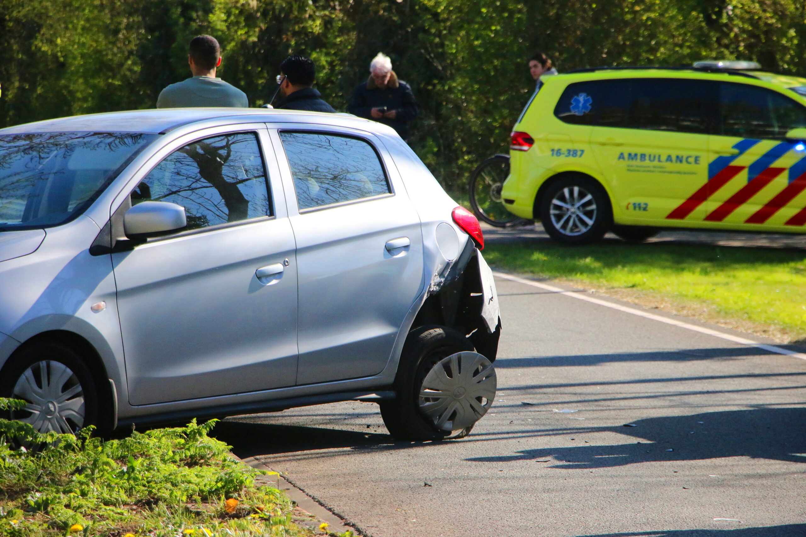 Tijdens het beoordelen van de schade samen met de politie, stond de auto in de middenberm met alarmlichten aan. Een andere auto kwam op de stilstaande auto afgereden en merkte de auto te laat op waardoor er een botsing ontstond.
