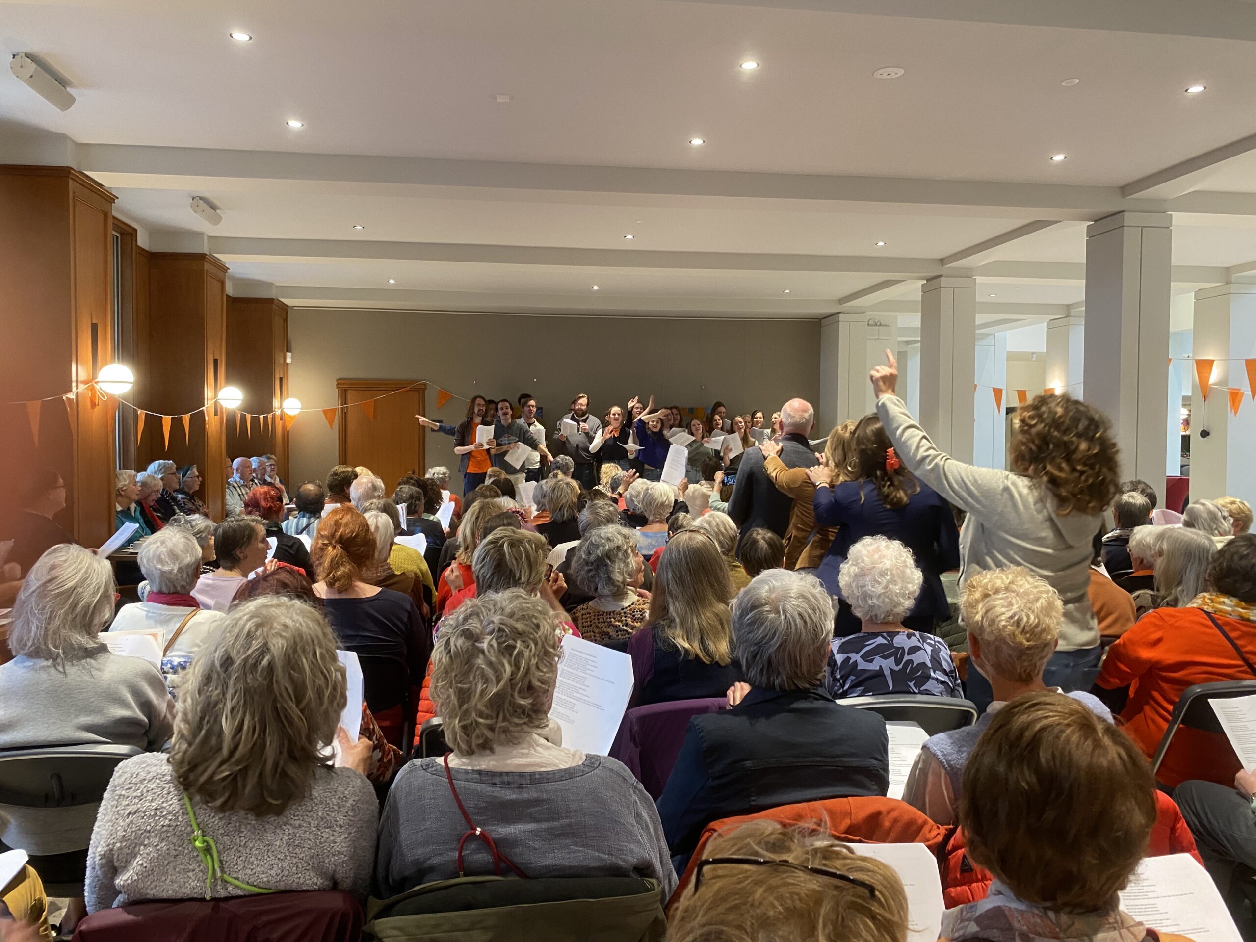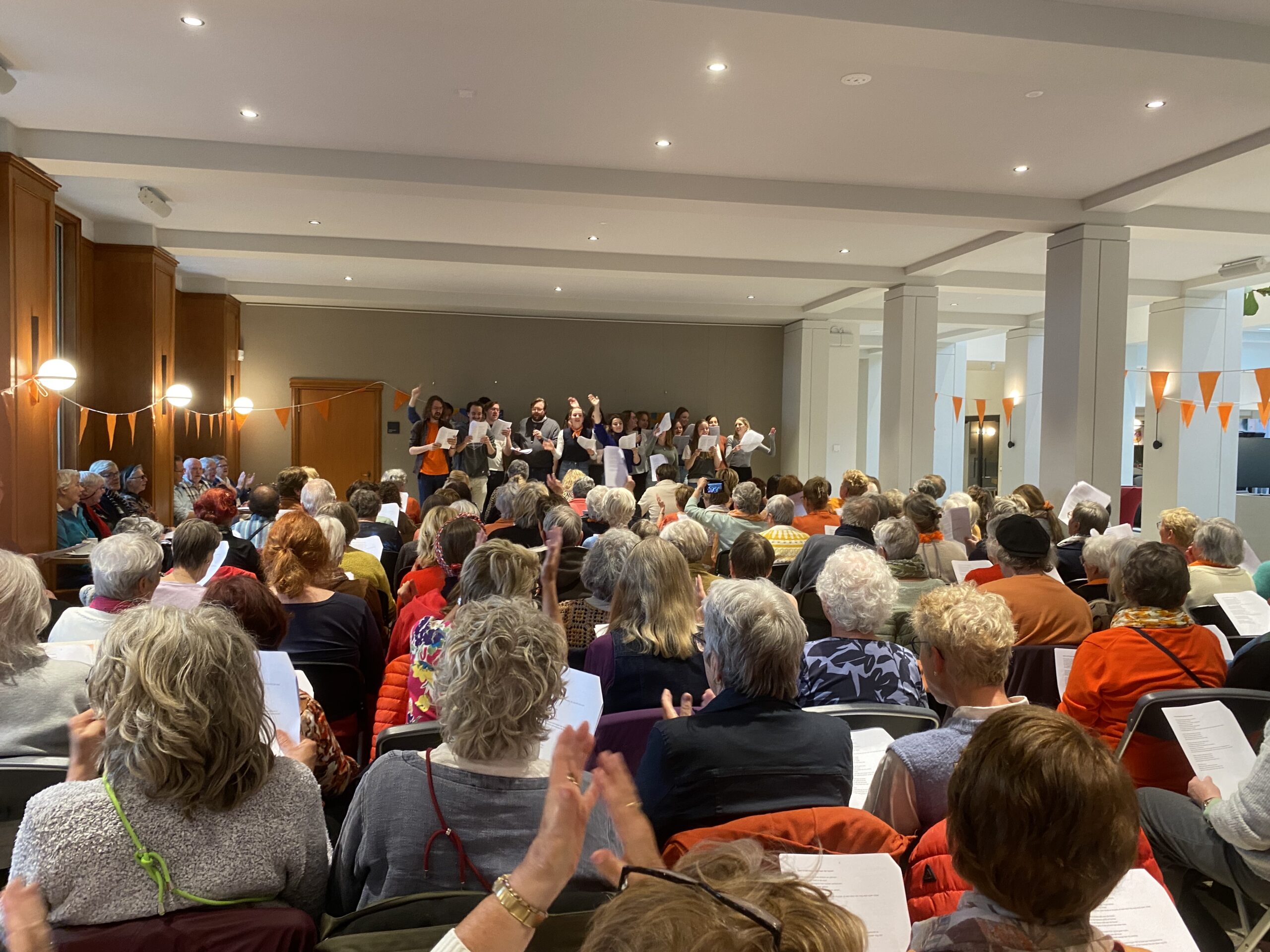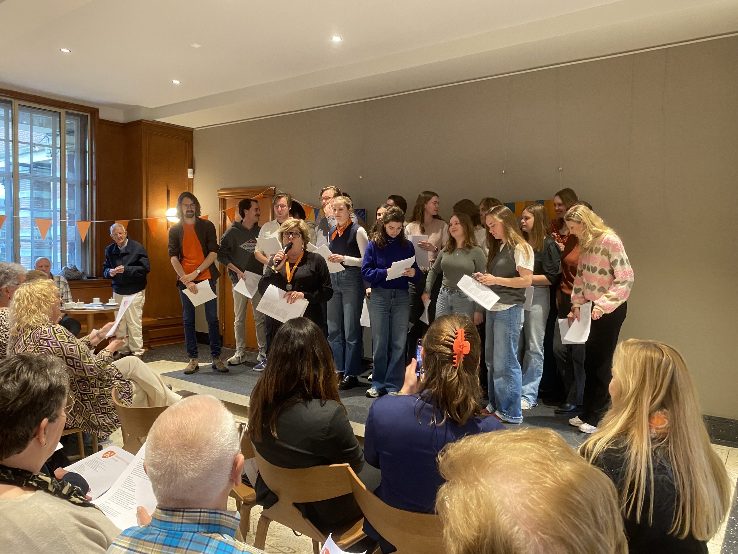 Ouderen, studenten en wethouders stonden donderdagmiddag samen te swingen in de stadsfoyer van het Leidse stadhuis. Het Meezingspektakel, georganiseerd door de Leidse Oranje Vereniging, zorgde voor een volle zaal en veel enthousiasme. Onder begeleiding van het koor Sempre Crescendo, afkomstig van studentenvereniging Minerva, werd uit volle borst meegezongen met Nederlandse klassiekers. Van Aan de Amsterdamse grachten tot 15 miljoen mensen — alles kwam voorbij.