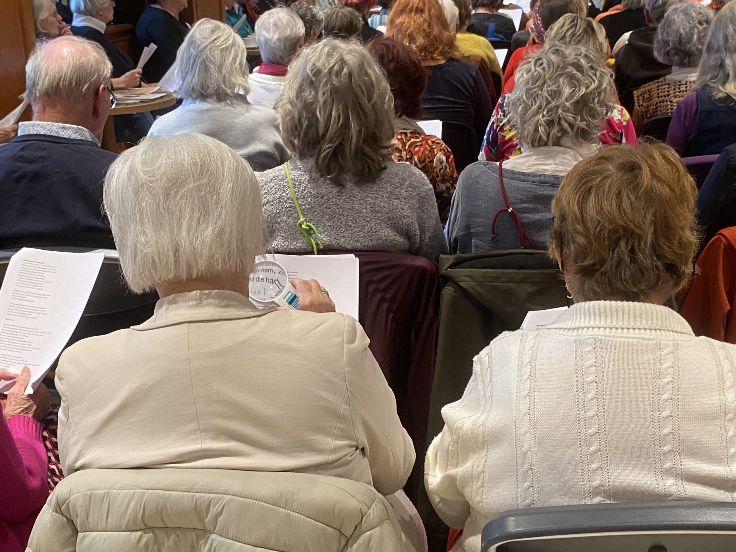 “Het is geweldig om te zien”, zegt Trudy Kwik, voorzitter van de Oranje Vereniging. “Vorig jaar waren er zo’n dertig 60-plussers, nu zat de hele foyer stampvol.” Zo vol zelfs, dat de blaadjes met de songteksten op waren.