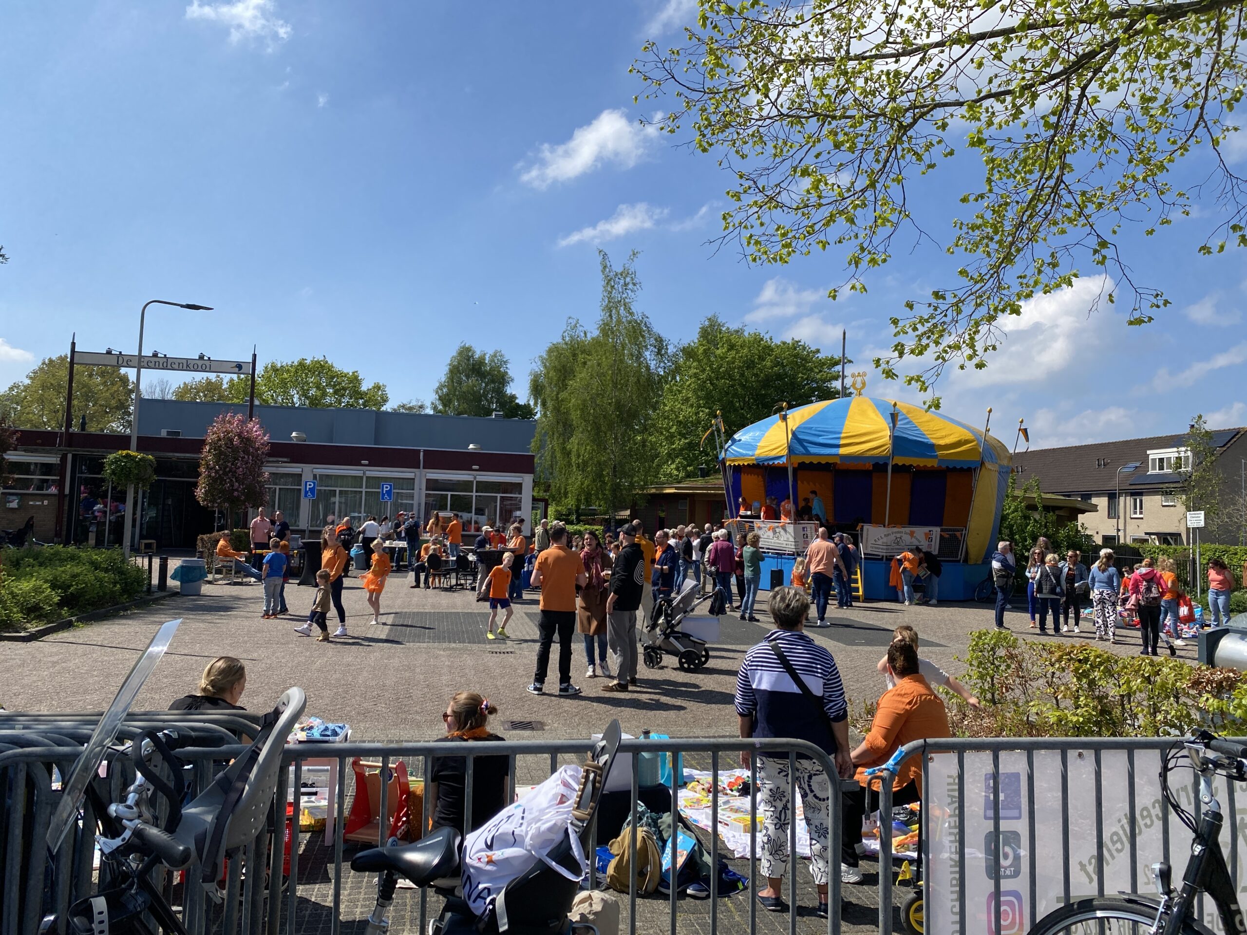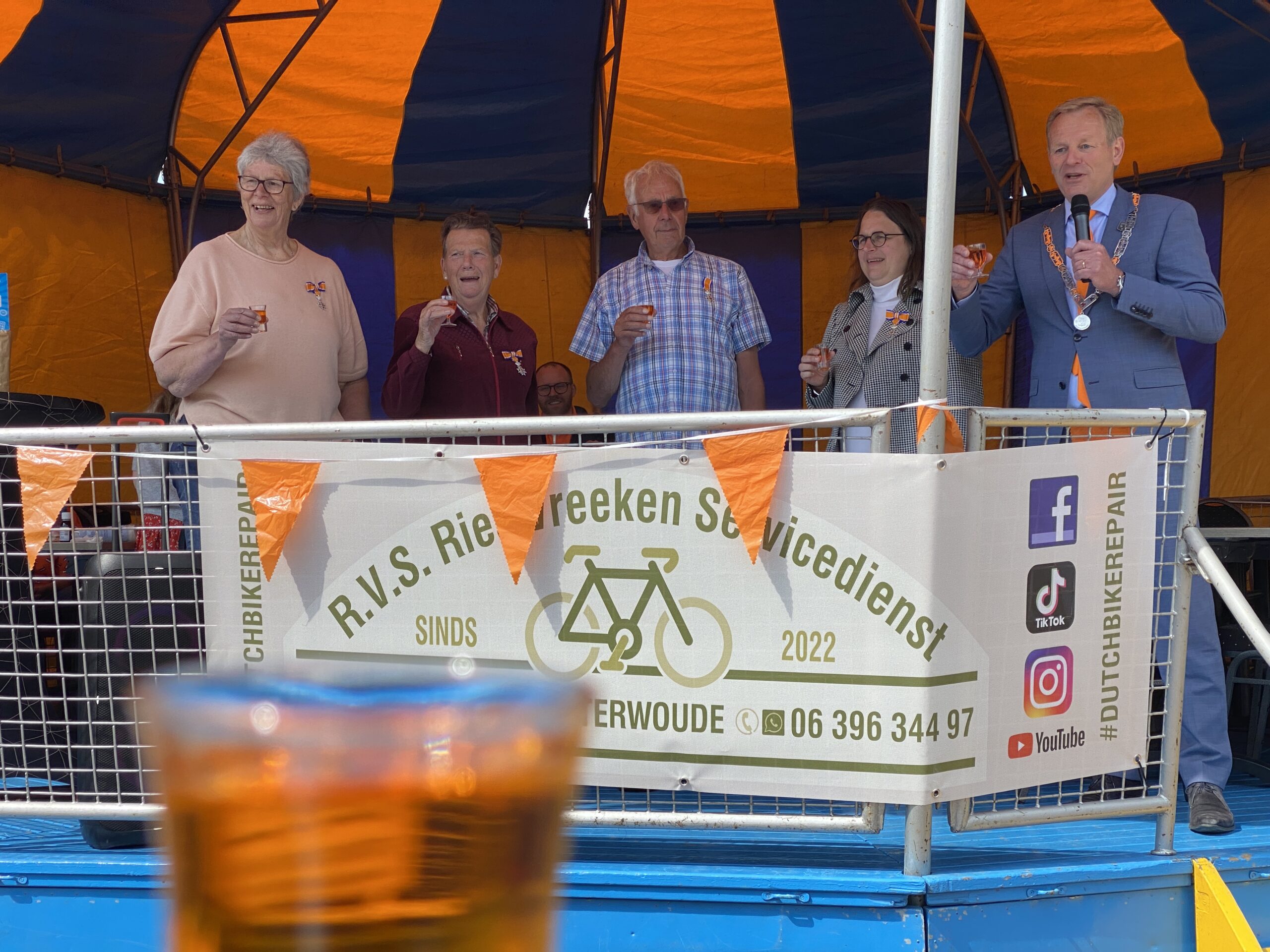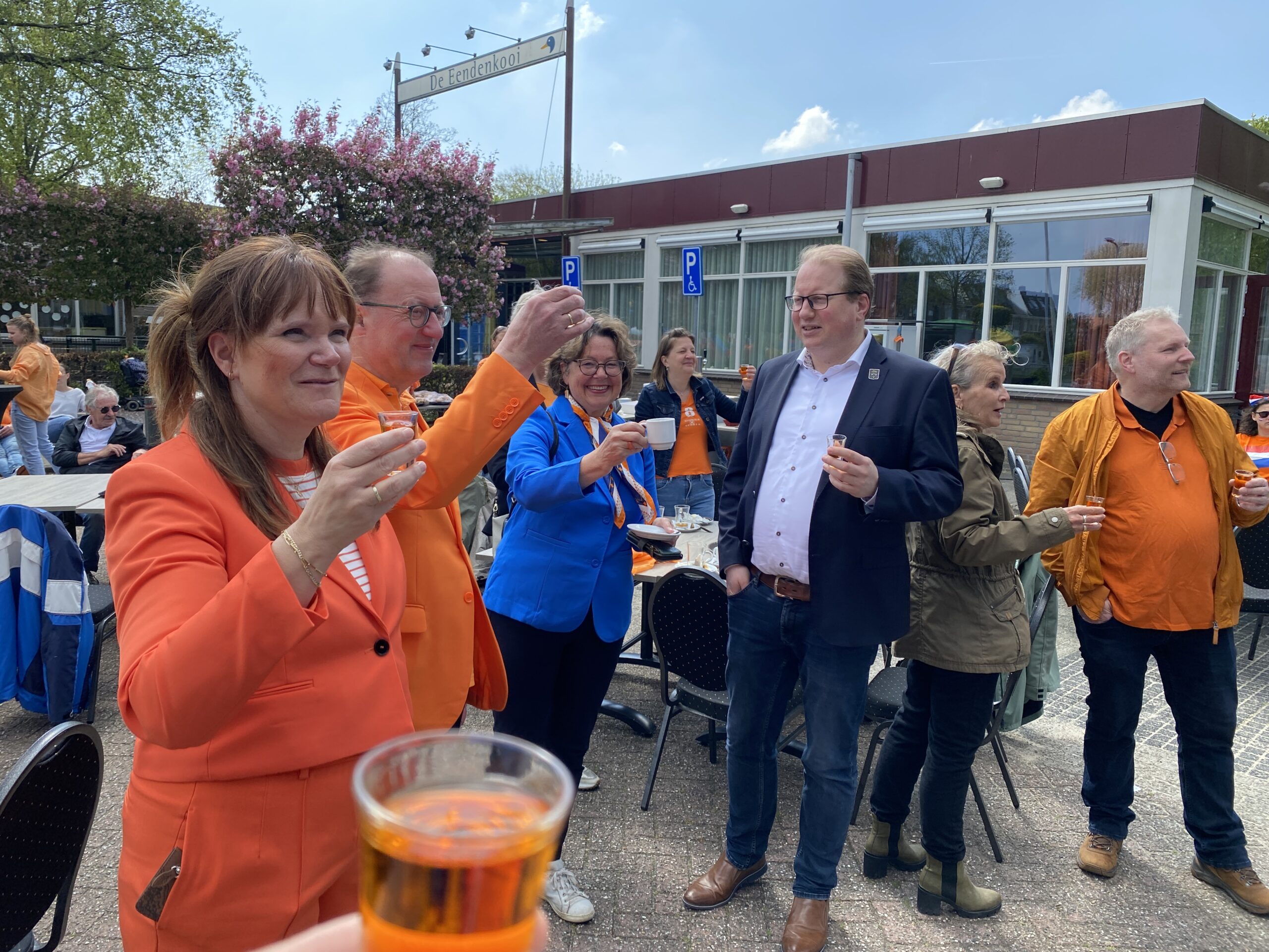 Het Zoeterwoudse college verplaatste zich ondertussen naar Zoeterwoude-Rijndijk, waar de burgemeester om 12.30 uur de festiviteiten in dit deel van Zoeterwoude officieel opende. Hierbij waren vier van de zeven gedecoreerden aanwezig. Na een korte introductie werd het glas op hen en uiteraard op de Koning geheven. Daarna ging de kleine vrijmarkt op de parkeerplaats bij de Eendenkooi van start. Ook werd er geschminkt, glittertatoo’s gezet en stonden er verschillen springkussens.