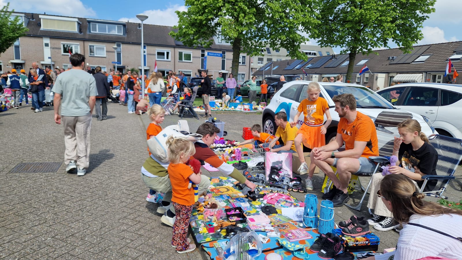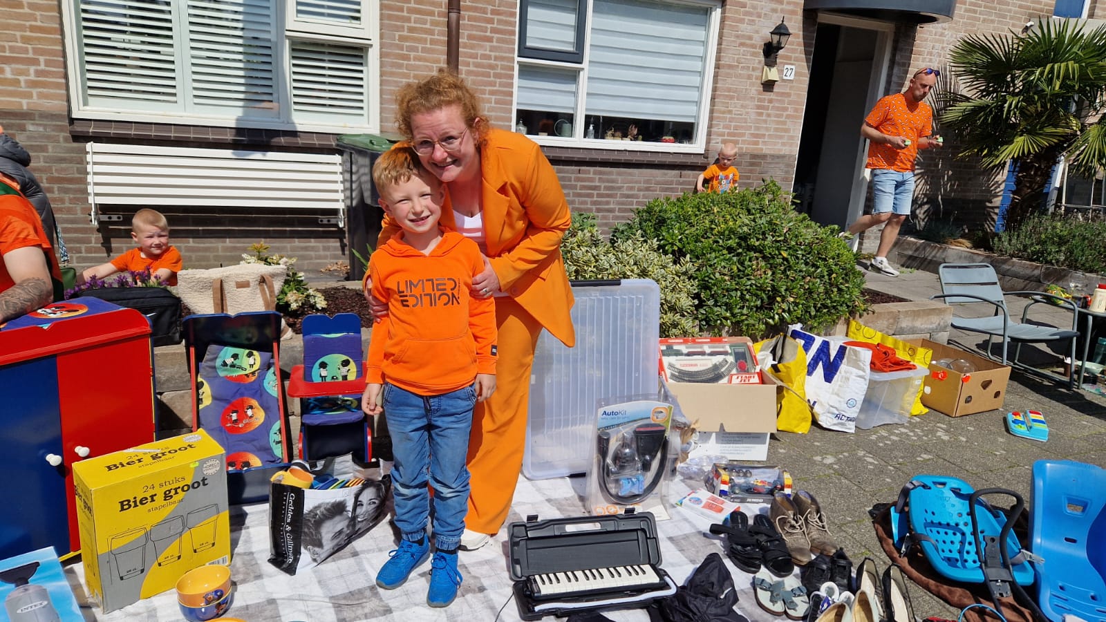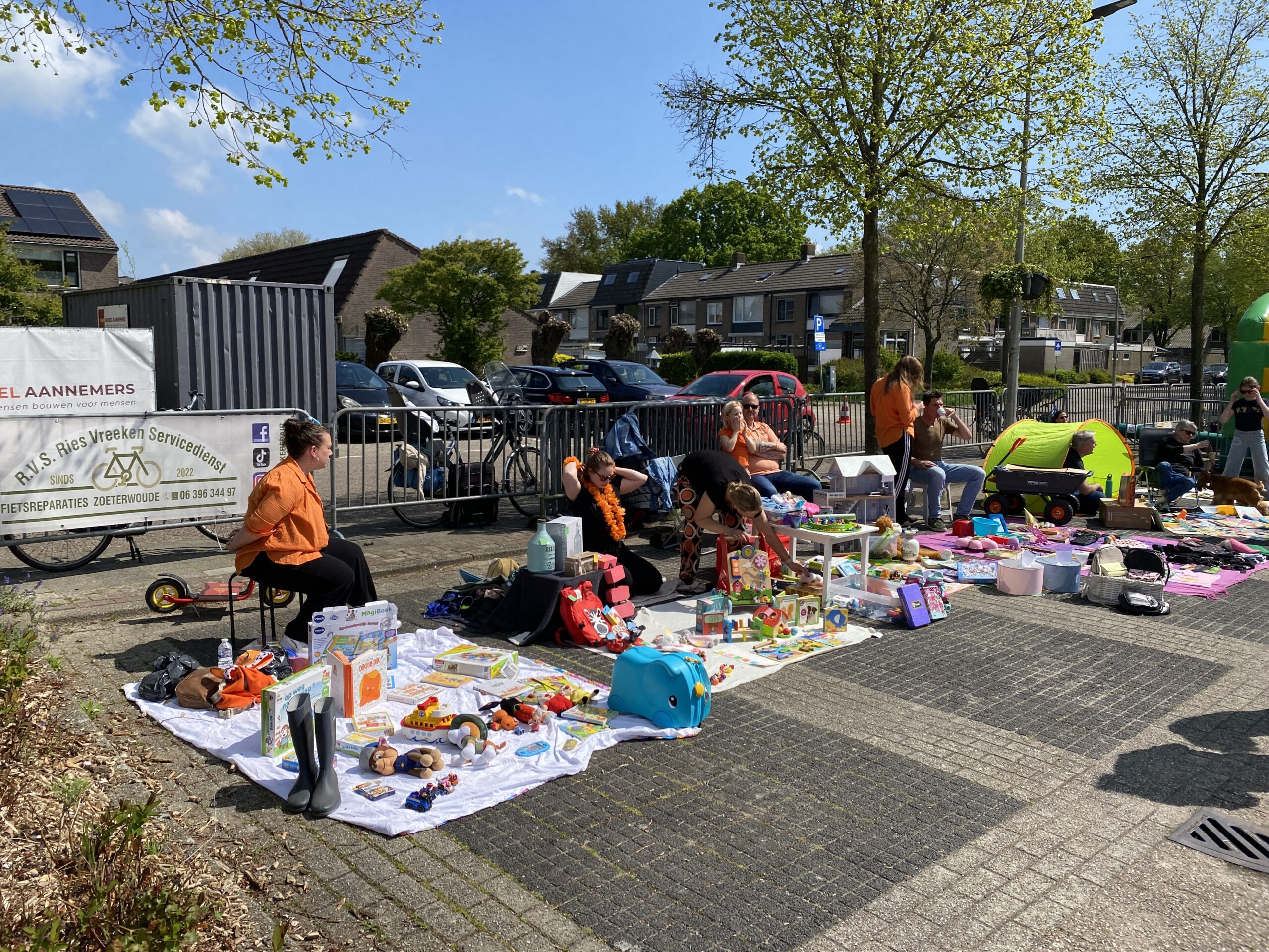 Om 12.00 uur startte de vrijmarkt rondom de Klaverhal. In de hal stond alles standby om, mocht het weer omslaan, snel naar binnen te verhuizen. Maar zover kwam het niet. De zon scheen en de jongste inwoners van Zoeterwoude deden goede zaken van hun kleedje op de stoep.