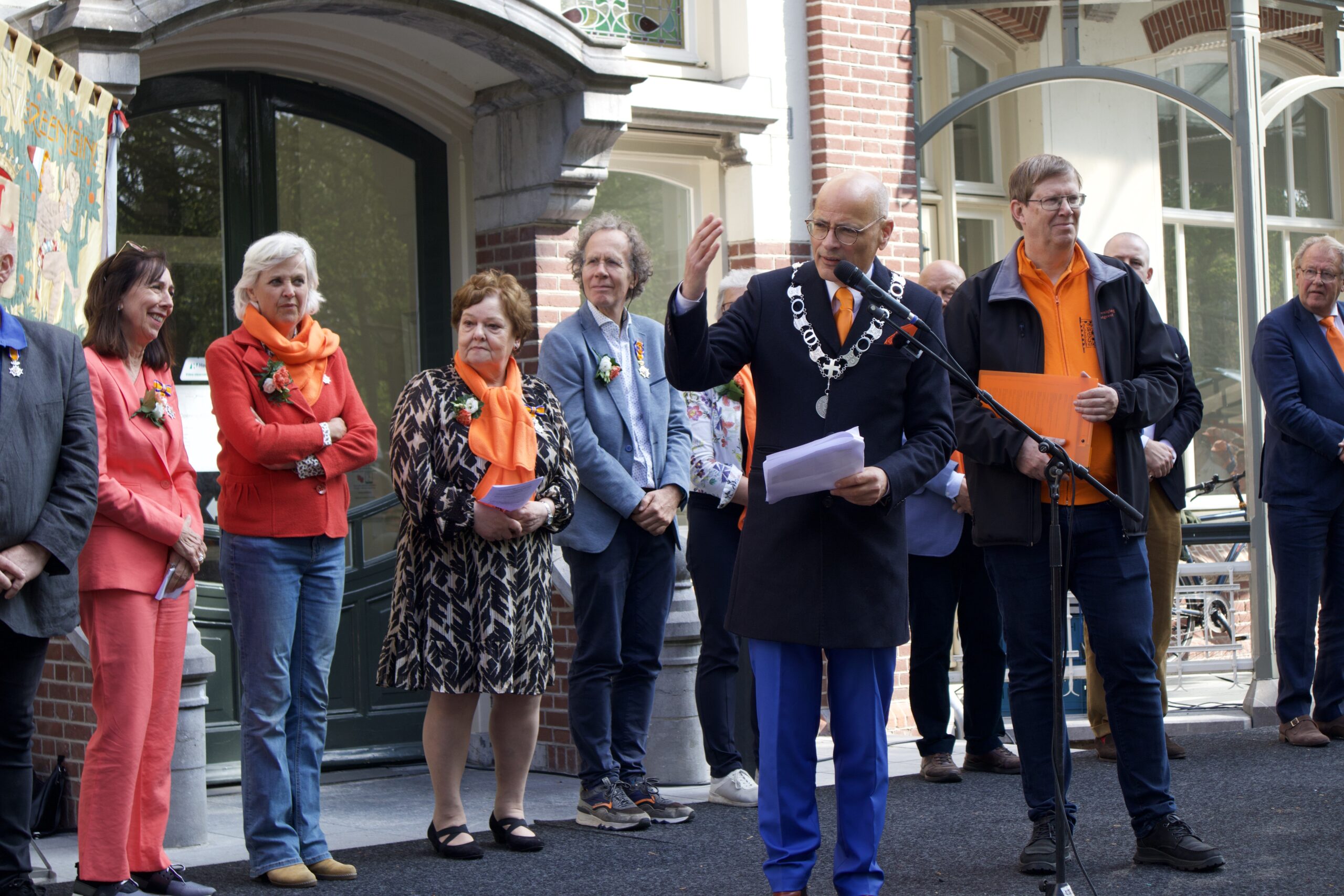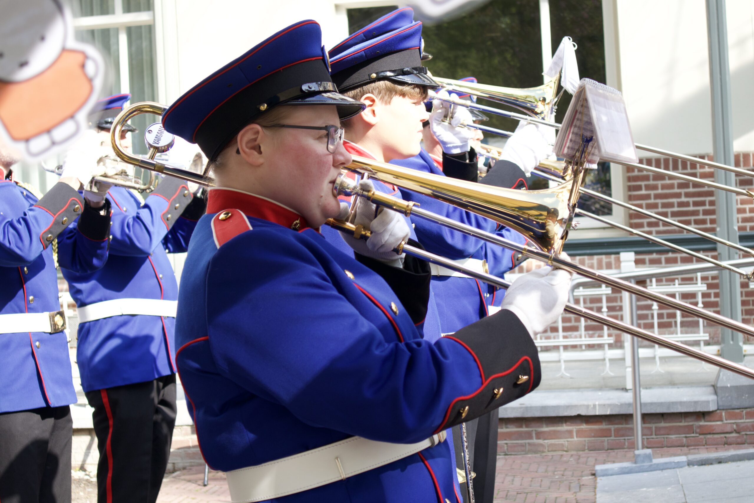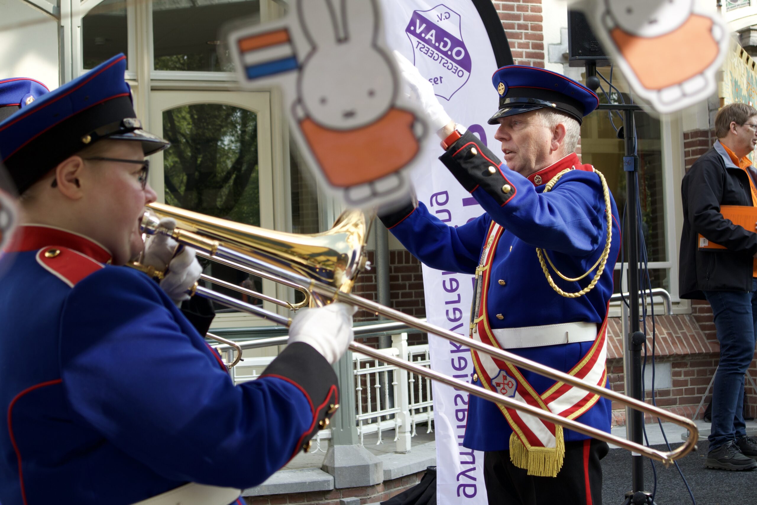 Met honderden ouders, kinderen en ouderen op het plein voor het gemeentehuis, wordt Koningsdag in Oegstgeest zaterdag 26 april feestelijk afgetrapt. Onder een stralende zon trekken vrolijke klanken van de drumfanfare over het terrein, waar burgemeester Emile Jaensch samen met het publiek liederen inzet: van het verjaardagslied voor de koning tot het Wilhelmus.