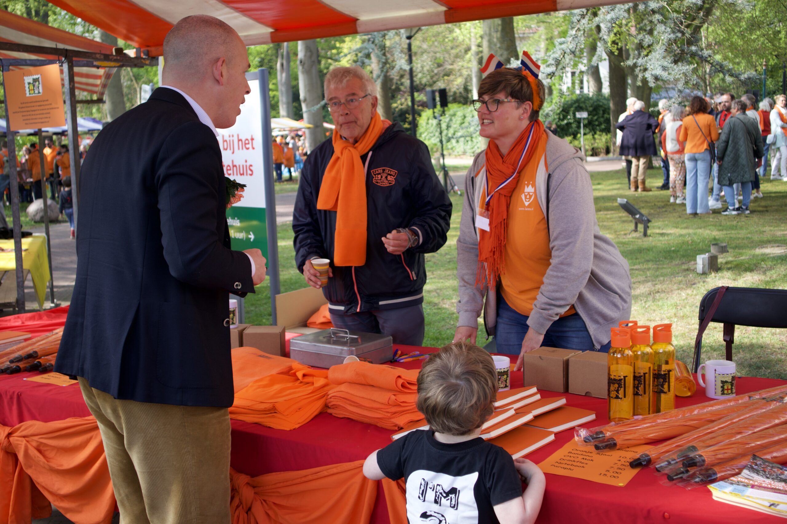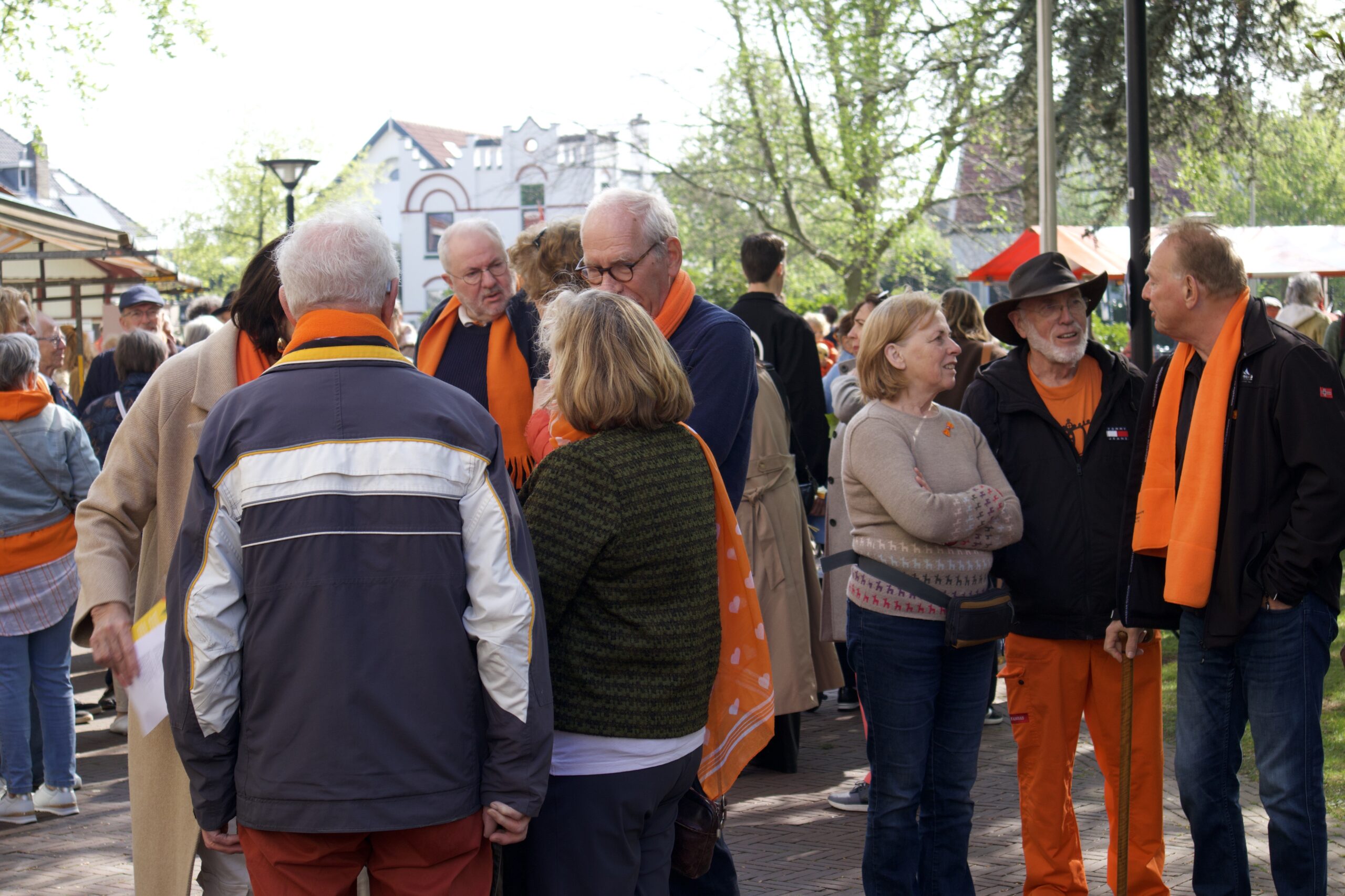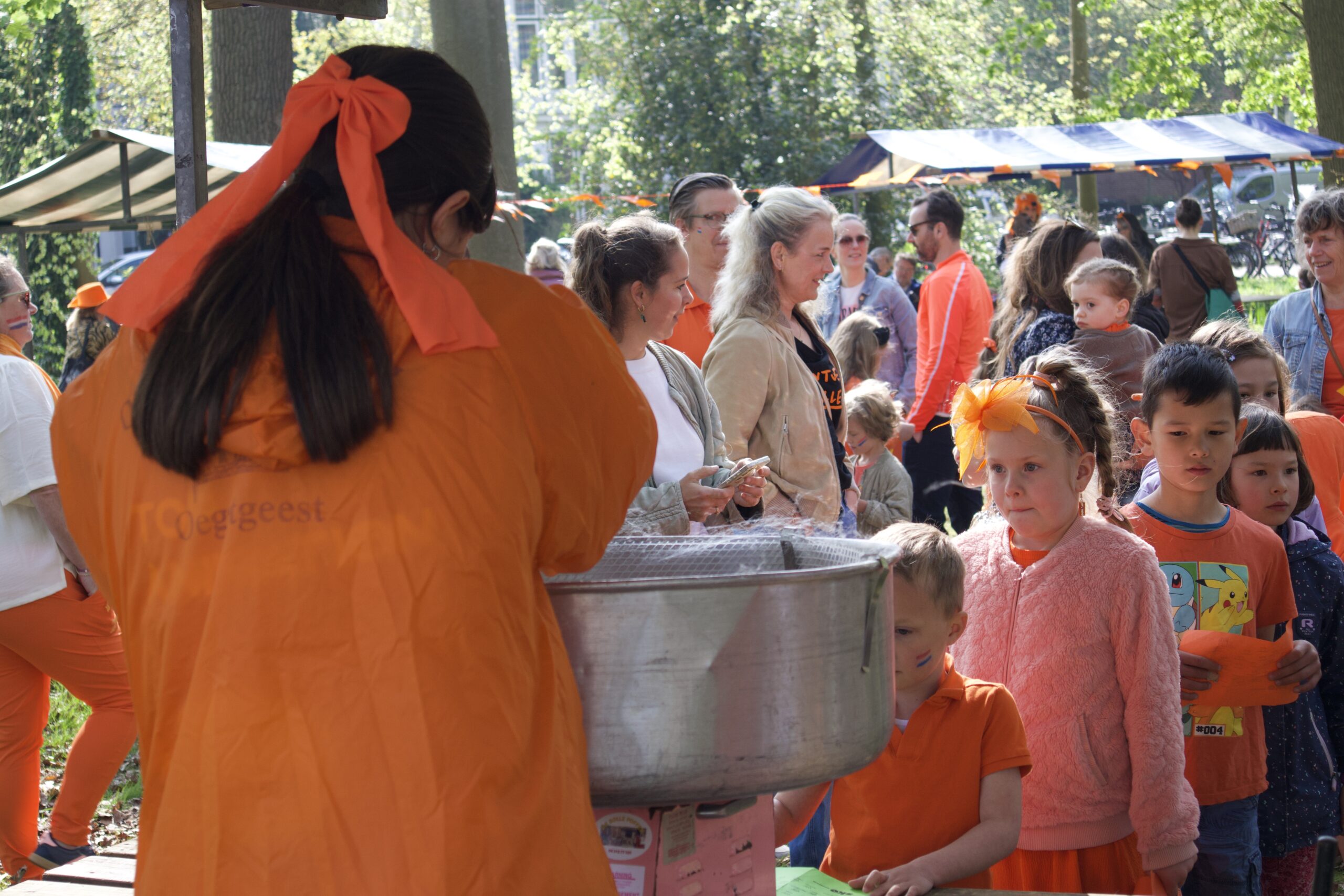 Overal verspreid staan kraampjes en spellen klaar. Vrijwilligers van de Oranjevereniging, gehuld in feestelijk oranje, leiden alles in goede banen. “Iedereen is altijd in een allerbeste stemming, wat voor weer het ook is”, vertelt vrijwilliger Simone, die al vijf jaar actief is bij de organisatie. Ze helpt onder meer bij de inschrijvingen voor de kinderspelen en hoopt ondertussen nieuwe donateurs te werven.