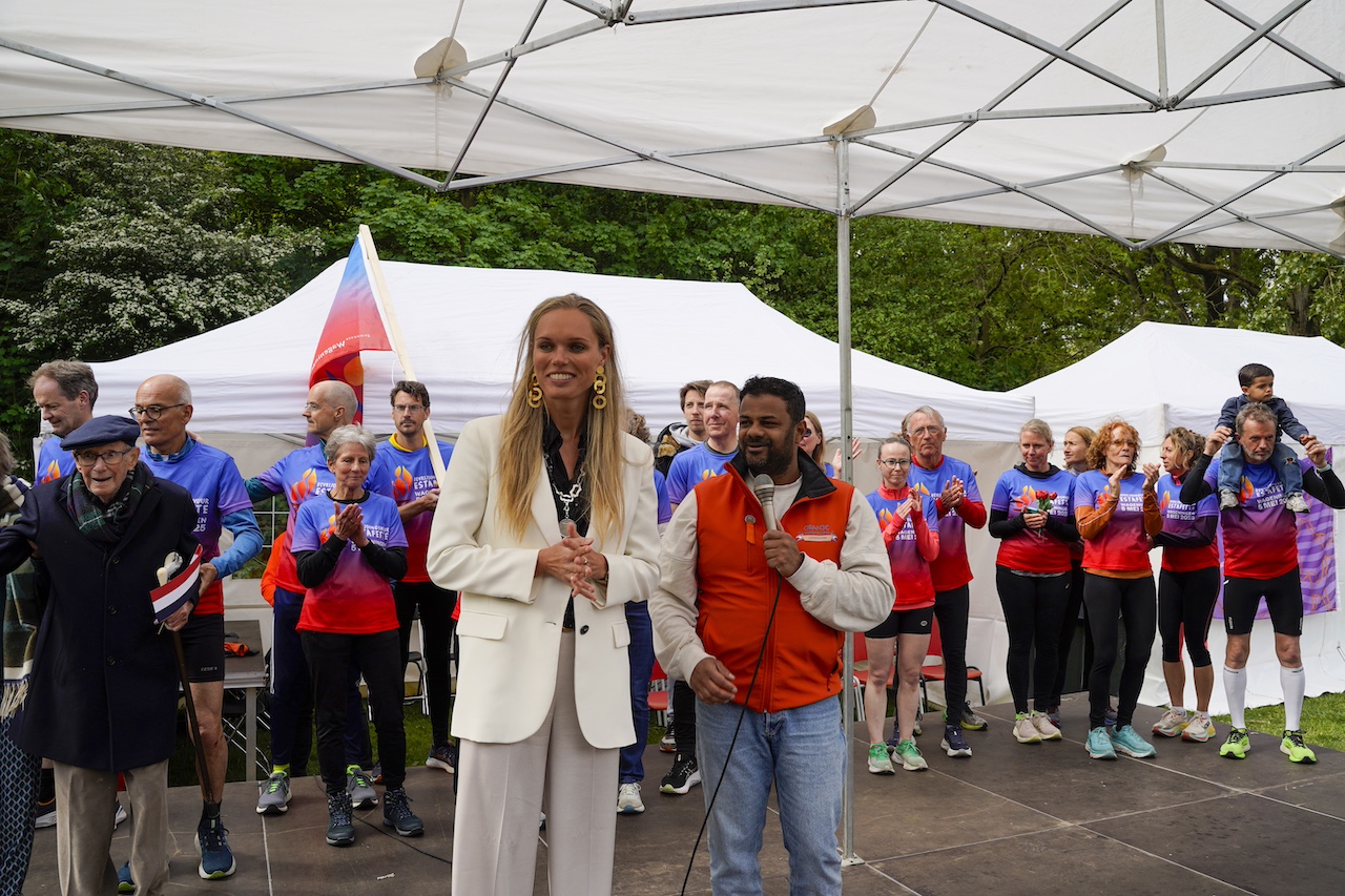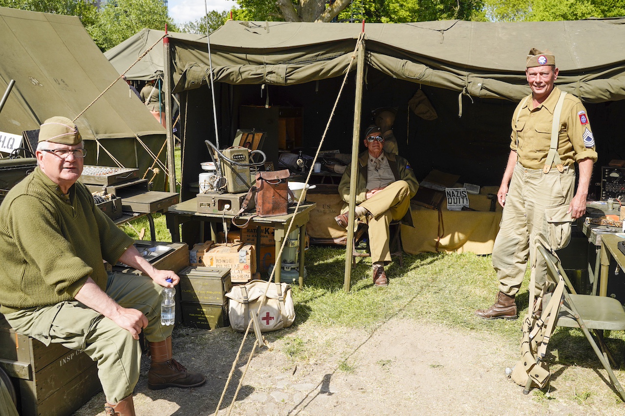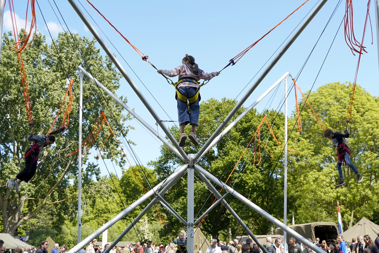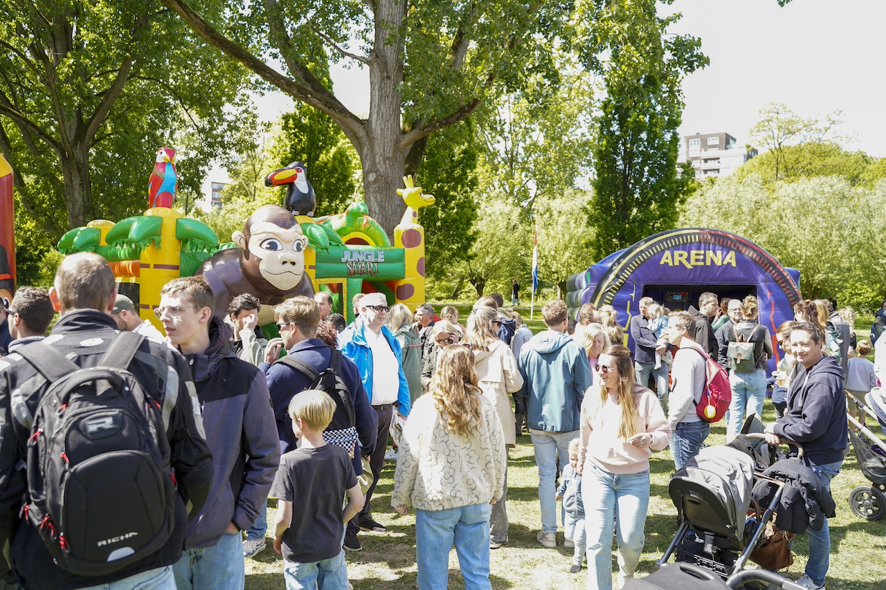 Rond 12.00 uur arriveerden de Leiderdorpse veteranen in authentieke legervoertuigen van de Able Compagnie. Zij werden feestelijk onthaald in het park, waar voor hen een ‘blauwe hap’ was georganiseerd. Voor kinderen waren er diverse attracties, waaronder een bungeetrampoline, tokkelbaan en springkussens. Daarnaast konden zij deelnemen aan een speurtocht, waarbij drie kinderen een rondrit in een legervoertuig van de Able Compagnie wonnen.
