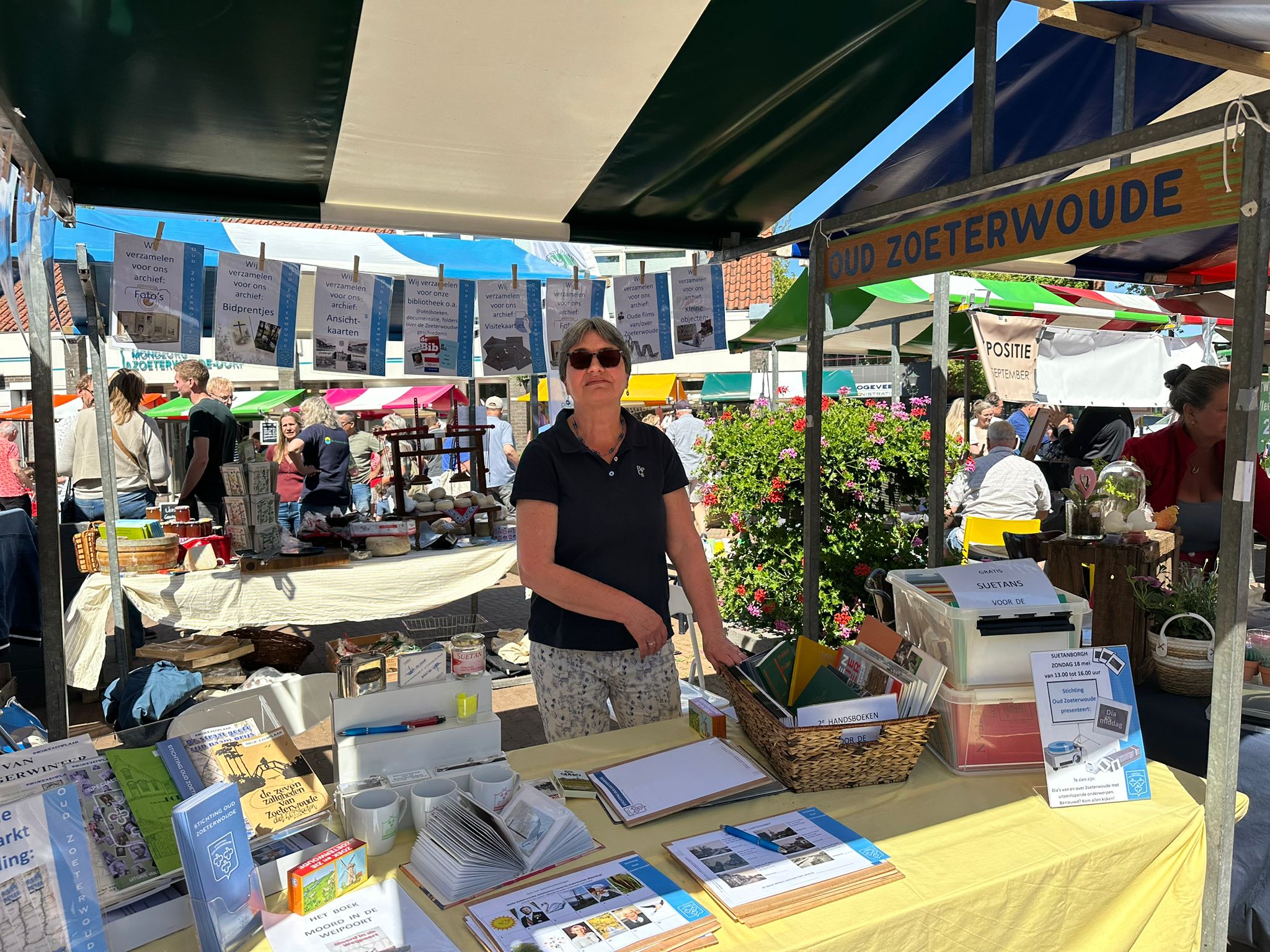 Thea Onderwater van Oud Zoeterwoude staat met een kraampje op de markt. Met de ‘club’ staan ze al jaren op de lentemarkt. Ze zegt: “Wij staan hier vooral om bekendheid te generen. Veel mensen die ik spreek, kenden ons nog niet, daar brengt zo’n markt verandering in. We staan hier ook om mensen op te roepen om hun oude foto’s en video’s over Zoeterwoude aan ons te geven, zo kunnen we ons archief uit blijven breiden.
