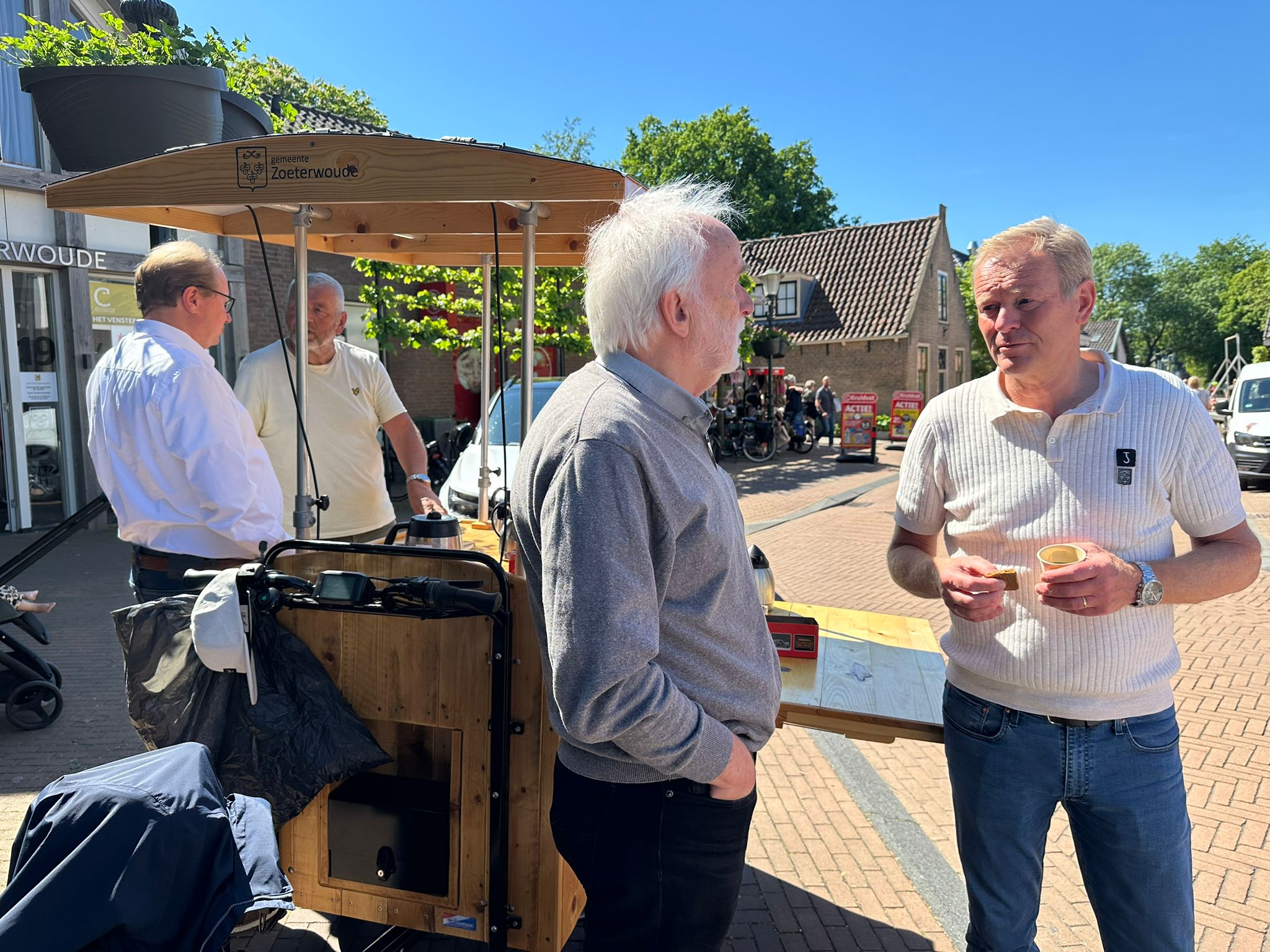 Burgemeester Fred van Trigt is ook op de markt aanwezig, zijn taak is om samen met de wethouders koffie te schenken vanaf de ouderwetse koffiekar. Maar van schenken komt het amper, zowel de burgemeester als wethouder Paul Olthof hebben het vooral druk met kletsen met inwoners. Af en toe weet Olthof zijn dochter te strikken om een beker koffie in te schenken voor de bezoekers. De burgemeester kijkt tevreden rond en ziet dat er veel Zoeterwoudse initiatieven achter een kraampje staan. “Dit is echt iets van het dorp”, zegt hij. Ook is van Trigt blij dat het dorpsplein op deze manier de functie heeft, die hij allang in zijn hoofd had. Een plein in het centrum van het dorp, dat een centrale functie heeft.
