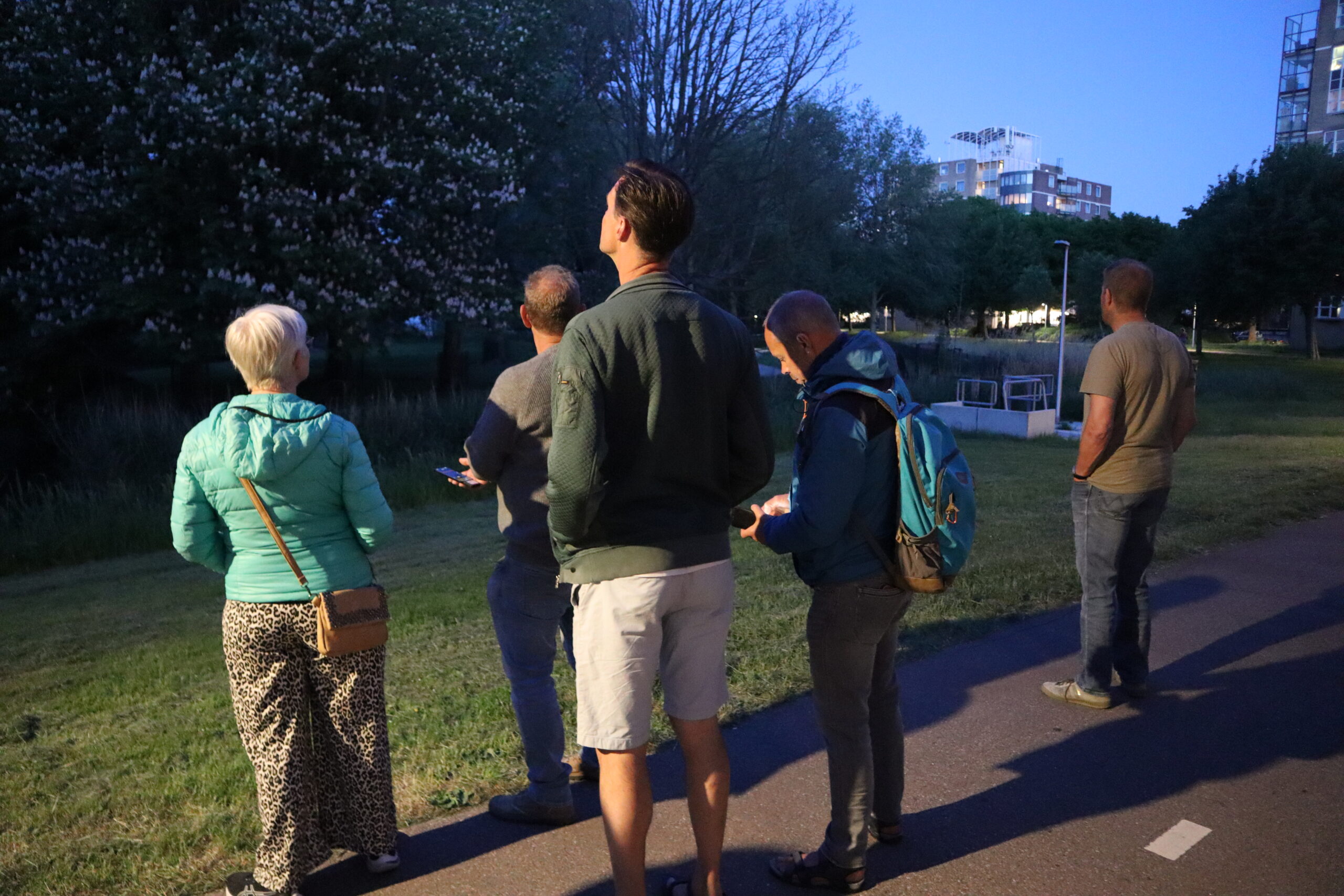 Daarna is het tijd om op zoek te gaan naar de dieren zelf. In kleine groepjes, elk met een eigen gids, gaan de bewoners de wijk in. Van der Laan leidt ook een groepje. Gewapend met een vleermuisdetector – een apparaat dat hun geluiden hoorbaar maakt – speuren ze de lucht af. Eerst blijft het stil. Maar dan, plotseling: “Kijk daar!” roept een kind. En ja hoor; een paar vleermuizen fladderen boven hun hoofden. Verwondering alom.