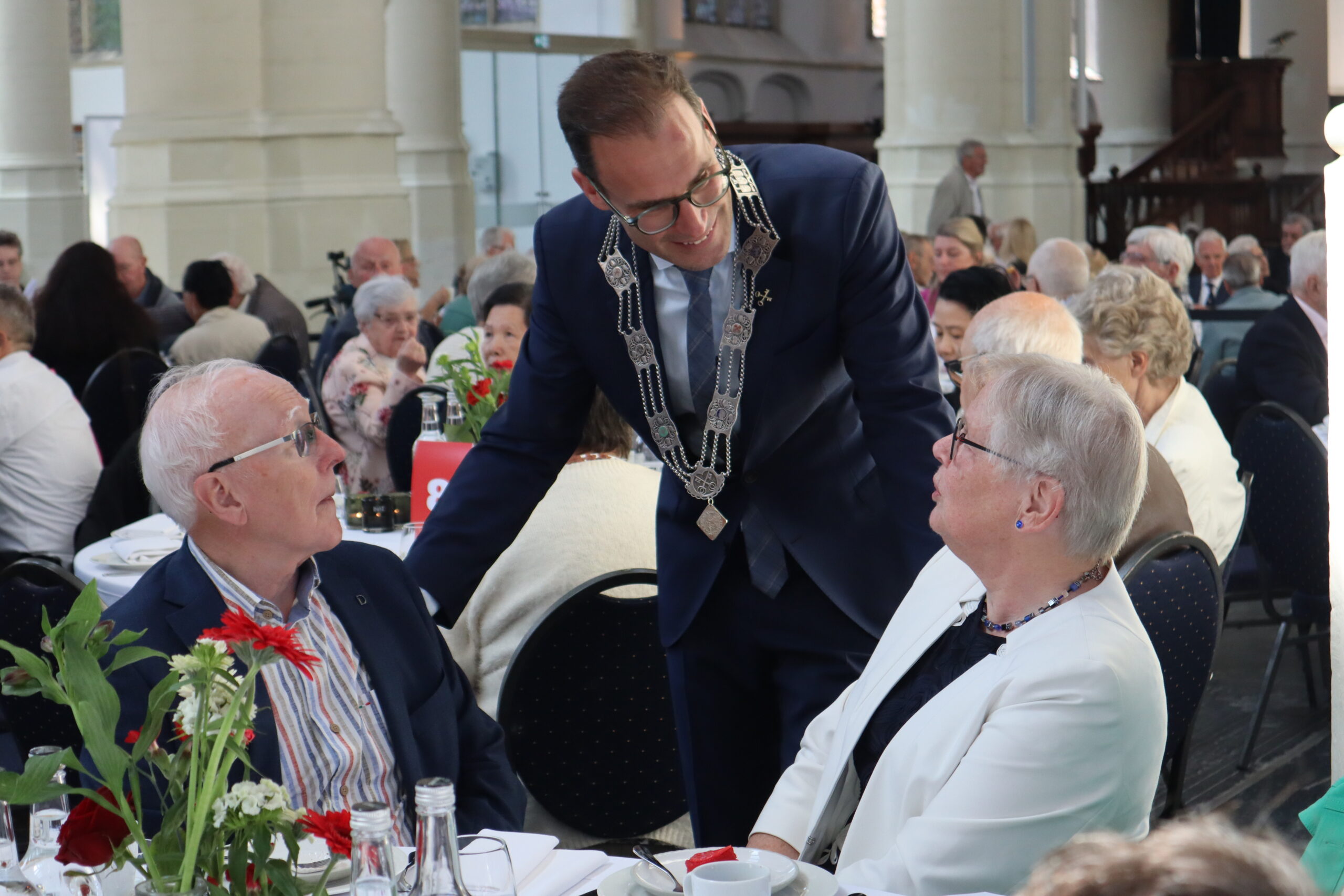 Na zijn toespraak liep de burgemeester langs de tafels voor een praatje en een foto met elk paar. Ook wethouders Yvonne van Delft, Abdelhaq Jermoumi en Julius Terpstra schoven later aan om persoonlijk te feliciteren.