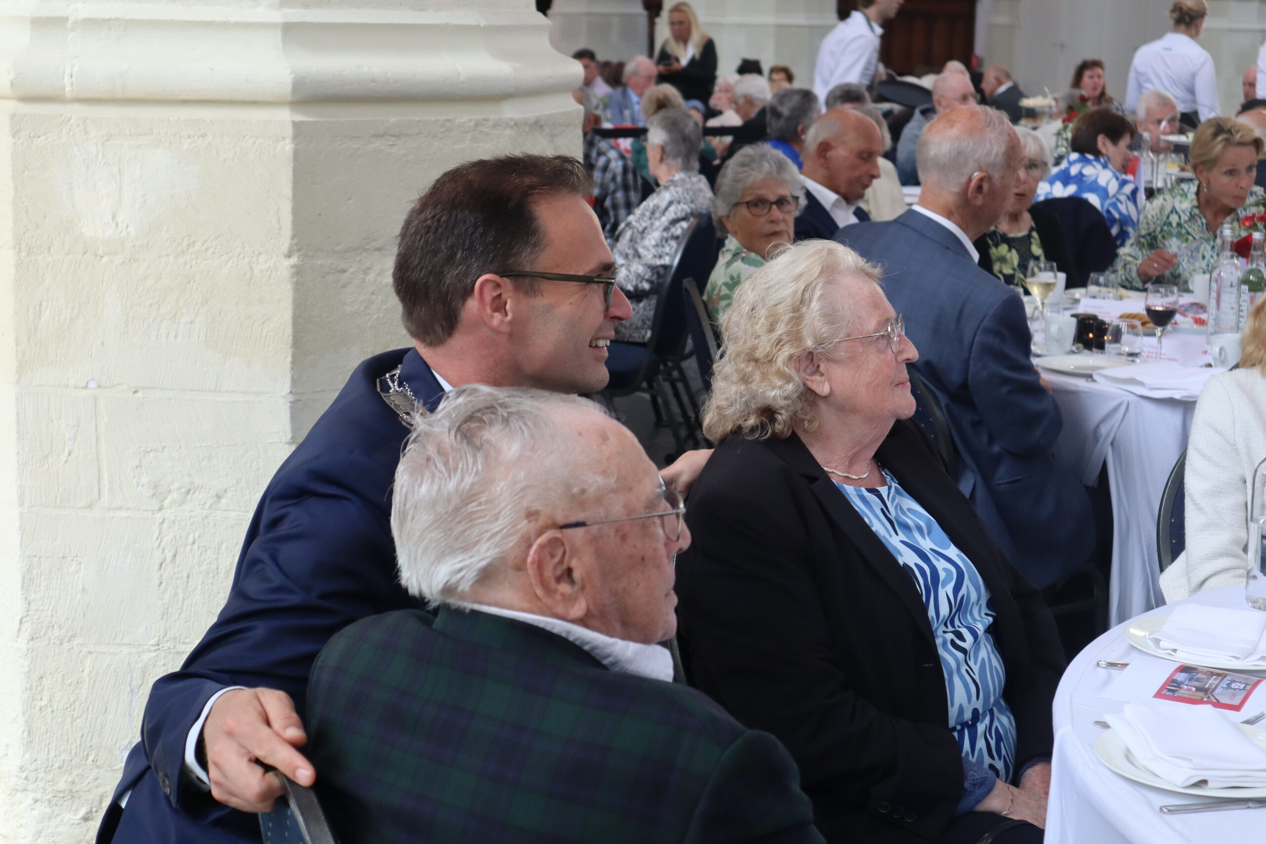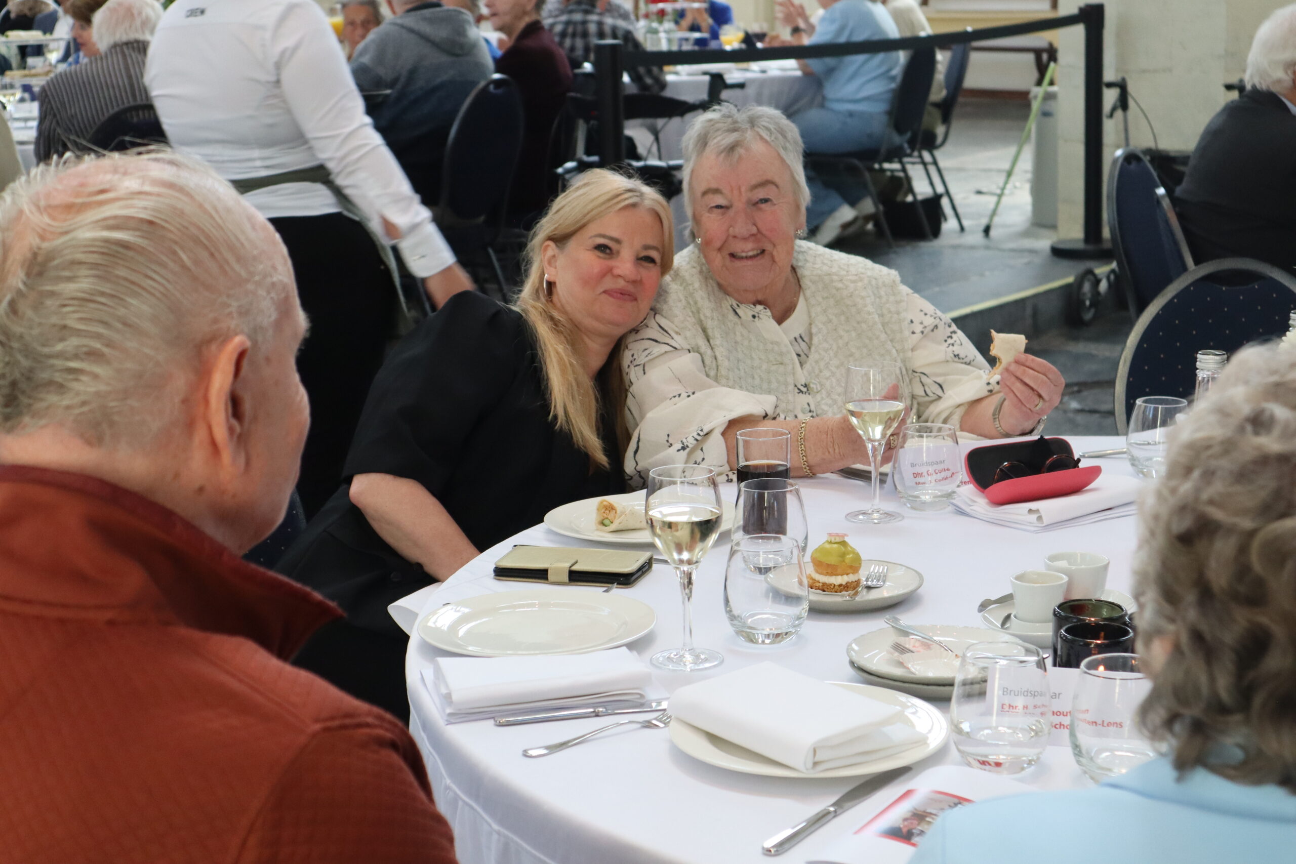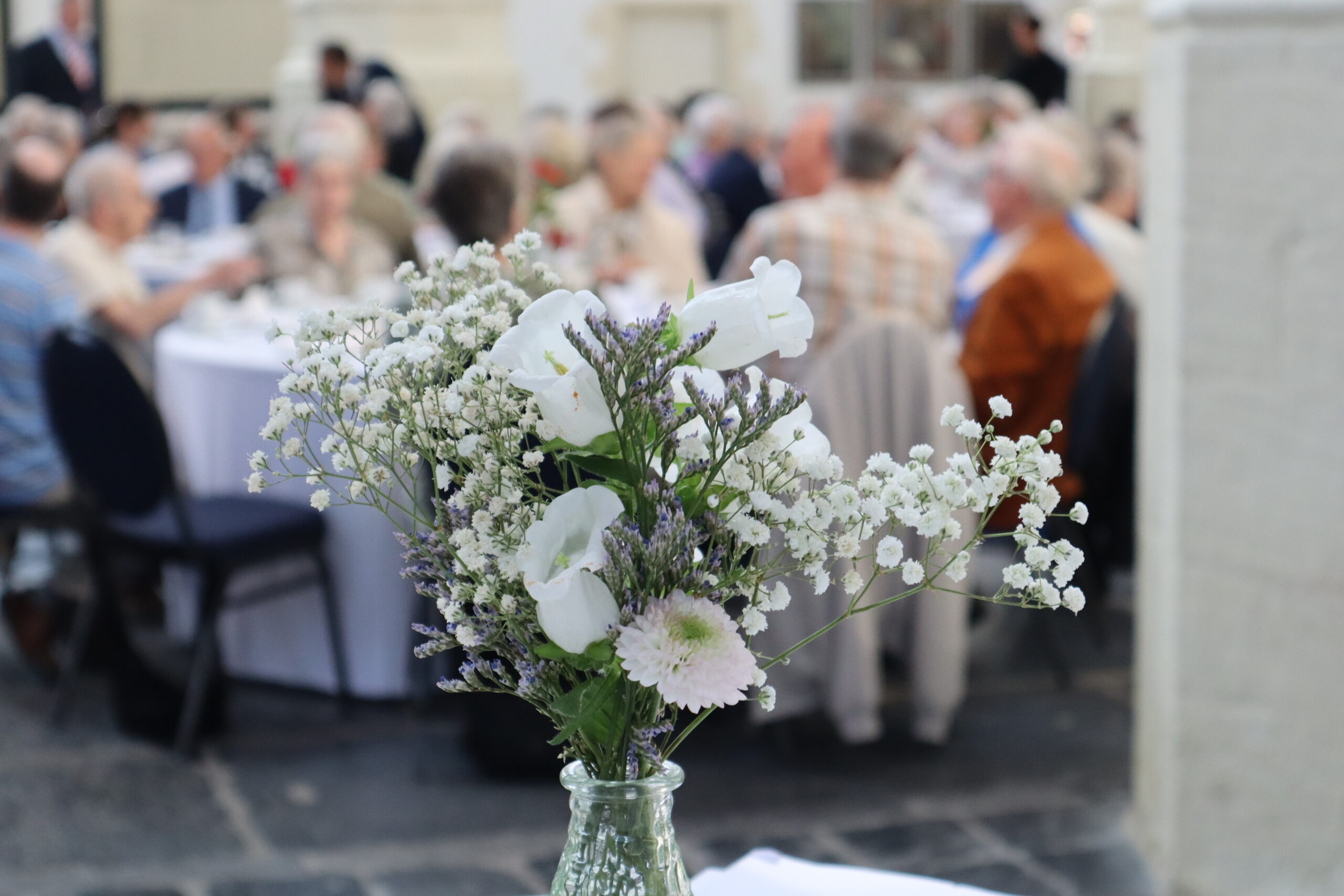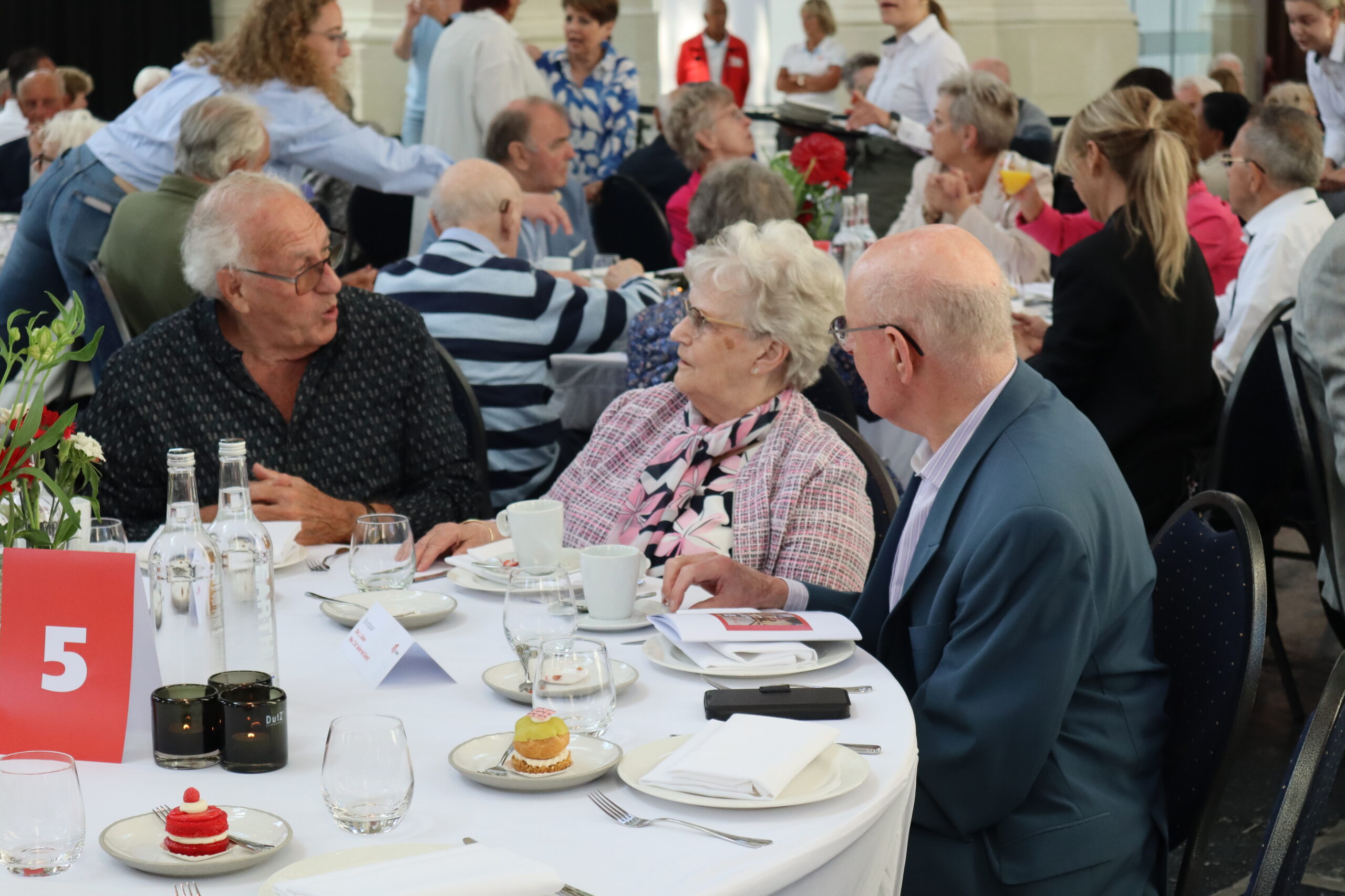 Aan grote ronde tafels luisterden de stellen naar zijn woorden, waarna het muzikale duo Hugo en Bianca zorgde voor nostalgische klanken. “Het is bijzonder om dit met mijn vrouw mee te maken”, zei een van de aanwezige mannen zichtbaar ontroerd.