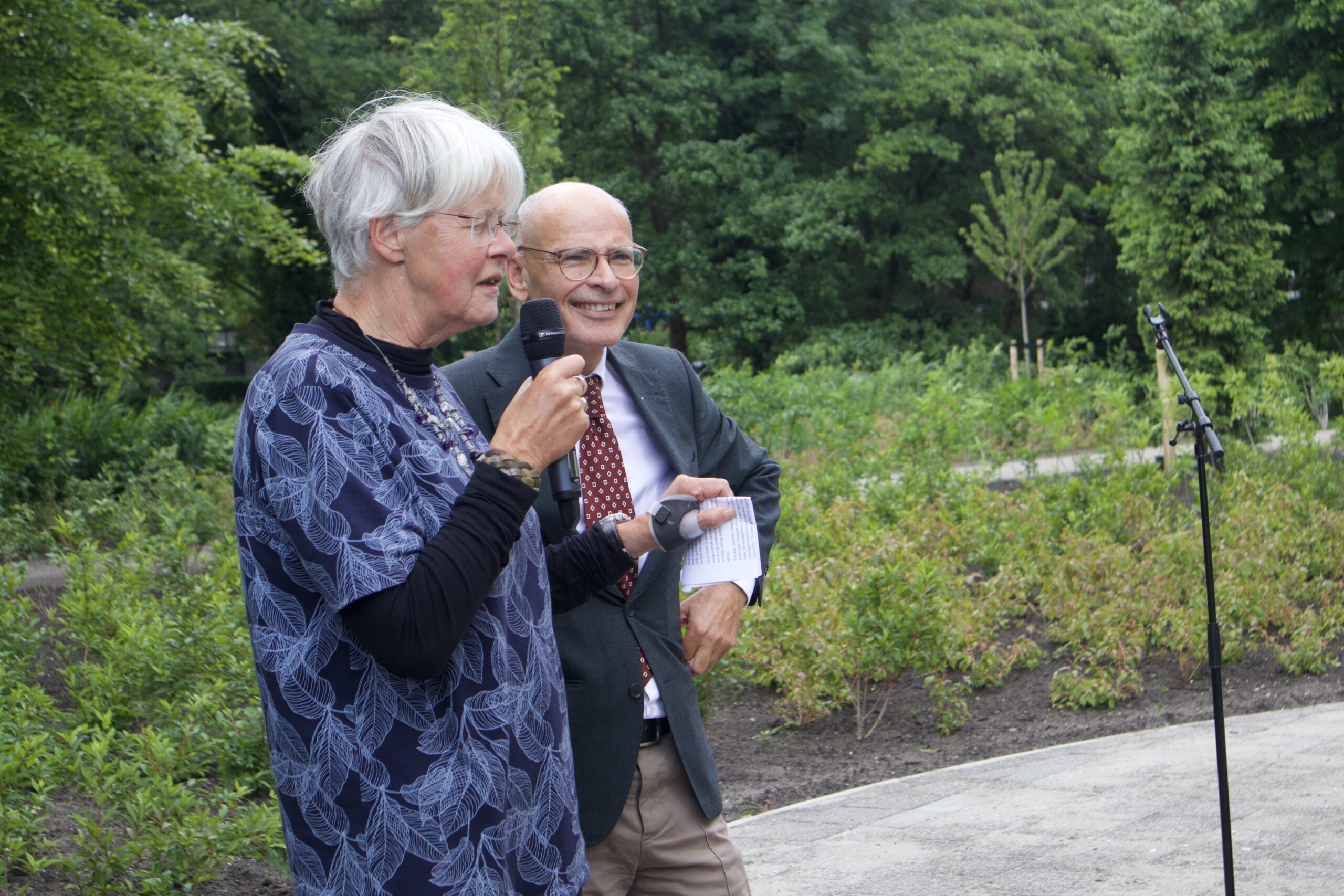 Burgemeester Emile Jaensch in gesprek met Janna Verwer over de Hiroshimaboom.