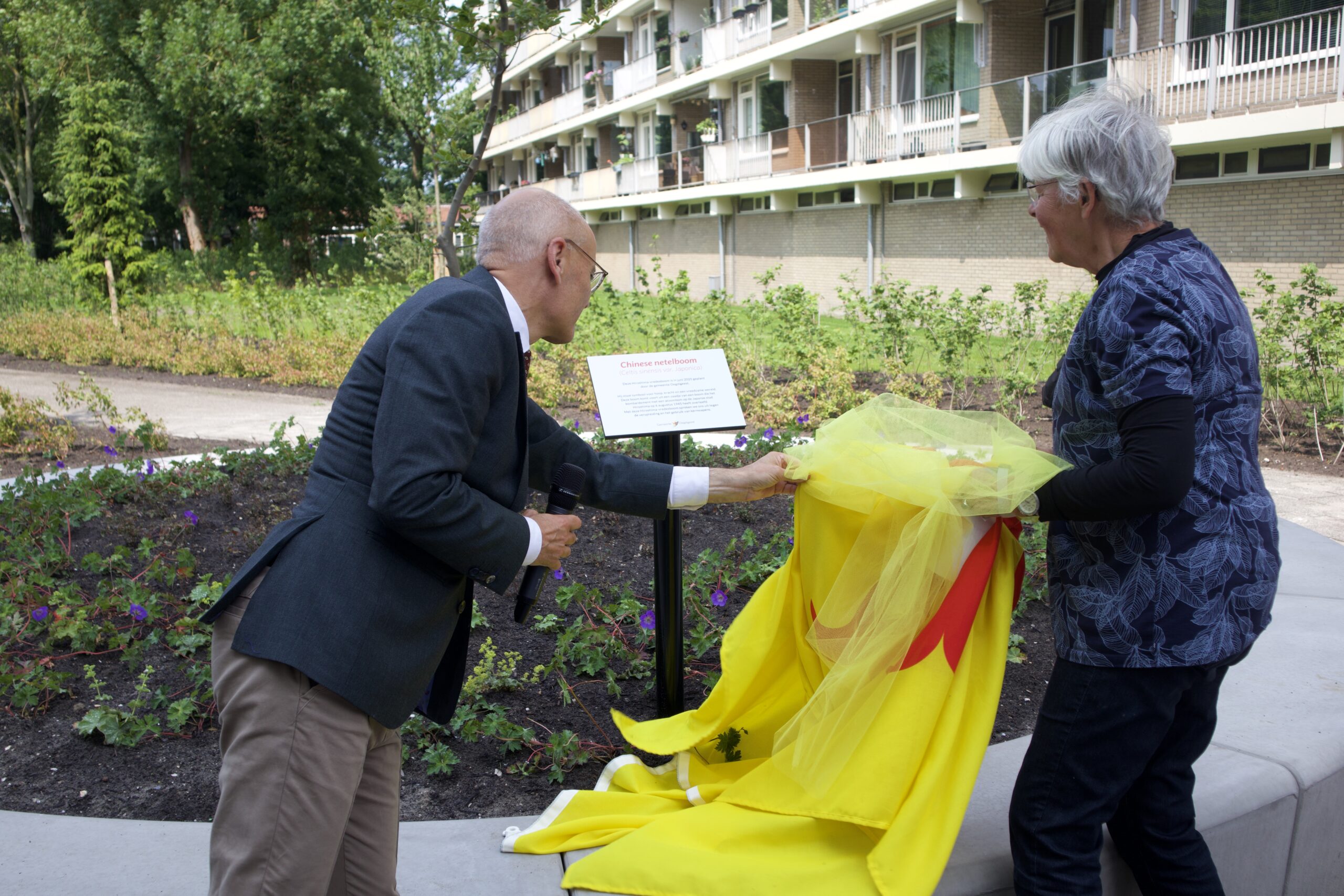 Oegstgeest is een bijzondere boom rijker: een heuse Hiroshimaboom, een zogenoemde Chinese netelboom. De boom werd feestelijk onthuld op het plein tussen de Rozenlaan en de Frans Halslaan. Een grote groep enthousiaste buurtbewoners was aanwezig bij het moment, waarbij burgemeester Emile Jaensch samen met bioloog en initiatiefneemster Rinny Kooi het informatiebord bij de boom onthulde.