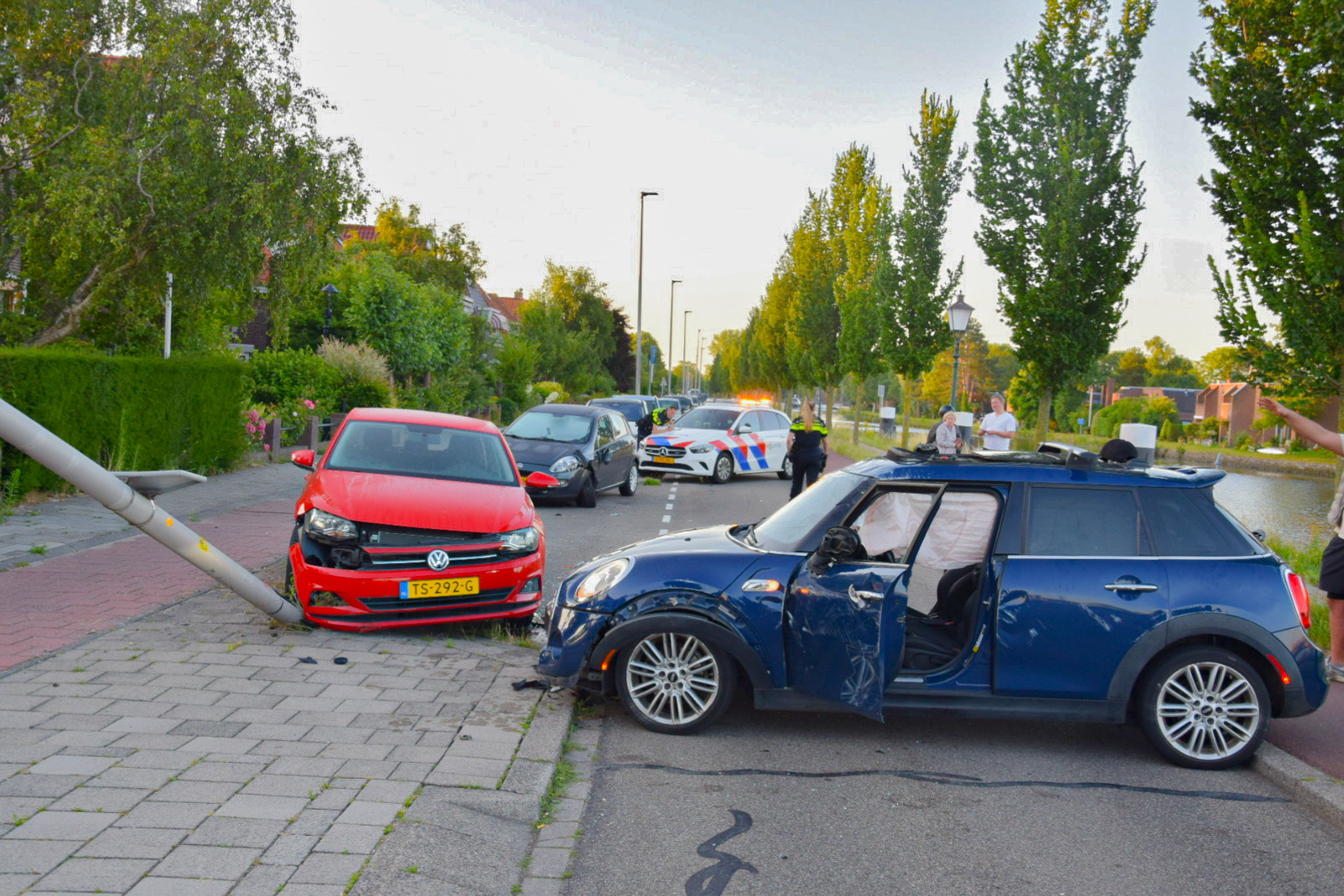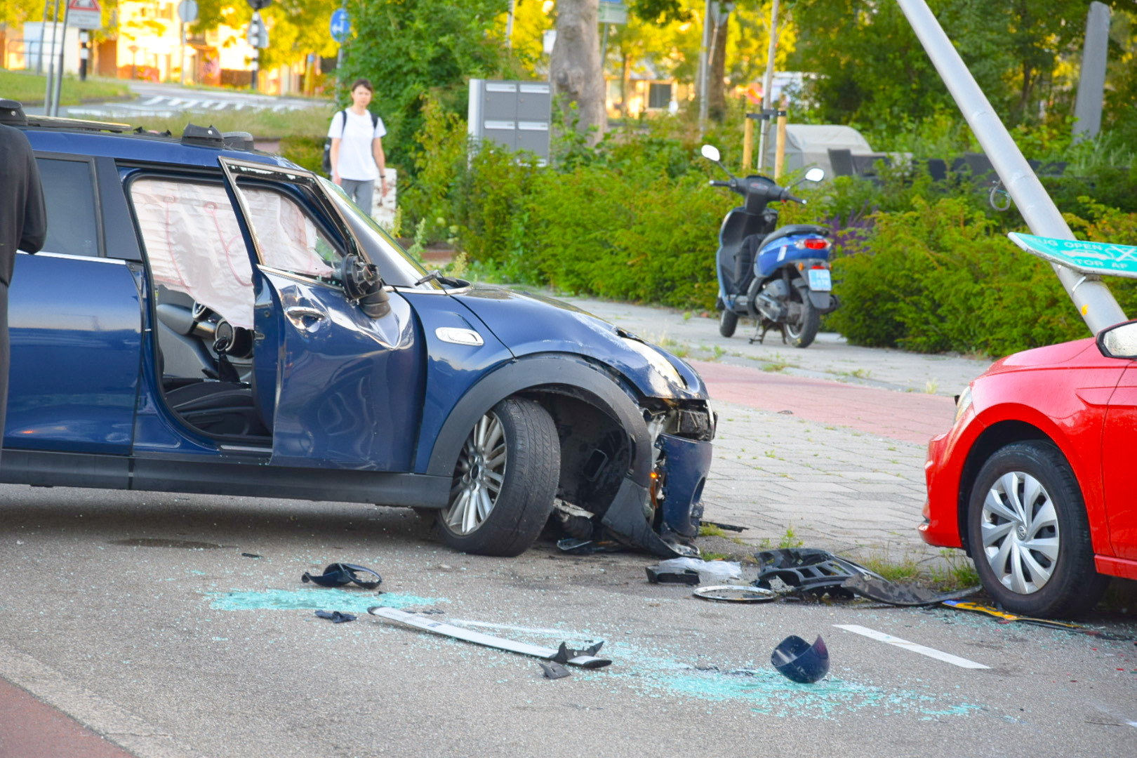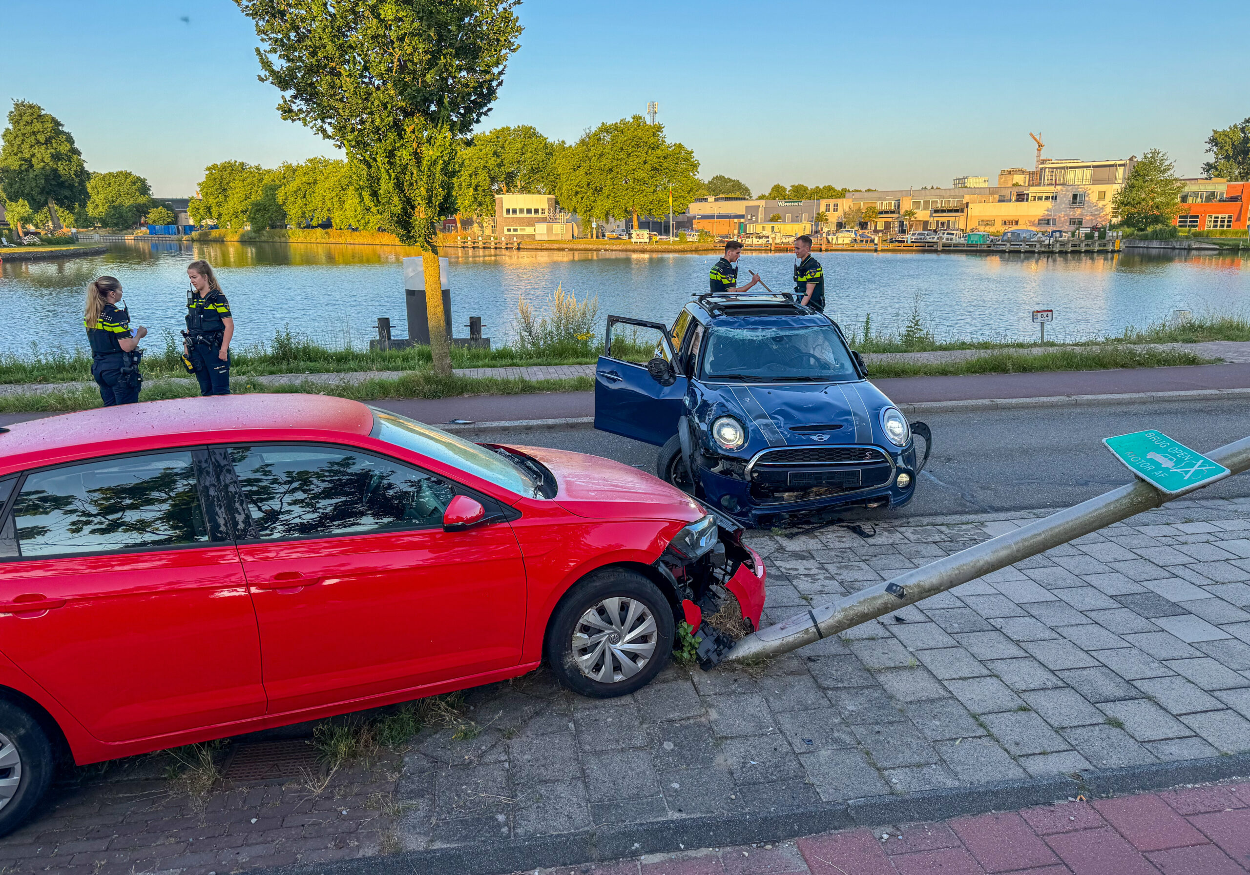 Op de Van der Valk Boumanweg in Leiderdorp is zondagochtend vroeg een eenzijdig ongeval gebeurd waarbij een auto over de kop is geslagen. De bestuurder van een blauwe Mini ramde eerst twee geparkeerde auto’s en kwam daarna ondersteboven op de weg terecht. Door de klap reed een van de geparkeerde auto’s een lantaarnpaal omver.
