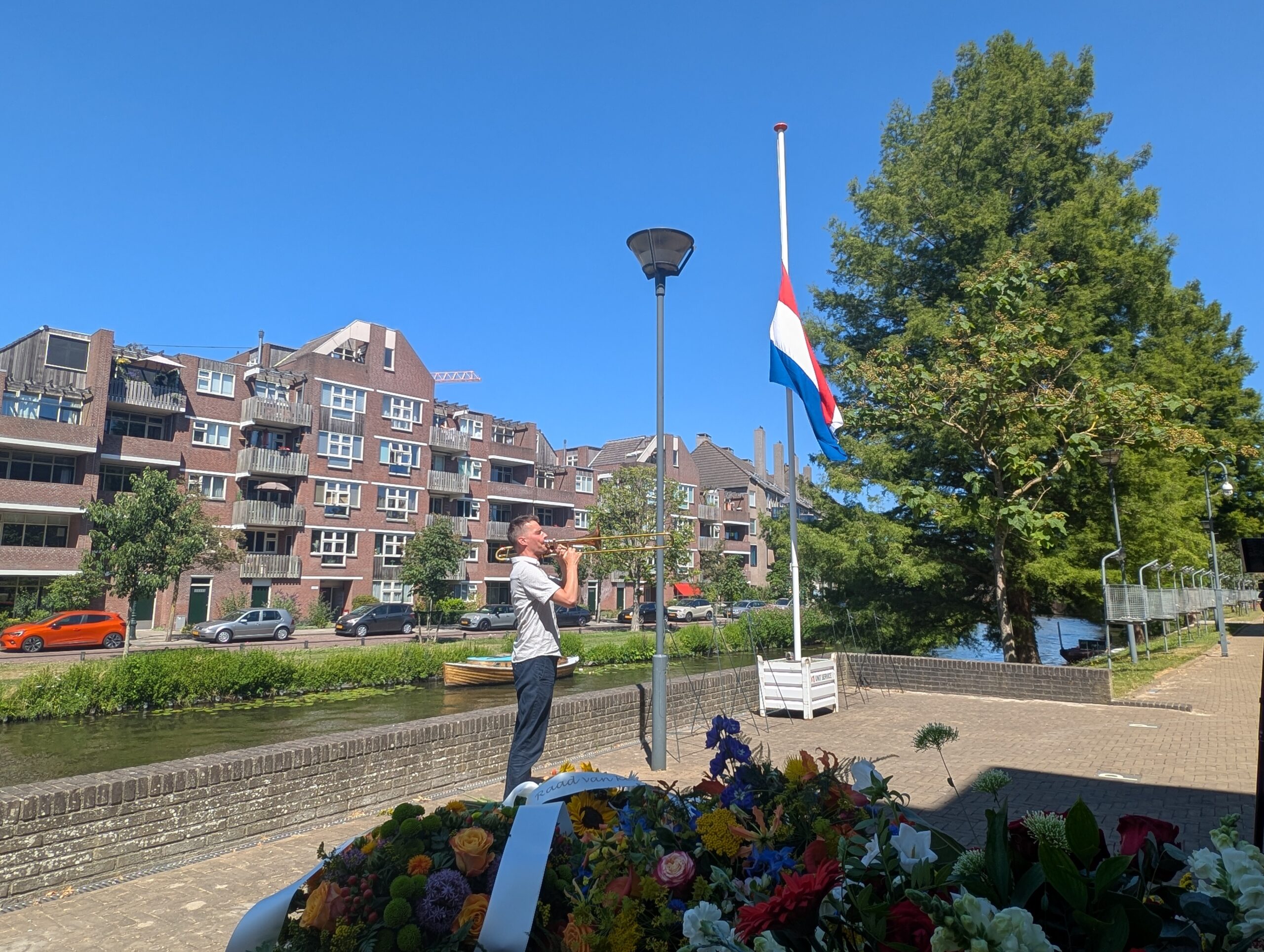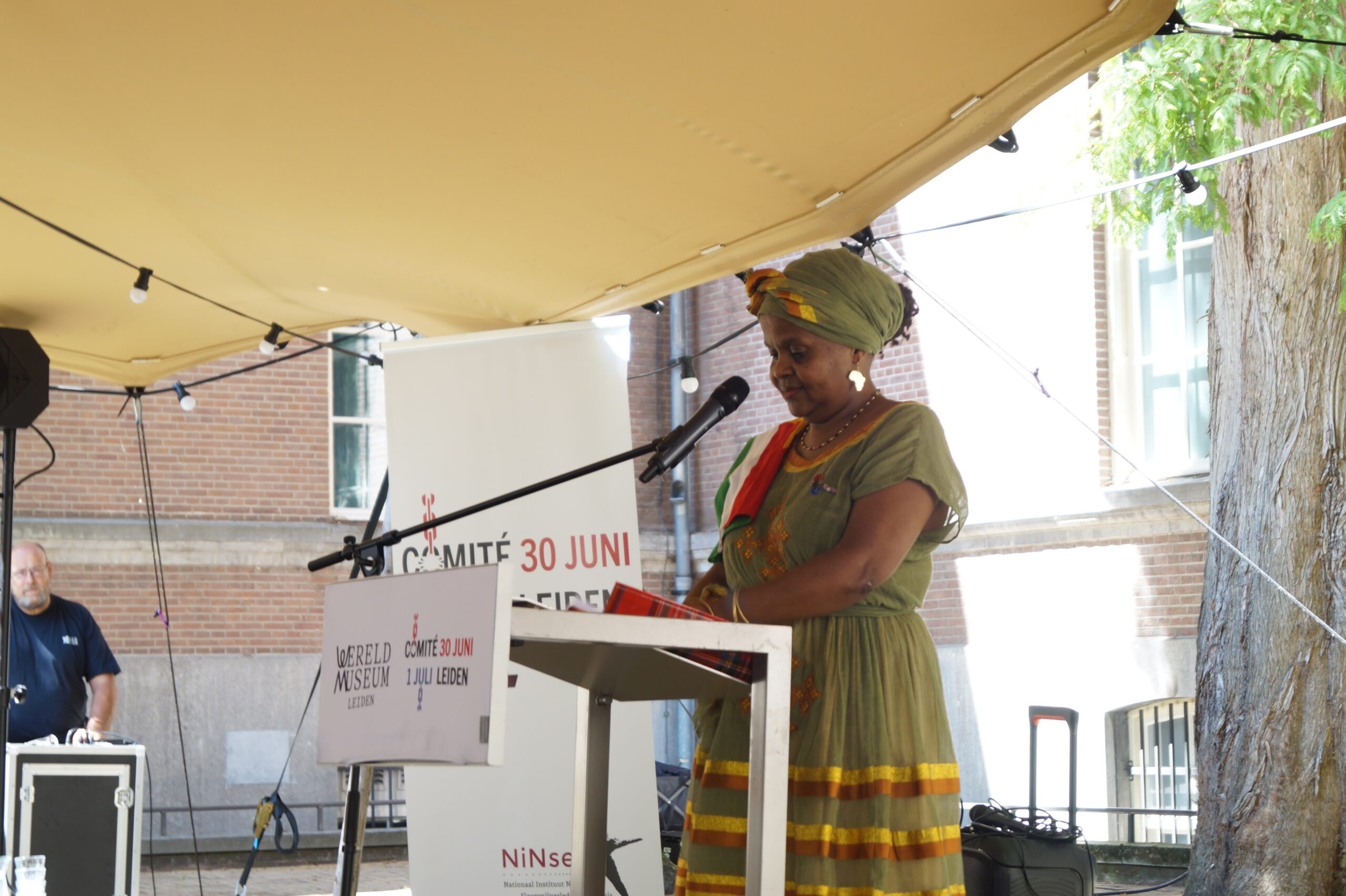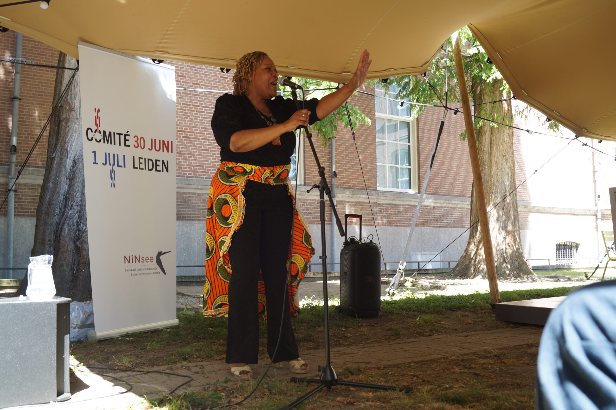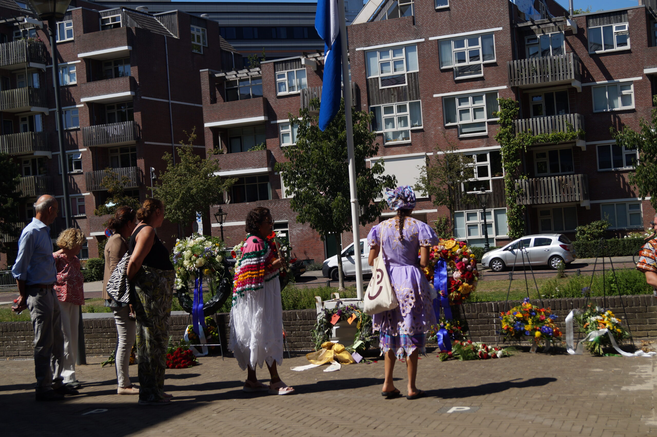 Hierna volgden traditiegetrouw een plengoffer om de goden en moeder aarde te groeten en kracht te vragen voor iedereen. Gevolgd door een toespraak van Jacintha Groen, voorzitter Comité 30 juni/1 juli Leiden, waarin zij de huidige situatie in de wereld benoemde om duidelijk te maken waarom herdenken volgens haar zo belangrijk is. “Laten we vasthouden aan dat eenvoudige, maar geweldige artikel één van onze grondwet. Dat luidt: alle die zich in Nederland bevinden, worden in gelijke gevallen gelijk behandeld. Discriminatie op welke grond dan ook is niet toegestaan. Eigenlijk zou het verder moeten gaan dan een verbod op discriminatie; ik zou liever een gebod op compassie willen zien. Zoals de wereldreligies voorschrijven”.