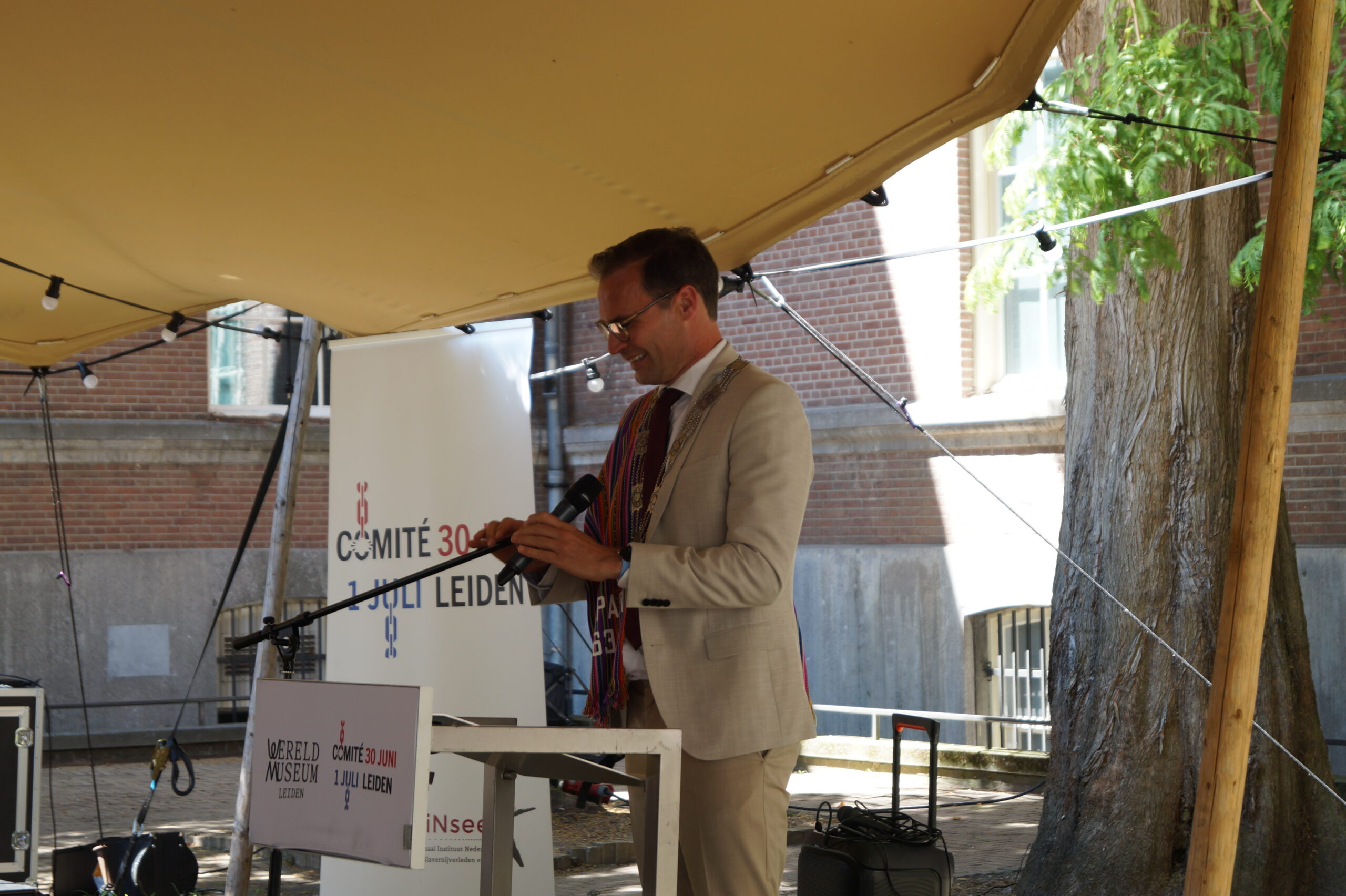 Op deze dag mocht ook muziek niet ontbreken. Helianthe Redan zong twee liederen in het teken van strijd, kracht en verbinding. Hierna hield Peter Heijkoop, burgemeester van Leiden, een toespraak. Hierin benoemde hij meermaals het onderzoek naar het slavernijverleden van Leiden. “Dit heeft ons niet alleen kennis gegeven, maar ons ook nadrukkelijk een spiegel voorgehouden”. Ook de vervolgstappen die de gemeente wil gaan nemen werden benoemd “We gaan ook in gesprek met de stad, om te bepalen hoe, dus niet of, maar hoe we als stadsbestuur op gepaste en betekenisvolle wijze excuses kunnen maken”.