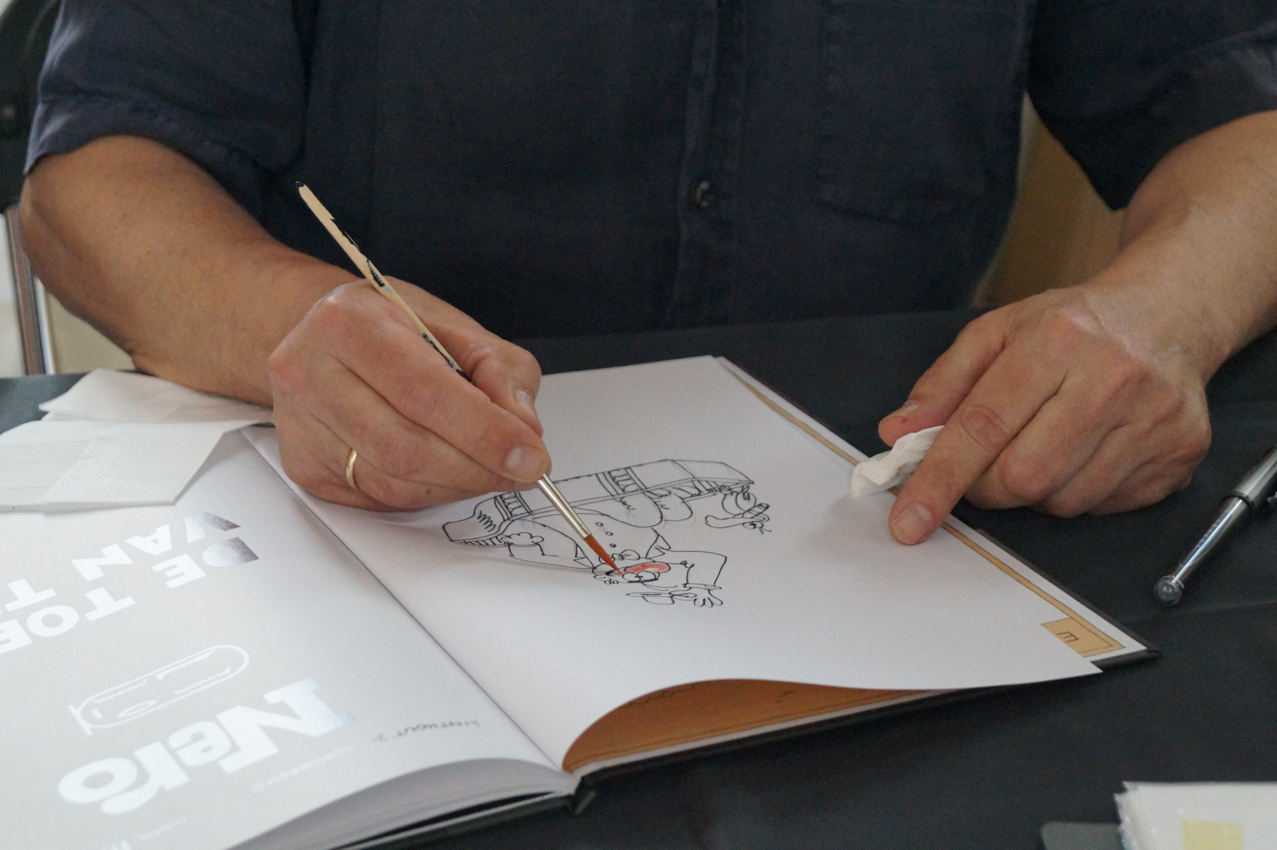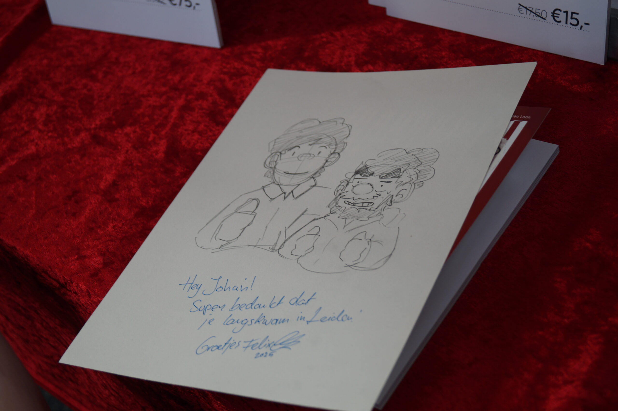 “Je merkt wel, dit is de eerste keer, dus het moet allemaal nog een beetje op gang komen. Maar tot nu toe heb ik hele leuke gesprekken gehad en een hoop leuke tekeningen mogen maken”, vertelt Felix van Loon, een van de aanwezige striptekenaars.
