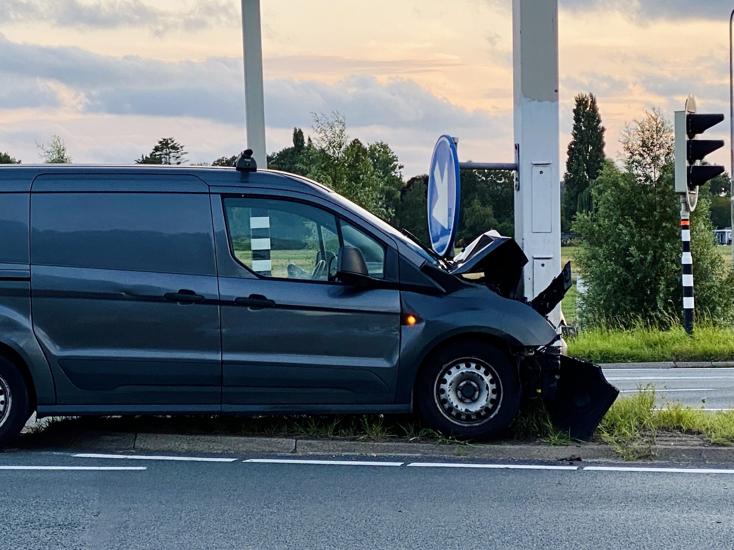 De eenzijdige botsing gebeurde maandag rond 20.45 uur. De paal boorde zich in de motorkap van het busje. Deze moest worden weggesleept.