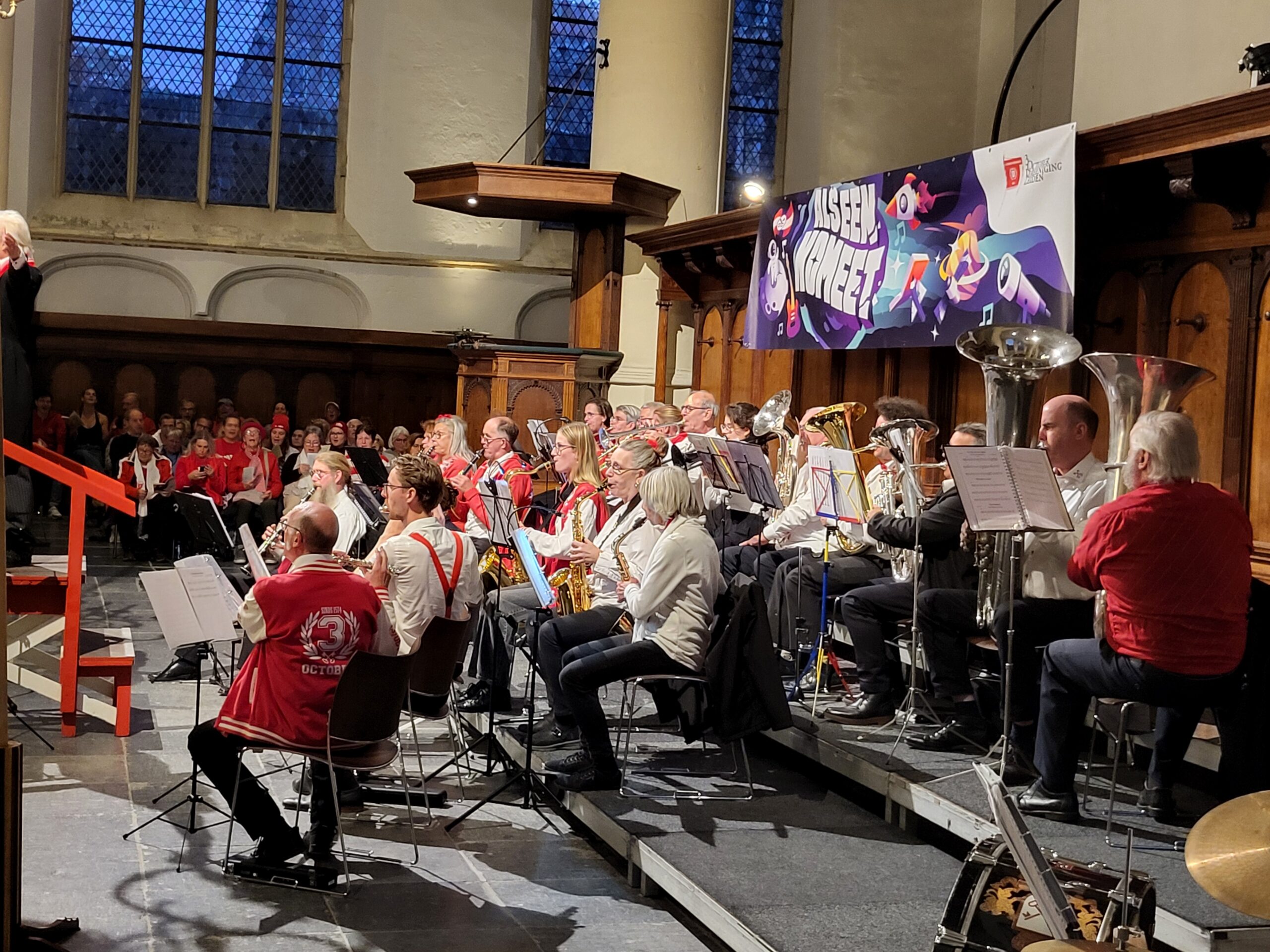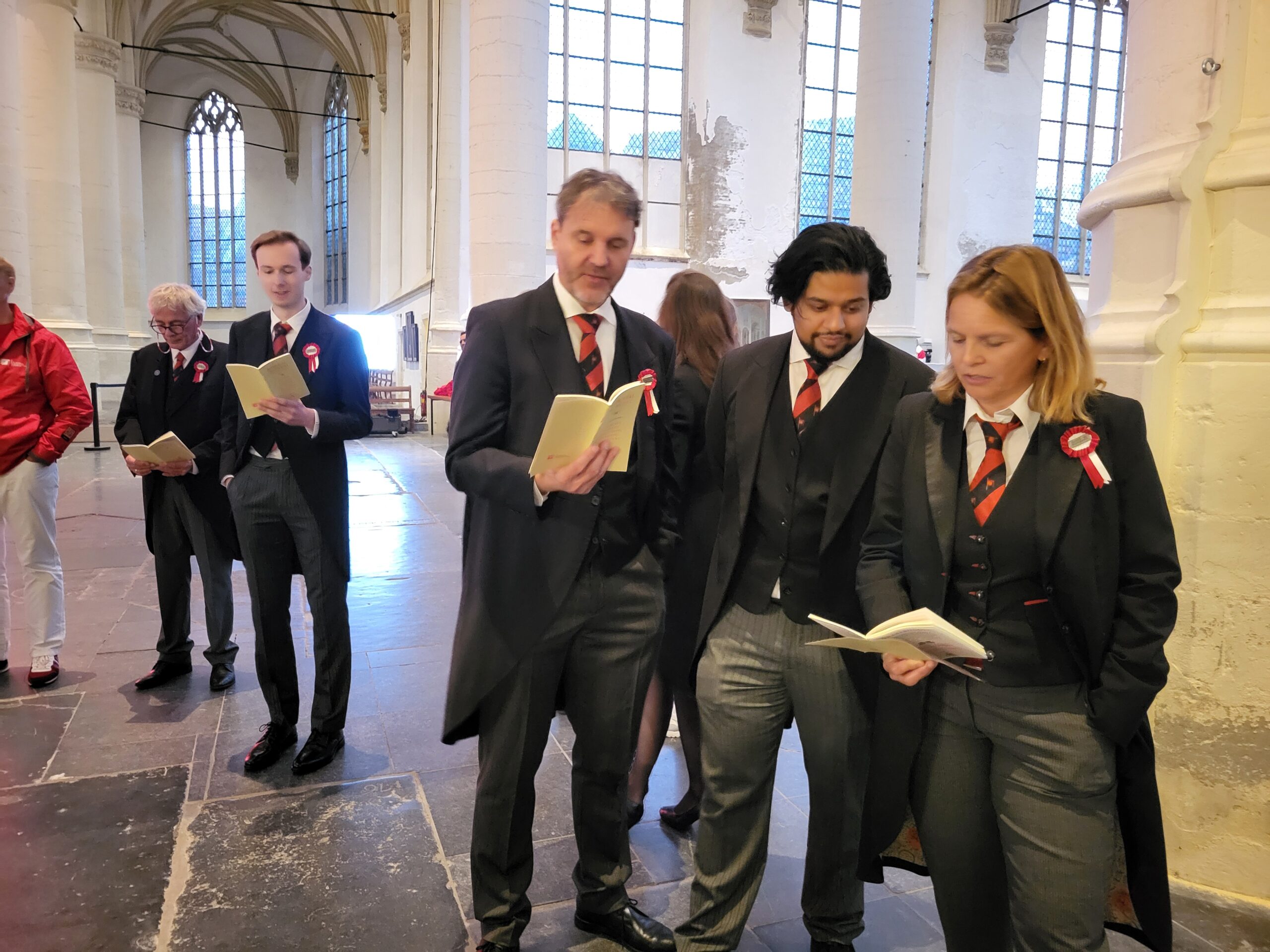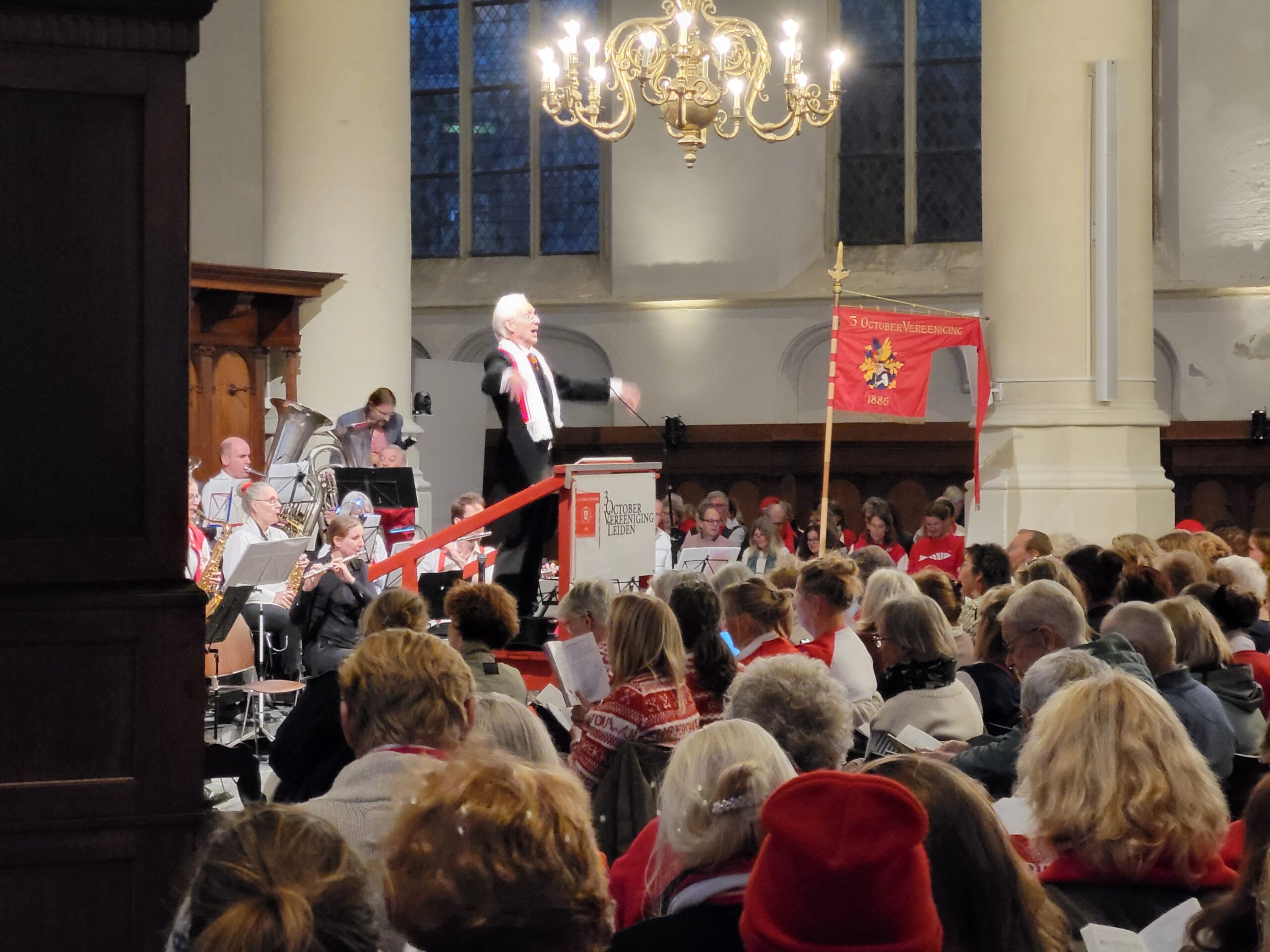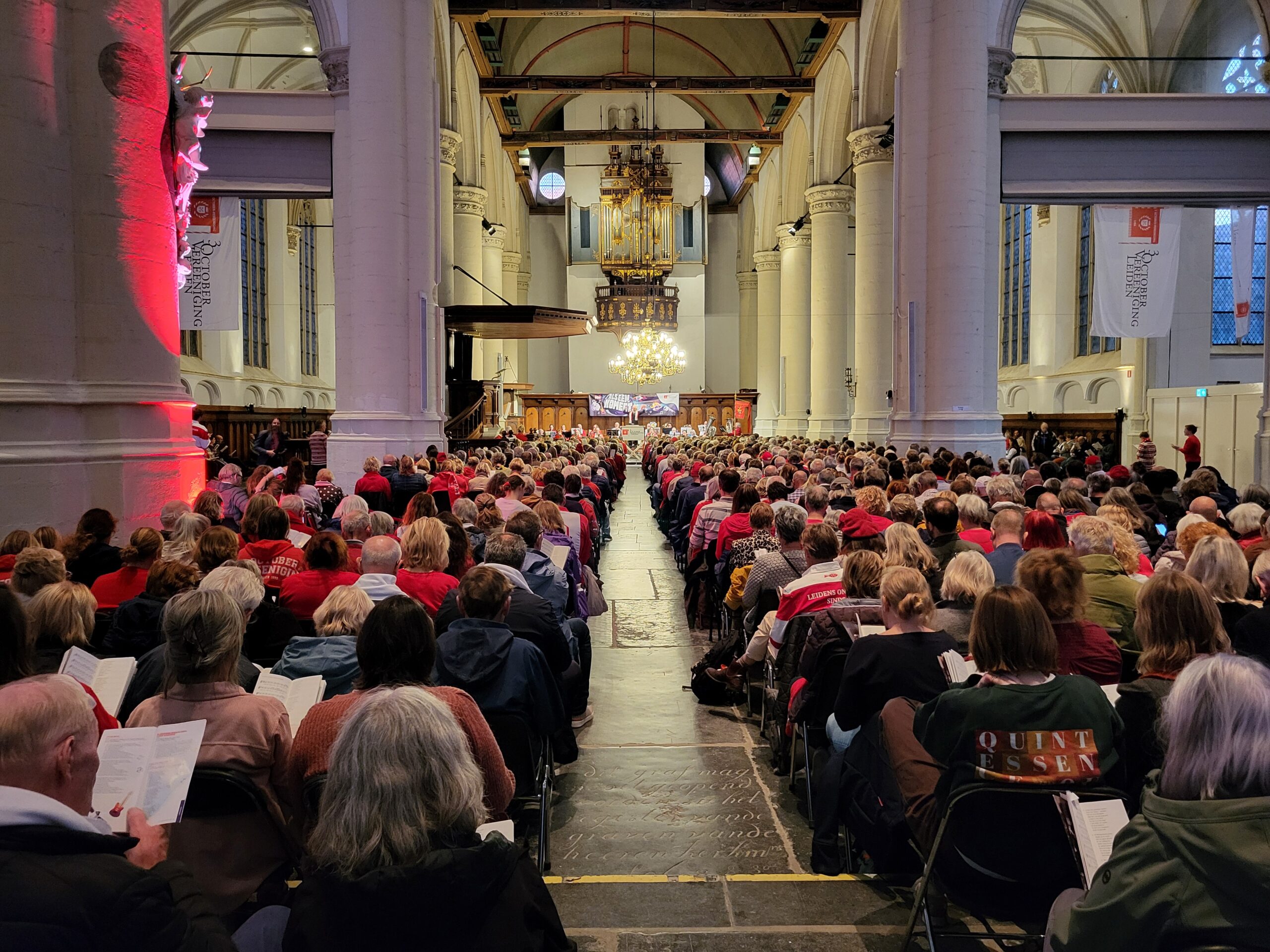 In een volle, rood wit uitgelichte Hooglandse Kerk, werd woensdagavond door Leidenaren de liederen van het Koraalzang geoefend. Onder leiding van dirigent Wim de Ru werden liedjes zoals ‘Waar de blanke top der duinen’ en ‘Leidens Ontzet’ gezamenlijk gezongen.