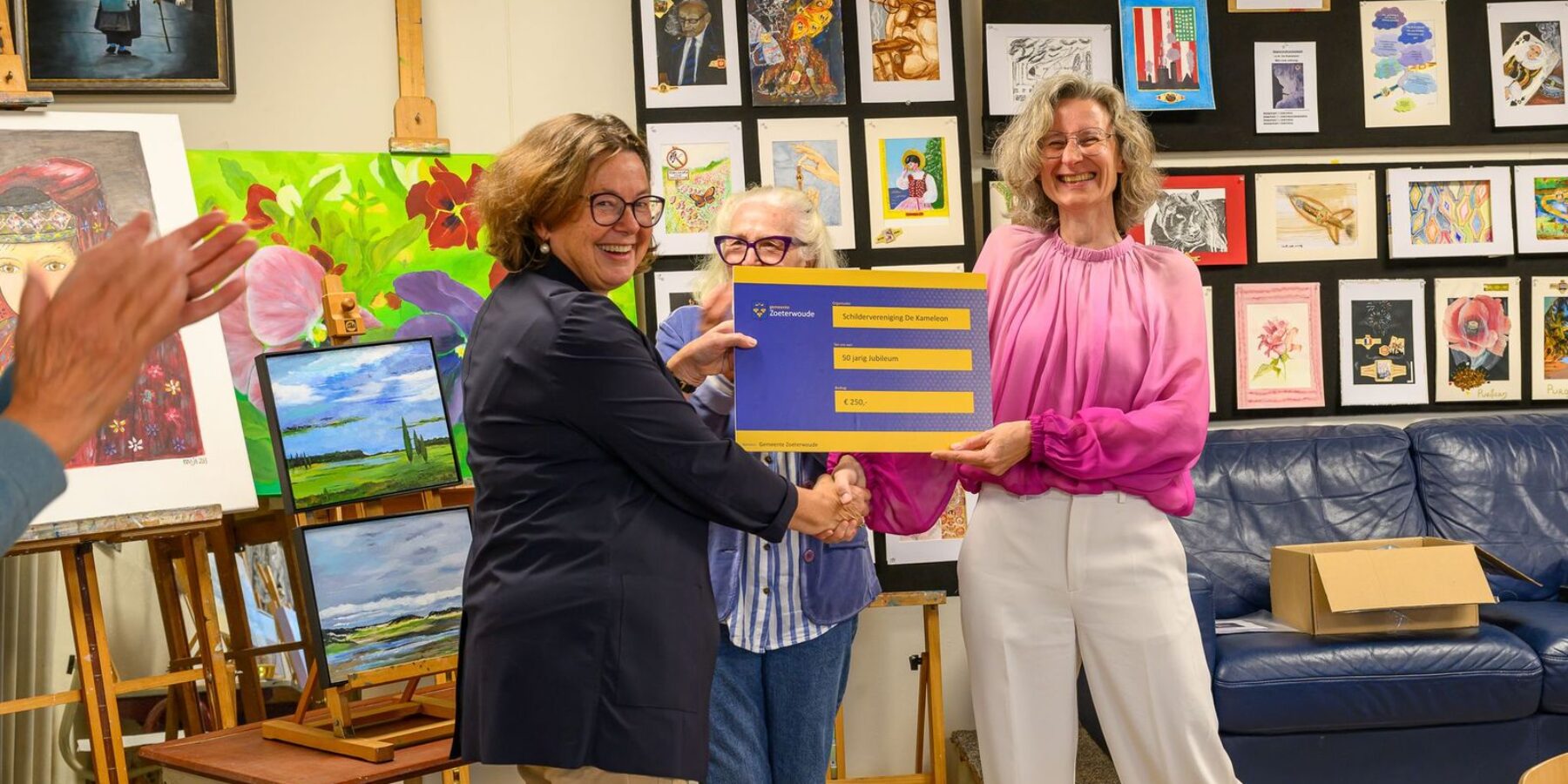 Namens de gemeente Zoeterwoude overhandigde wethouder Kunst en Cultuur Moniek van Sandick een cheque ter waarde van 250 euro aan de vereniging. “Kunst en cultuur brengen mensen samen, inspireren en versterken de verbinding in ons dorp. De Kameleon laat al vijftig jaar zien hoe waardevol het is dat inwoners hun creativiteit met elkaar delen,” aldus de wethouder.