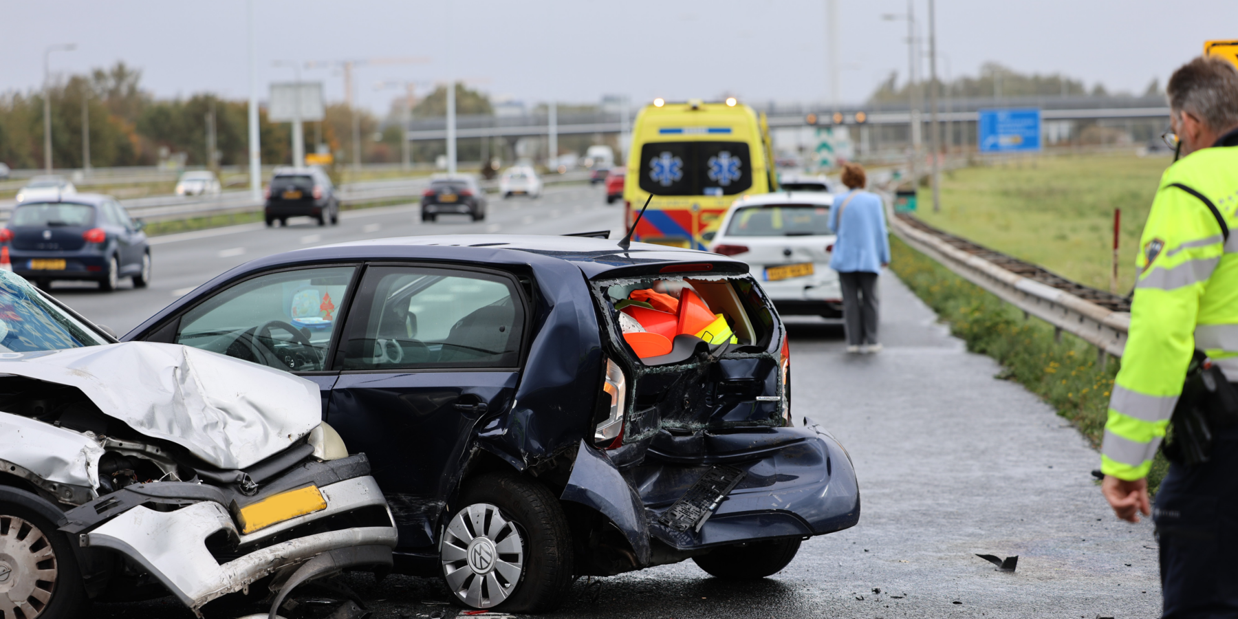 Op de hoofdrijbaan van snelweg A4 bij Leidschendam zijn zondagmiddag meerdere voertuigen met elkaar in botsing gekomen. Drie auto’s botsen op elkaar. Ondanks dat de voertuigen zwaar beschadigd raakten, raakten de inzittenden niet (zwaar) gewond.