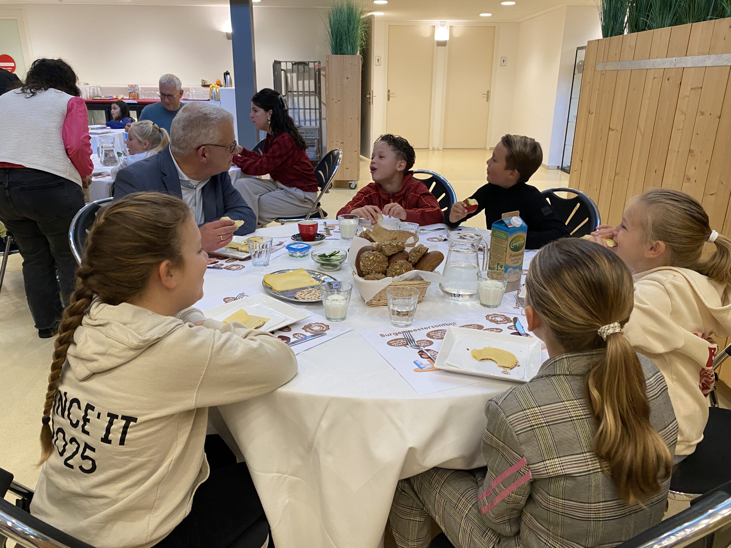 “Het is heel belangrijk want het geeft leerlingen de juiste energie om te leren”, vertelt onderwijswethouder Romeijn aan zijn tafelgenoten uit groep 6. De meeste kinderen blijken al veel van voeding te weten. “Ze konden precies benoemen wat gezond is en wat iets minder gezond is. En bijna iedereen eet ’s ochtends iets, heel goed om te horen”, zegt hij.