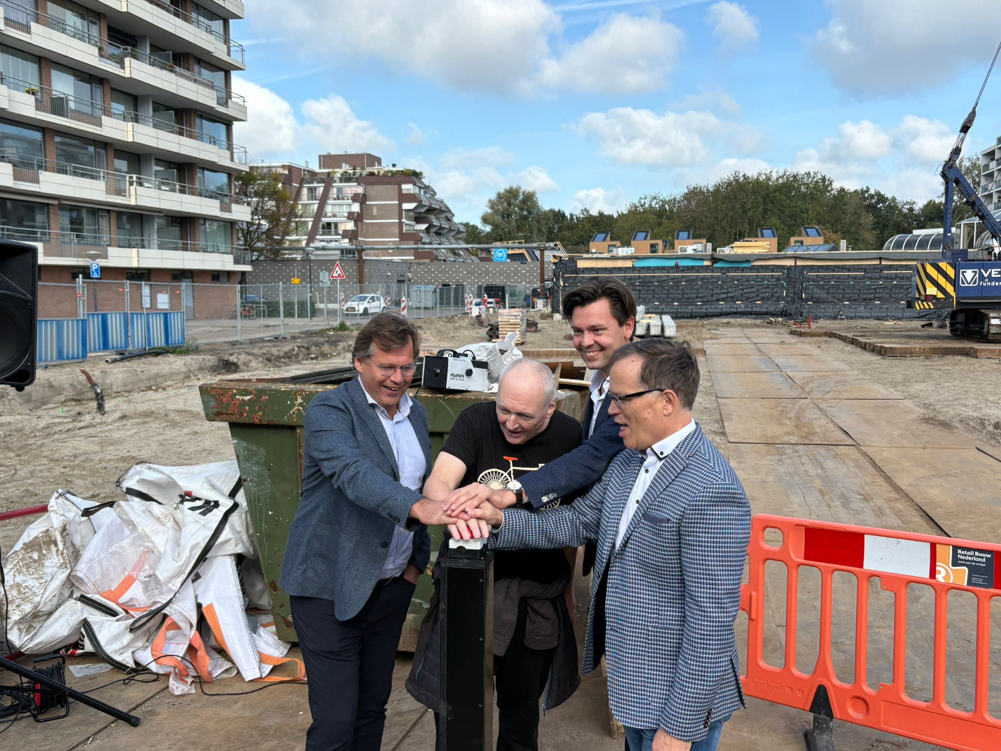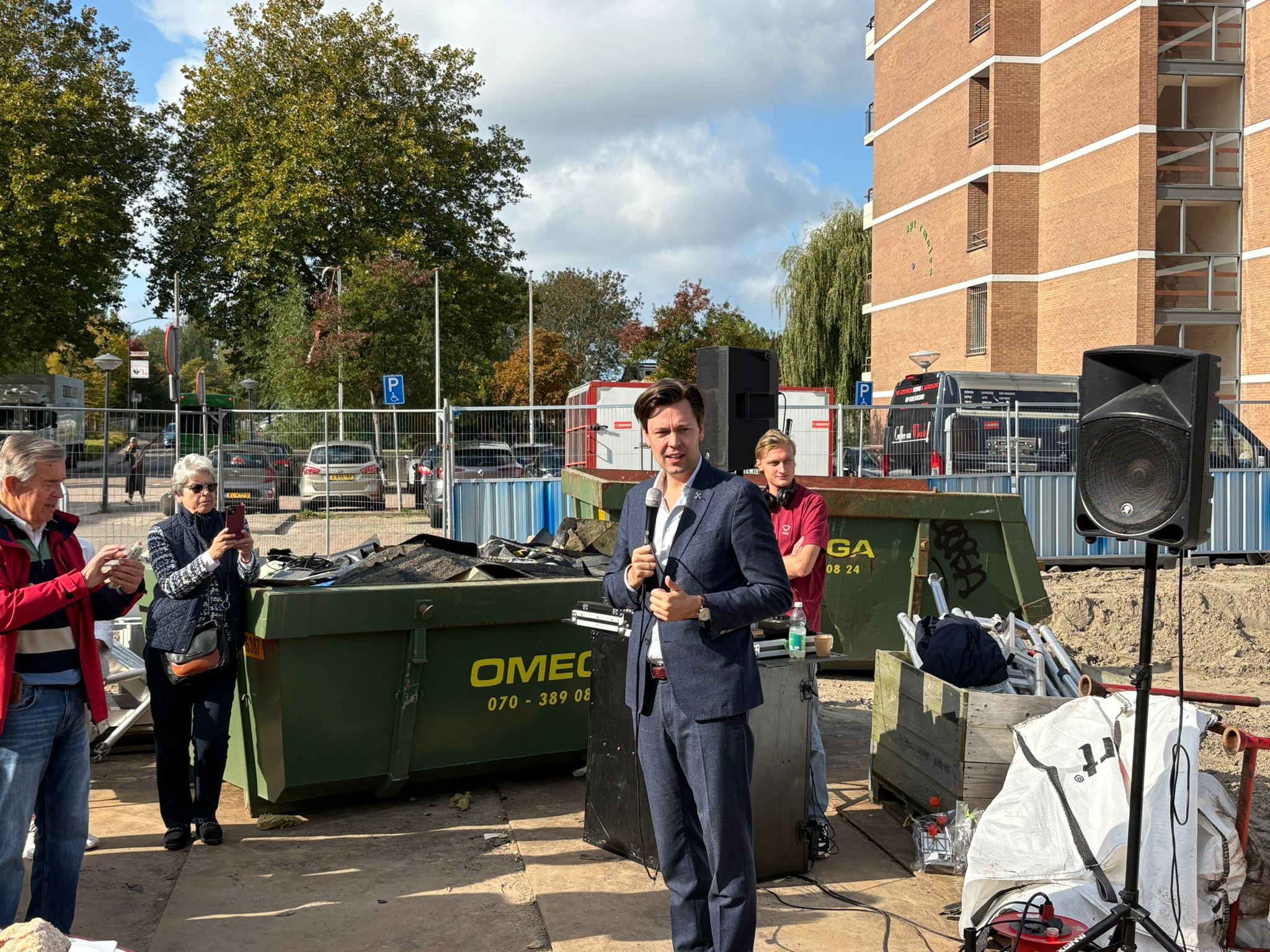 Bouwwethouder Julius Terpstra had vrijdag, samen met buurtbewoners en de ontwikkelaar van het gebied, de eer om met een druk op een knop het startsein te geven voor de nieuwe ondergrondse parkeergarage bij winkelcentrum De Kopermolen in de Leidse Merenwijk.