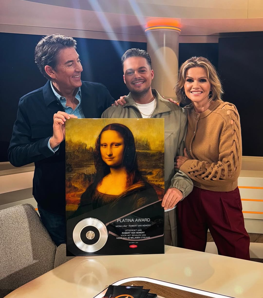 De Leidse zanger Robert van Hemert is maandag verrast met een Platina Award voor zijn single ‘Mona Lisa’. Op Instagram deelde hij zijn blijdschap: “Ik werd gisteren super verrast! Bij mijn lieve vrienden van Shownieuws, met een PLATINA AWARD voor ‘Mona Lisa’! Wat ben ik enorm trots op deze! Jullie hebben het liedje laten lukken, dankjewel allemaal!”