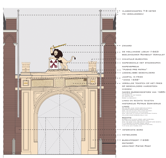 De Burchtpoort in het centrum van Leiden wordt komend voorjaar gerestaureerd. Net als dertig jaar geleden wordt het metselwerk hersteld en de poort schoongemaakt. Hij zal er ook anders uit gaan zien. De poort krijgt namelijk zijn historische kleuren terug. Uit onderzoek blijkt dat de poort ooit grijs was en de leeuw er bovenop rood.