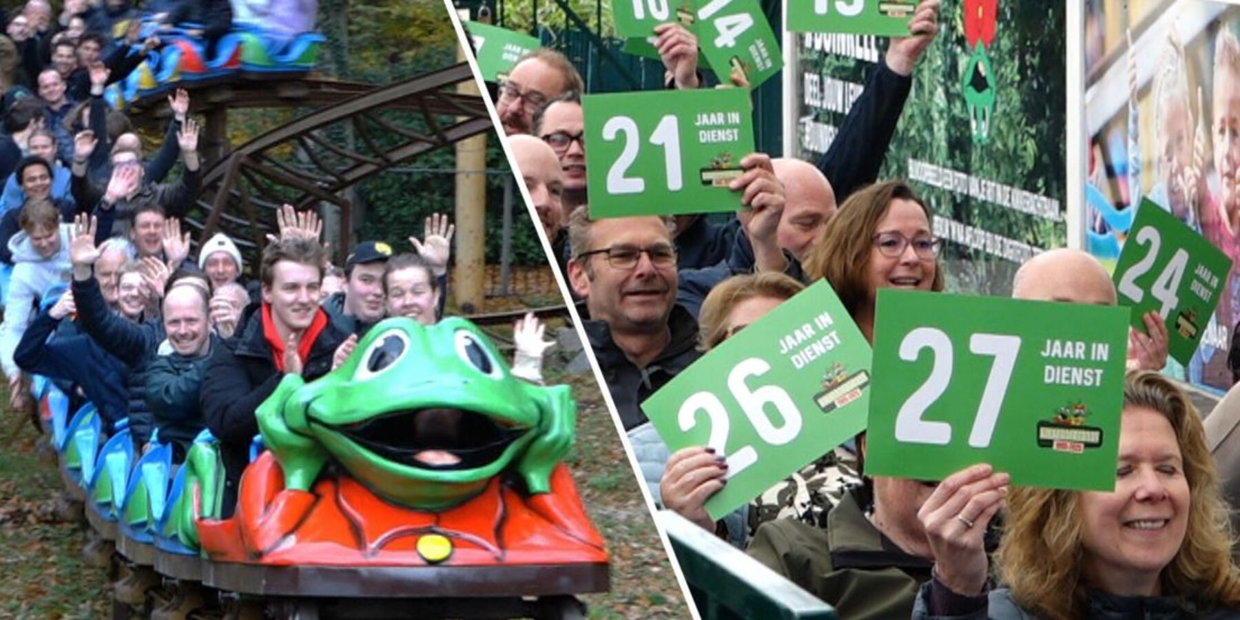 Het is maandagochtend nog stil in het attractiepark, maar voor de Kikkerachtbaan komen alle werknemers van het park bij elkaar en barst de viering los. “Het is gezellig om dit met elkaar te doen”, zegt Thomas, leidinggevende van alle attractiemedewerkers.