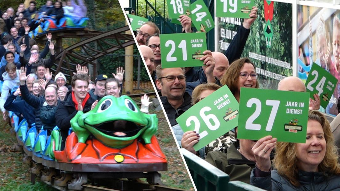 Werknemers van attractiepark Duinrell namen na 40 jaar voorgoed afscheid van de iconische Kikkerachtbaan. Maandagochtend maakte de attractie haar allerlaatste meters. Werknemers die er het langst in dienst zijn, kregen de eer om als passagiers te fungeren. Ze zitten op volgorde van dienstjaren in de attractie.