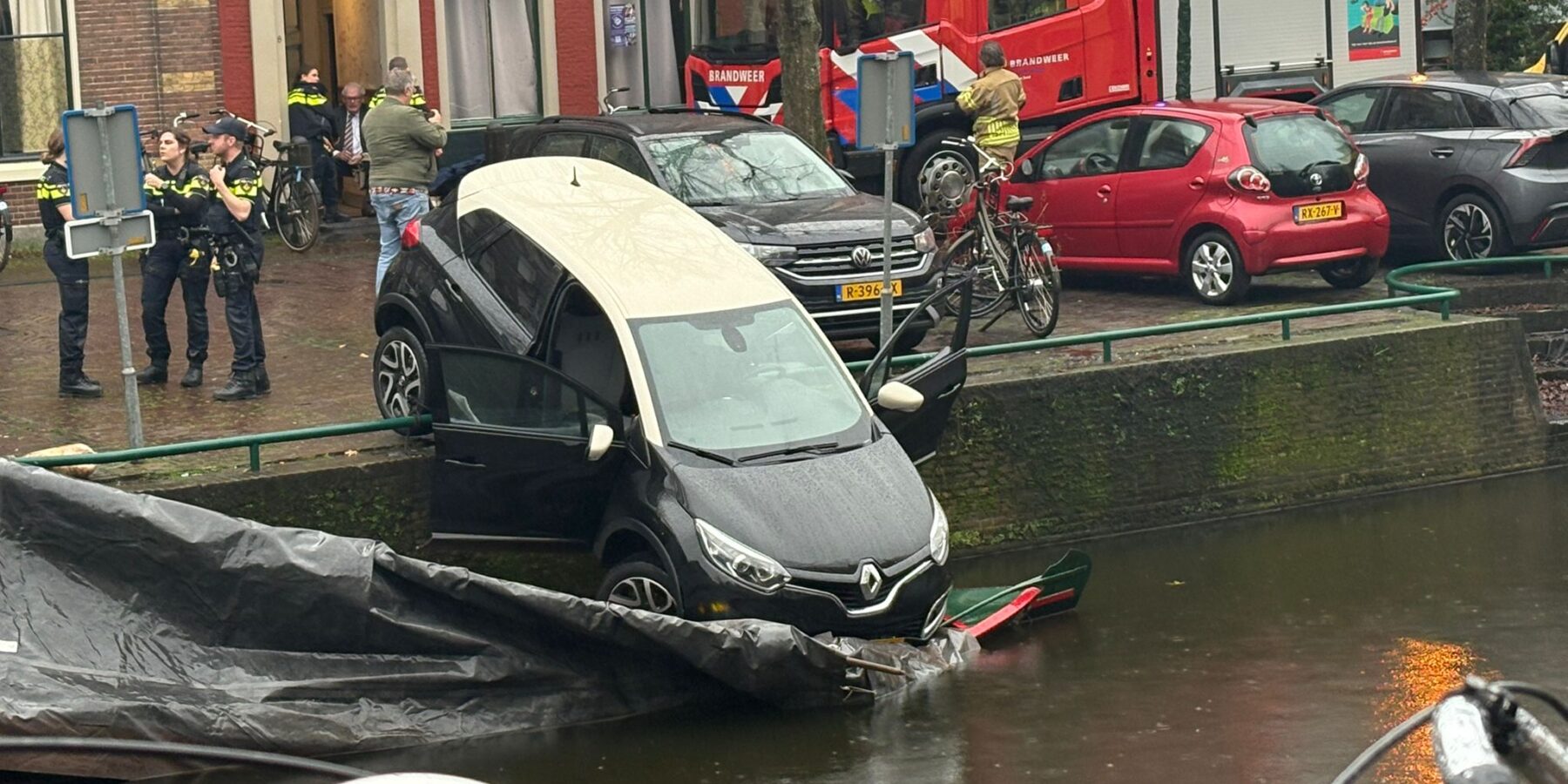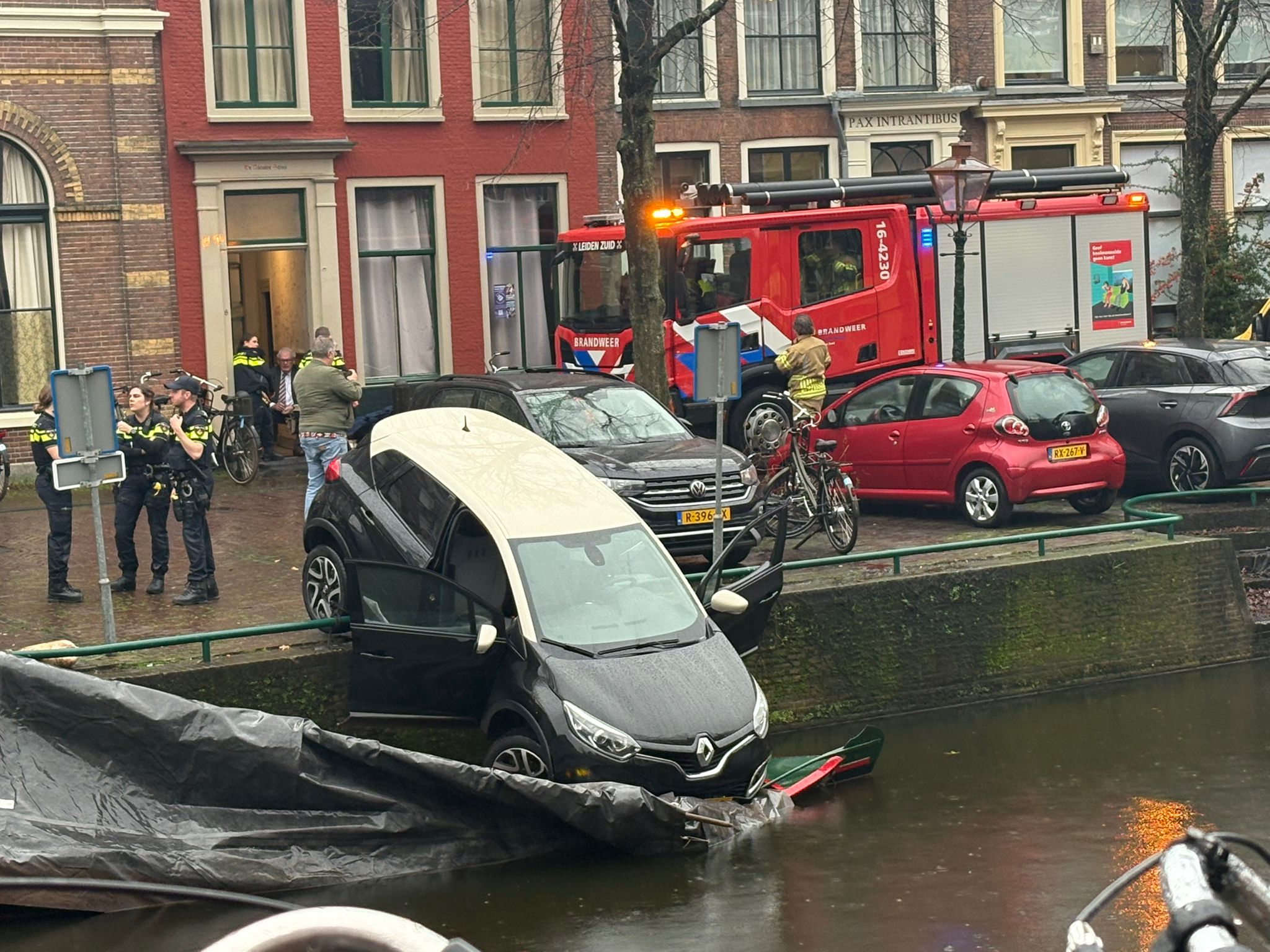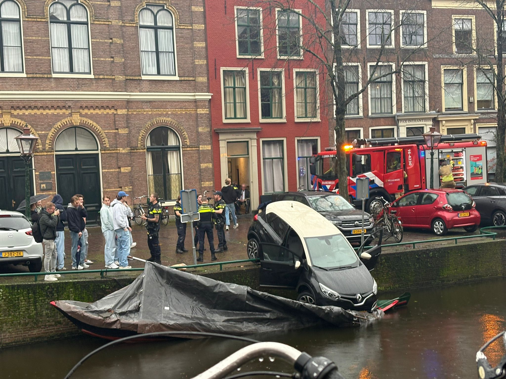 Een automobilist en zijn bijrijder zijn in Leiden vrijdagmiddag met de schrik vrijgekomen. Bij het parkeren schoot de auto door richting het water, waar het voertuig met geluk op een boot terecht kwam. De twee inzittenden zijn met behulp van omstanders uit de auto bevrijd.