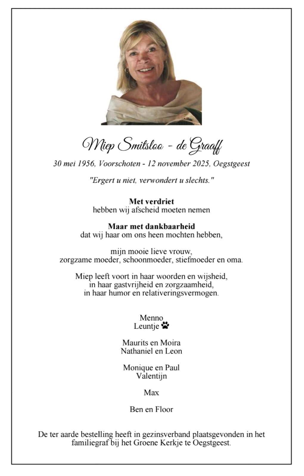 Auteur en journalist Miep Smitsloo is overleden. Haar familie laat weten dat ze op 12 november op 69 jarige leeftijd is gestorven. Samen met haar man Menno stond Miep bekend om haar veelzijdigheid zowel op het gebied van journalistiek en kunst, het openbaar bestuur en het bedrijfsleven.